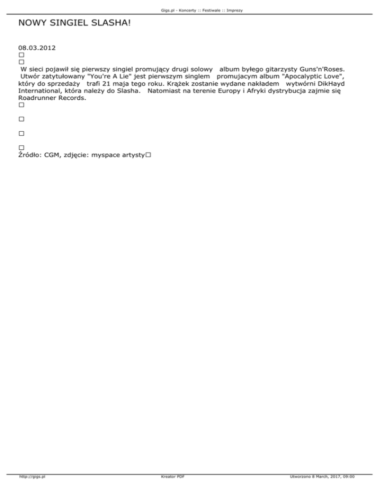 Gigs.pl - Koncerty :: Festiwale :: Imprezy NOWY SINGIEL SLASHA! 08.03.2012 W sieci pojawił się pierwszy singiel promujący drugi solowy album byłego gitarzysty Guns'n'Roses. Utwór zatytułowany "You're A Lie" jest pierwszym singlem promujacym album "Apocalyptic Love", który do sprzedaży trafi 21 maja tego roku. Krążek zostanie wydane nakładem wytwórni DikHayd International, która należy do Slasha. Natomiast na terenie Europy i Afryki dystrybucja zajmie się Roadrunner Records. Źródło: CGM, zdjęcie: myspace artysty http://gigs.pl Kreator PDF Utworzono 8 March, 2017, 09:00