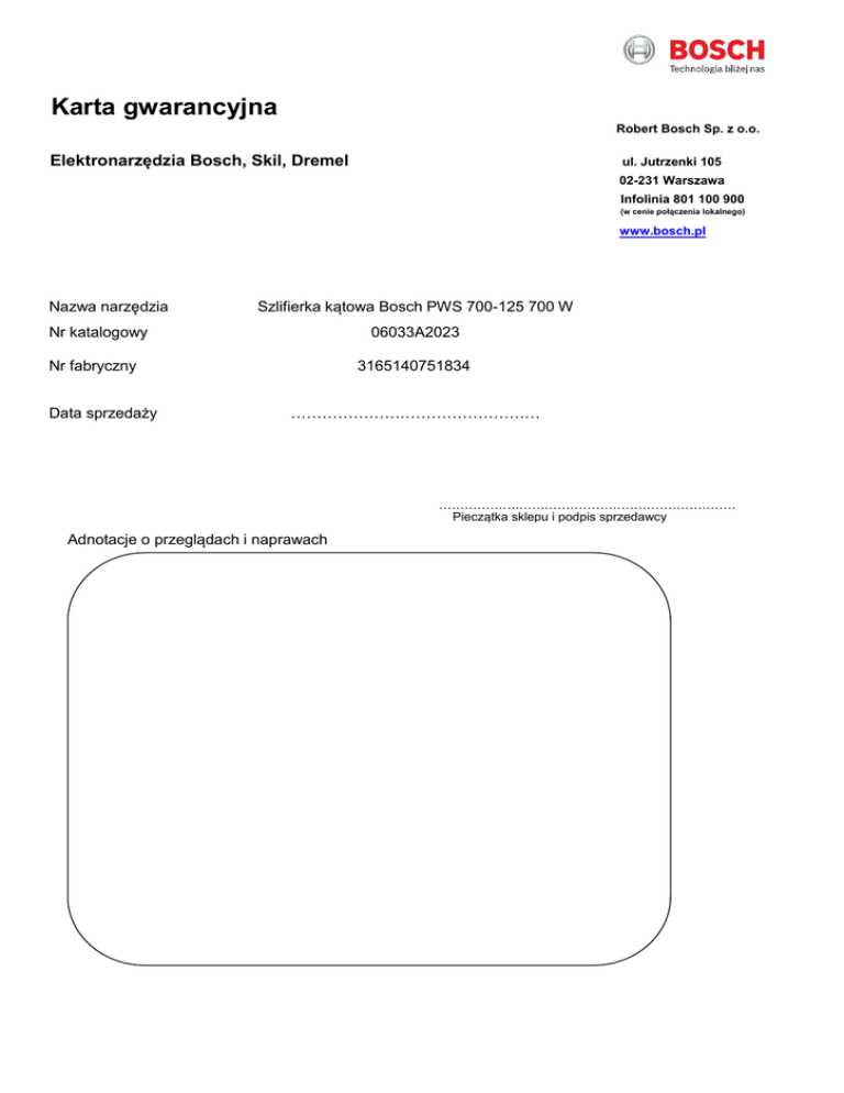 Karta gwarancyjna Robert Bosch Sp. z o.o. Elektronarzędzia Bosch, Skil, Dremel ul. Jutrzenki 105 02-231 Warszawa Infolinia 801 100 900 (w cenie połączenia lokalnego) www.bosch.pl Nazwa narzędzia Szlifierka kątowa Bosch PWS 700-125 700 W Nr katalogowy 06033A2023 Nr fabryczny Data sprzedaży 3165140751834 ………………………………………… ……………….…………………………………………… Pieczątka sklepu i podpis sprzedawcy Adnotacje o przeglądach i naprawach Elektronarzędzia oraz przyrządy pomiarowe BOSCH, wprowadzone do obrotu na terenie Polski przez Robert Bosch Sp. z o.o., ul. Jutrzenki 105, Warszawa, objęte są gwarancją producenta na następujących warunkach: WARUNKI GWARANCJI (obowiązuje od: 25.12.2014) Czas trwania gwarancji: Gwarancja udzielana jest na okres 12 miesięcy od daty zakupu w przypadku zastosowania zawodowego lub porównywalnego z zawodowym oraz na 24 miesiące od daty zakupu w przypadku zakupu i zastosowania konsumenckiego. Okres gwarancji rozpoczyna się w momencie zakupu urządzenia przez pierwszego użytkownika, przy czym decydująca jest data na oryginalnym dowodzie zakupu. Elektronarzędzia i przyrządy pomiarowe profesjonalne z linii Bosch Niebieski mogą zostać objęte rozszerzoną 36miesięczną gwarancją, pod warunkiem dokonania ich rejestracji na stronie internetowej www.boschgwarancja.pl w ciągu 30 dni od daty zakupu. Przedłużoną gwarancją nie są objęte narzędzia wysokiej częstotliwości, przemysłowe wkrętarki akumulatorowe i narzędzia pneumatyczne, standardowy osprzęt oraz akumulatory i ładowarki. Zakres ochrony gwarancyjnej: Gwarancja obejmuje wyłącznie uszkodzenia wynikające z ukrytych wad produkcyjnych lub materiałowych pod warunkiem, że: - narzędzie było użytkowane zgodnie z instrukcją obsługi i przeznaczeniem oraz odpowiednio konserwowane; stosowany był zalecany przez producenta osprzęt; - narzędzie nie było demontowane ani modyfikowane przez osoby nieupoważnione; - praca narzędziem nie była kontynuowana po wystąpieniu pierwszych objawów usterki; - nie zniszczono (usunięto) tabliczki znamionowej z numerem seryjnym narzędzia. Gwarancją nie są objęte uszkodzenia wynikające z przeciążenia narzędzia na skutek nadmiernej i/lub niewłaściwej eksploatacji. Gwarancja nie obejmuje uszkodzeń mechanicznych oraz wymiany część zużywających się w sposób naturalny, w tym szczotek węglowych, uchwytów narzędziowych, łożysk, akumulatorów, itp., o ile ich zużycie nie wynikało z ukrytych wad produkcyjnych lub materiałowych. Gwarancja obejmuje wyłącznie uprawnienie do żądania naprawy narzędzi. W szczególnych wypadkach Serwis może podjąć decyzję o wydaniu nowego urządzenia zamiast naprawy. Termin wykonania obowiązków z tytułu gwarancji wynosi 14 dni. Podstawa udzielenia gwarancji: Podstawą uznania reklamacji w ramach gwarancji jest prawidłowo wypełniona przez sprzedawcę, oficjalna karta gwarancyjna Bosch wraz z dowodem zakupu (faktura lub paragon). Karta gwarancyjna musi zawierać nazwę, numer katalogowy i seryjny urządzenia, datę sprzedaży zgodną z dowodem zakupu oraz nazwę i adres sprzedawcy (pieczęć). W przypadku przedłużonej 36-miesięcznej gwarancji na narzędzia z linii Bosch Niebieski dodatkowo wymagany jest certyfikat rejestracji narzędzia. Zgłoszenie gwarancyjne: Naprawy gwarancyjne na terenie Polski wykonywane są wyłącznie przez Centralny serwis elektronarzędzi Bosch. W przypadku stwierdzenia wady narzędzie wraz z wymienionymi wyżej dokumentami należy przekazać do punktu sprzedaży lub przesłać (na koszt i ryzyko odbiorcy) poprzez zlecenie naprawy online www.bosch-pt.pl zakładka Serwis lub https://dhl24.com.pl/serwis/bosch.html lub telefonicznie DHL EXPRESS tel.: 42 6345 345. Adres wysyłki: CENTRALNY SERWIS ELEKTRONARZĘDZI ul. Szyszkowa 35/37; 02-285 Warszawa Informacje o naprawach: email: [email protected] – wszystkie narzędzia tel.: (22) 715 44 50, fax: (22) 715 44 40 – narzędzia nadesłane tel.: (22) 715 44 56, fax: (22) 715 44 41 – narzędzia dostarczone osobiście Informacje dodatkowe: Gwarancja ta jest oferowana dodatkowo i nie ogranicza praw określonych przez obecne i przyszłe ustawy. W szczególności nie wyłącza, nie ogranicza ani nie zawiesza uprawnień wynikających z tytułu przepisów o rękojmi za wady fizyczne rzeczy. Rozszerzona 36-miesięczna gwarancja na narzędzia i przyrządy pomiarowe z linii Bosch Niebieski obowiązuje w całej Europie.