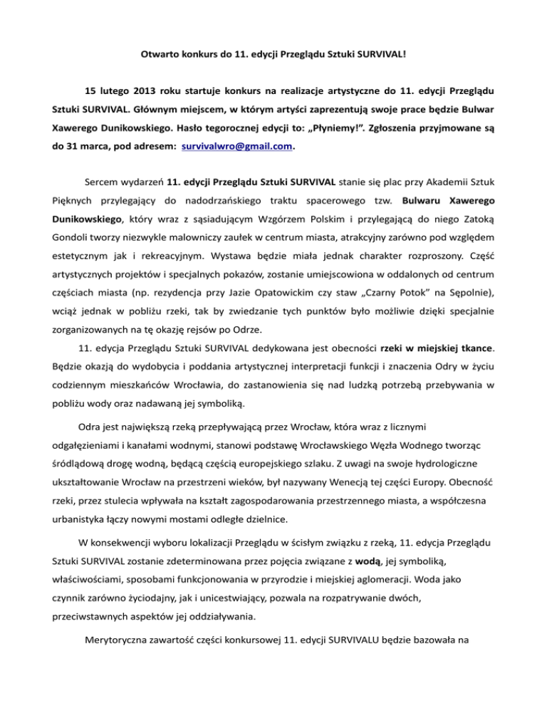 Otwarto konkurs do 11. edycji Przeglądu Sztuki SURVIVAL! 15 lutego 2013 roku startuje konkurs na realizacje artystyczne do 11. edycji Przeglądu Sztuki SURVIVAL. Głównym miejscem, w którym artyści zaprezentują swoje prace będzie Bulwar Xawerego Dunikowskiego. Hasło tegorocznej edycji to: „Płyniemy!”. Zgłoszenia przyjmowane są do 31 marca, pod adresem: [email protected]. Sercem wydarzeń 11. edycji Przeglądu Sztuki SURVIVAL stanie się plac przy Akademii Sztuk Pięknych przylegający do nadodrzańskiego traktu spacerowego tzw. Bulwaru Xawerego Dunikowskiego, który wraz z sąsiadującym Wzgórzem Polskim i przylegającą do niego Zatoką Gondoli tworzy niezwykle malowniczy zaułek w centrum miasta, atrakcyjny zarówno pod względem estetycznym jak i rekreacyjnym. Wystawa będzie miała jednak charakter rozproszony. Część artystycznych projektów i specjalnych pokazów, zostanie umiejscowiona w oddalonych od centrum częściach miasta (np. rezydencja przy Jazie Opatowickim czy staw „Czarny Potok” na Sępolnie), wciąż jednak w pobliżu rzeki, tak by zwiedzanie tych punktów było możliwie dzięki specjalnie zorganizowanych na tę okazję rejsów po Odrze. 11. edycja Przeglądu Sztuki SURVIVAL dedykowana jest obecności rzeki w miejskiej tkance. Będzie okazją do wydobycia i poddania artystycznej interpretacji funkcji i znaczenia Odry w życiu codziennym mieszkańców Wrocławia, do zastanowienia się nad ludzką potrzebą przebywania w pobliżu wody oraz nadawaną jej symboliką. Odra jest największą rzeką przepływającą przez Wrocław, która wraz z licznymi odgałęzieniami i kanałami wodnymi, stanowi podstawę Wrocławskiego Węzła Wodnego tworząc śródlądową drogę wodną, będącą częścią europejskiego szlaku. Z uwagi na swoje hydrologiczne ukształtowanie Wrocław na przestrzeni wieków, był nazywany Wenecją tej części Europy. Obecność rzeki, przez stulecia wpływała na kształt zagospodarowania przestrzennego miasta, a współczesna urbanistyka łączy nowymi mostami odległe dzielnice. W konsekwencji wyboru lokalizacji Przeglądu w ścisłym związku z rzeką, 11. edycja Przeglądu Sztuki SURVIVAL zostanie zdeterminowana przez pojęcia związane z wodą, jej symboliką, właściwościami, sposobami funkcjonowania w przyrodzie i miejskiej aglomeracji. Woda jako czynnik zarówno życiodajny, jak i unicestwiający, pozwala na rozpatrywanie dwóch, przeciwstawnych aspektów jej oddziaływania. Merytoryczna zawartość części konkursowej 11. edycji SURVIVALU będzie bazowała na uniwersalnych pojęciach dotyczących wody: jako symbolu chaosu, niestałości, zmienności, a także przeobrażania, uzdrawiania, odrodzenia ducha i ciała, witalności. Ważne, zwłaszcza w kontekście Wrocławia, będzie także poddanie artystycznej interpretacji jej niszczycielskiego aspektu, skutkującego katastrofami naturalnym, powodziami, które w istotny sposób stanowią o specyfice relacji woda-człowiek-miasto. Artyści i kuratorzy odniosą się do szeregu pojęć i zjawisk związanych z różnorodnością i wielością form wody występujących w warunkach miejskich. Woda stojąca, płynąca, mieszaniny wody i powietrza, wody i ziemi, kałuże, stawy, tamy, studnie, fontanny – każdy z jej przejawów potencjał do estetycznego odbioru, stanowiąc inspirację dla artystycznych przedsięwzięć. Hasłem przewodnim 11. edycji Przeglądu Sztuki SURVIVAL będzie zawołanie „Płyniemy!”. Jest to kwestia wypowiedziana przez jednego z bohaterów filmu „Nóż w wodzie” Romana Polańskiego – młodego chłopaka, który, trzymając się poziomego drzewca masztu, dosłownie „kroczy” po wodzie. Na wykrzyczane przez niego entuzjastyczne „Płyniemy!” siedząca wygodnie na pokładzie łodzi kobieta odpowiada: „Płynie się, aby płynąć”. Okrzyk „Płyniemy!” to wyraz afirmacji świata, jego procesualnej dynamiki, która pozwala wierzyć, że „wszystko jest możliwe”. Natomiast jego negatyw, cyniczne stwierdzenie „Płynie się, aby płynąć” wyraża zmęczenie życiem i konformistyczną postawę bohaterki. Przegląd Sztuki SURVIVAL odbywa się od 11 lat we Wrocławiu, co roku eksplorując inną przestrzeń i zagadnienia z nią związane. Artyści SURVIVALU pracowali już m.in. na wrocławskim Dworcu Głównym, w schronie przeciwlotniczym, na stadionie miejskim, w śródmiejskim parku i w dawnych koszarach radzieckich. W ramach Przeglądu prezentowano prace zarówno początkujących, jak i uznanych artystów polskiej sztuki współczesnej, wśród nich m.in. realizacje Doroty Nieznalskiej, Jerzego Kosałki, Rafała Jakubowicza czy Stanisława Dróżdża. Formularz zgłoszeniowy i wszelkie potrzebne informacje znaleźć można na stronie www.survival.art.pl. Zachęcamy do udziału w konkursie! Zgłoszenia przyjmowane są pod adresem: [email protected] do 31 marca 2013 roku. Przegląd Sztuki SURVIVAL 11 / Bulwar Xawerego Dunikowskiego, Wrocław / 21–30 czerwca 2013