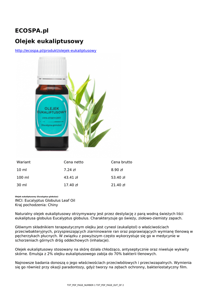 ECOSPA.pl Olejek eukaliptusowy http://ecospa.pl/produkt/olejek-eukaliptusowy Wariant Cena netto Cena brutto 10 ml 7.24 zł 8.90 zł 100 ml 43.41 zł 53.40 zł 30 ml 17.40 zł 21.40 zł Olejek eukaliptusowy (Eucalyptus globulus) INCI: Eucalyptus Globulus Leaf Oil Kraj pochodzenia: Chiny Naturalny olejek eukaliptusowy otrzymywany jest przez destylację z parą wodną świeżych liści eukaliptusa globulus Eucalyptus globulus. Charakteryzuje go świeży, ziołowo-ziemisty zapach. Głównym składnikiem terapeutycznym olejku jest cyneol (eukaliptol) o właściwościach przeciwbakteryjnych, przyspieszających ziarninowanie ran oraz poprawiających wymianę tlenową w pęcherzykach płucnych. W związku z powyższym często wykorzystuje się go w medycynie w schorzeniach górnych dróg oddechowych (inhalacje). Olejek eukaliptusowy stosowany na skórę działa chłodząco, antyseptycznie oraz niweluje wykwity skórne. Emulsja z 2% olejku eukaliptusowego zabija do 70% bakterii tlenowych. Najnowsze badania donoszą o jego właściwościach przeciwbólowych i przeciwzapalnych. Wymienia się go również przy okazji paradontozy, gdyż tworzy na zębach ochronny, bakteriostatyczny film. TXT_PDF_PAGE_NUMBER 1 TXT_PDF_PAGE_OUT_OF 2 Zastosowanie: inhalacje parowe – przy stanach grypopodobnych, oleje do masażu – w reumatyzmie, bólach mięśniowych, kremy po goleniu, depilacji, płyny do kąpieli, pasty do zębów, płyny do płukania ust. Przeciwwskazania: Chronić przed dziećmi. Nie stosować bezpośrednio na skórę w postaci nie rozcieńczonej. * naturalny składnik olejku eterycznego uwzględniony w wykazie INCI zgodnie z 7 poprawką do Dyrektywny Kosmetycznej UE TXT_PDF_PAGE_NUMBER 2 TXT_PDF_PAGE_OUT_OF 2
