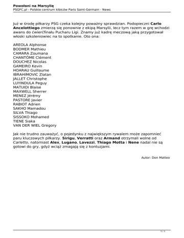 Powołani na Marsylię PSGFC.pl - Polskie centrum kibiców Paris Saint-Germain - News Już w środę piłkarzy PSG czeka kolejny poważny sprawdzian. Podopieczni Carlo Ancelottiego zmierzą się ponownie z ekipą Marsylii, lecz tym razem w grę wchodzi awans do ćwierćfinału Pucharu Ligi. Znamy już kadrę meczową jaką przygotował włoski szkoleniowiec na to spotkanie. Oto ona: AREOLA Alphonse BODMER Mathieu CAMARA Zoumana CHANTÔME Clément DOUCHEZ Nicolas GAMEIRO Kevin HOARAU Guillaume IBRAHIMOVIC Zlatan JALLET Christophe LUYINDULA Peguy MATUIDI Blaise MAXWELL Sherrer MENEZ Jérémy PASTORE Javier RABIOT Adrien SAKHO Mamadou SILVA Thiago SISSOKO Mohamed TIENE Siaka VAN DER WIEL Gregory Jak nie trudno zauważyć, o pojedynku z największym rywalem może zapomnieć paru kluczowych piłkarzy. Sirigu, Verratti oraz Armand otrzymali wolne od Carletto, natomiast Alex, Lugano, Lavezzi, Thiago Motta i Nene nadal nie są gotowi do gry, gdyż wciąż zmagają się z kontuzjami. Autor: Don Matteo 1/1 Powered by TCPDF (www.tcpdf.org)