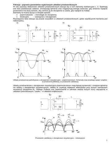 Filtracja - poprawa parametrów wyjściowych układów prostownikowych W celu poprawy właściwości układów prostownikowych stosuje się w nich elementy reaktancyjne L, C. Spełniają one dwa podstawowe zadania: zmniejszają tętnienia oraz magazynują energię wówczas, gdy zmienne napięcie prostowane ma dużą wartość, aby zwrócić ją do obciążenia w czasie, gdy napięcie to maleje. Elementy te można łączyć w dwojaki sposób: · pojemnościowe – równolegle do obciążenia, · indukcyjne – szeregowo z obciążeniem. Rozwiązania takie stosuje się przede wszystkim w układach prostownikowych, gdzie współczynnik tłumienia jest niekorzystny. a) b) D Tr i u2 C u0 odbiornik i0 u1 D1 i i0 u'2 R0 u1 u''2 D2 C u0 odbiornik Tr R0 Układy prostownicze jednofazowe z obciążeniem rezystancyjno – pojemnościowym. Schematy oraz przebiegi napięć i prądów: a) prostownik półfalowy; b) prostownik całofalowy Układy prostownikowe z obciążeniem rezystancyjno-pojemnościowym mają lepszą sprawność i mniejsze tętnienia niż układy z obciążeniem rezystancyjnym. Układy te uzyskują najlepsze właściwości przy dużych wartościach rezystancji obciążenia RO. Dlatego znalazły one zastosowanie w zakresie niezbyt dużych mocy najczęściej w układach jednofazowych, rzadko – w układach trójfazowych. i D1 L i0 u'2 u1 u0 u''2 D2 wL = 10 RO odbiornik Tr R0 wL =0 RO wL =¥ RO Prostownik całofalowy z obciążeniem rezystancyjno – indukcyjnym. 1 Układy z obciążeniem rezystancyjno-indukcyjnym to przede wszystkim układy całofalowe, ponieważ w układach jednofazowych półfalowych trudno uzyskać ciągły przepływ prądu przez obciążenie. Składowa stała napięcia wyjściowego nie zależy od indukcyjności. Ze wzrostem indukcyjności maleje natomiast współczynnik tętnień, czyli zmniejsza się udział składowych zmiennych w napięciu wyjściowym: kt = Gdy stosunek 2 × 3 1 1+ 2wL RO wL / RO wzrasta, to przebieg napięcia wyjściowego zbliża się do idealnego. Właściwości filtracyjne prostownika z obciążeniem rezystancyjno-indukcyjnym poprawiają się również ze wzrostem obciążenia (IOS wzrasta, RO maleje). Dlatego też układy te stosuje się przy dużych prądach obciążenia, głównie w wersji trójfazowej lub sześciofazowej. 2