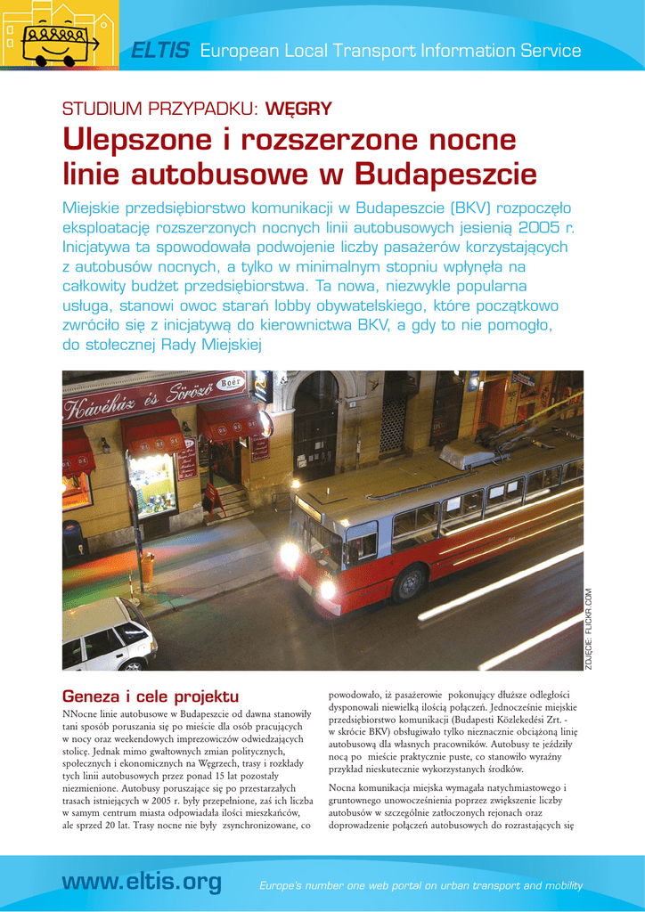 ELTIS European Local Transport Information Service STUDIUM PRZYPADKU: WĘGRY Ulepszone i rozszerzone nocne linie autobusowe w Budapeszcie ZDJĘCIE: FLICKR.COM Miejskie przedsiębiorstwo komunikacji w Budapeszcie (BKV) rozpoczęło eksploatację rozszerzonych nocnych linii autobusowych jesienią 2005 r. Inicjatywa ta spowodowała podwojenie liczby pasażerów korzystających z autobusów nocnych, a tylko w minimalnym stopniu wpłynęła na całkowity budżet przedsiębiorstwa. Ta nowa, niezwykle popularna usługa, stanowi owoc starań lobby obywatelskiego, które początkowo zwróciło się z inicjatywą do kierownictwa BKV, a gdy to nie pomogło, do stołecznej Rady Miejskiej Geneza i cele projektu NNocne linie autobusowe w Budapeszcie od dawna stanowiły tani sposób poruszania się po mieście dla osób pracujących w nocy oraz weekendowych imprezowiczów odwiedzających stolicę. Jednak mimo gwałtownych zmian politycznych, społecznych i ekonomicznych na Węgrzech, trasy i rozkłady tych linii autobusowych przez ponad 15 lat pozostały niezmienione. Autobusy poruszające się po przestarzałych trasach istniejących w 2005 r. były przepełnione, zaś ich liczba w samym centrum miasta odpowiadała ilości mieszkańców, ale sprzed 20 lat. Trasy nocne nie były zsynchronizowane, co www.eltis.org powodowało, iż pasażerowie pokonujący dłuższe odległości dysponowali niewielką ilością połączeń. Jednocześnie miejskie przedsiębiorstwo komunikacji (Budapesti Közlekedési Zrt. w skrócie BKV) obsługiwało tylko nieznacznie obciążoną linię autobusową dla własnych pracowników. Autobusy te jeździły nocą po mieście praktycznie puste, co stanowiło wyraźny przykład nieskutecznie wykorzystanych środków. Nocna komunikacja miejska wymagała natychmiastowego i gruntownego unowocześnienia poprzez zwiększenie liczby autobusów w szczególnie zatłoczonych rejonach oraz doprowadzenie połączeń autobusowych do rozrastających się Europe’s number one web portal on urban transport and mobility STUDIUM PRZYPADKU: Ulepszone i rozszerzone nocne linie autobusowe w Budapeszcie dzielnic mieszkalnych poza centrum stolicy. Jednakże pomysłodawcy wszelkie usprawnienia musiały być dostosowane do skromnego budżetu. Realizacja Lobby na rzecz usprawnienia transportu miejskiego zwane VEKE początkowo wyszło z propozycją unowocześnienia nocnych linii autobusowych i objęcia nimi praktycznie całego miasta. Autobusy poruszające się po połączonych trasach miały przyjeżdżać na przystanek prawie jednocześnie, umożliwiając pasażerom szybkie przesiadki. Zaproponowano również wprowadzenie nowego systemu numerowania autobusów nocnych opartego na liczbie 900, zgodnie z międzynarodową konwencją (ang. liczebnik nine, „dziewięć”, przypomina swym brzmieniem słowo night, „nocny”), zamiast przestarzałego symbolu É (pierwsza litera węgierskiego rzeczownika „noc”). Reforma miała polegać w dużej mierze na udostępnieniu wszystkim pasażerom firmowych autobusów BKV, co stanowiłoby niewielkie obciążenie dla budżetu. Jednak BKV przez wiele miesięcy ignorowało propozycje VEKE, nie chcąc obniżać komfortu swoich pracowników na rzecz pozostałych mieszkańców stolicy. VEKE posiada jednak stałego doradcę przy Komisji Działań Publicznych Stołecznej Rady Miejskiej, która z kolei decyduje o budżecie BKV. Lobby postanowiło więc zadziałać niejako ponad głowami upartych transportowców. Rada Miejska zgodziła się z faktem, iż nocna komunikacja autobusowa wymaga zmian, a następnie z powodzeniem zmusiła BKV do zajęcia się tą sprawą. Pomimo, że ambitny plan VEKE nie został wdrożony w całości, jego podstawowe założenia zostały zrealizowane. Rozszerzona i unowocześniona sieć komunikacji nocnej zaczęła działać dnia 1 września 2005 r., zaś kilka miesięcy później wprowadzono kolejne usprawnienia. Dziś system nocnej komunikacji autobusowej w Budapeszcie obejmuje 29 linii autobusowych i 1.585 przystanków w porównianiu do wsześniejszych 19 linii i 752 przystanków. nocnych autobusów w weekendy wzrosła z 22-24.000 do około 40.000 pasażerów w ciągu jednej nocy. Przejazdy weekendowe (tzn. w nocy z piątku na sobotę i z soboty na niedzielę) zamiast 30-32.000 pasażerów zaczęły liczyć około 56.000. Najbardziej uczęszczana linia 906 przewozi w noce weekendowe nawet do 1.000 pasażerów na godzinę na jednej trasie. Nowe linie autobusowe zapewniają amatorom budapeszteńskiego życia nocnego bezpieczne przejazdy w atmosferze pozbawionej znamion klaustrofobii. Korzysta z nich też obecnie coraz więcej mieszkańców jeżdżących do pracy na poranną zmianę. Wbrew obawom nie uległ zmianie komfort nocnych pracowników BKV dojeżdżających za darmo do pracy. Pomimo, iż przy wprowadzaniu ulepszeń BKV skorzystało w pewnym stopniu z dokładnej analizy doświadczeń swojego praskiego odpowiednika, osiągnięty wynik może posłużyć jako modelowy przykład dla innych miast. Doświadczenie BKV pokazuje, jak przedsiębiorstwo transportowe może udoskonalić swoje usługi nie nadwerężając przy tym budżetu. Najważniejsza jednak nauka płynie z tego, jak istotny udział we wprowadzaniu zmian mogą mieć sami użytkownicy sieci transportowych. BKV przyznaje dziś, że zmiany wynikły z „licznych próśb użytkowników”, jasne jest również, że konsekwentne starania VEKE odegrały tu kluczową rolę. Jedną z oczywistych mocnych stron kampanii VEKE było nawiązanie współpracy z Radą Miejską oraz fakt, iż propozycja ulepszeń opierała się nie tylko na żywym zainteresowaniu i zrozumieniu istniejących problemów, ale także na znalezieniu konkretnego i oszczędnego sposobu ich rozwiązania. Dodatkowe informacje Greg Spencer Regionalne Centrum Ekologiczne na Europę Środkową i Wschodnią Tel.: (36-30) 504-000, wew. 208 Faks: (36-30) 311-294 [email protected] Źródło: http://greenhorizon.rec.org Podsumowan