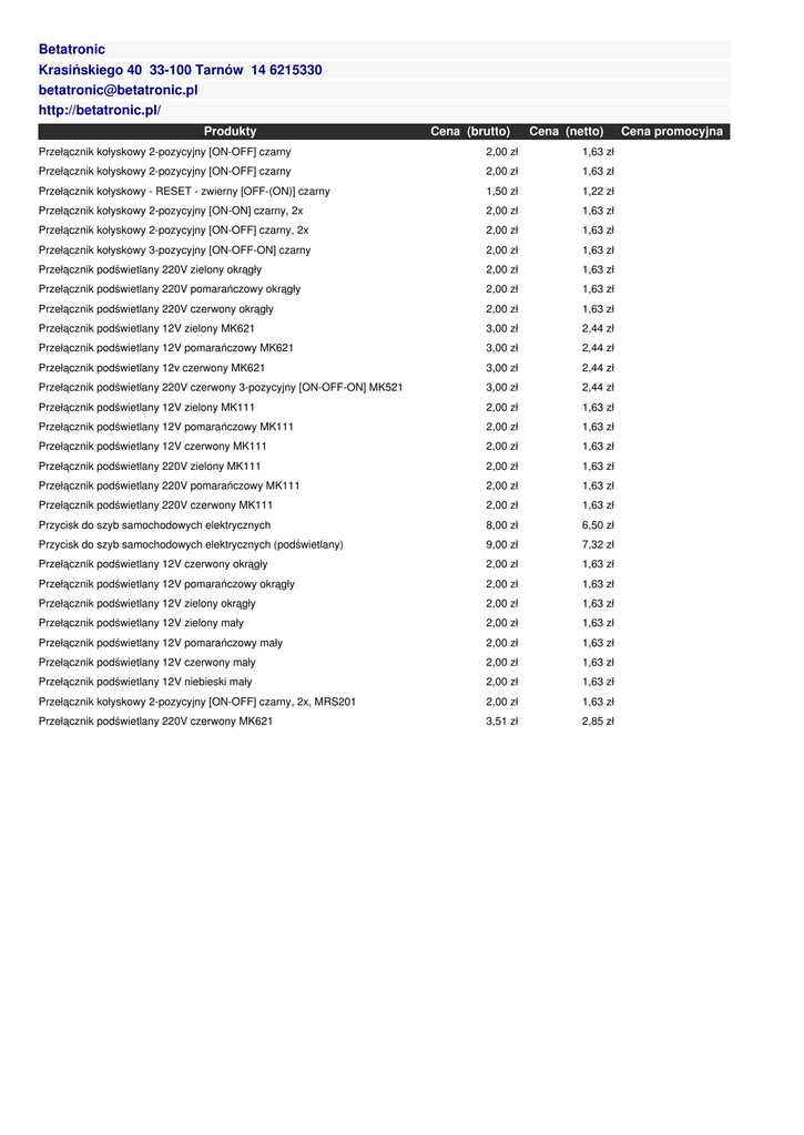 Betatronic Krasińskiego 40 33-100 Tarnów 14 6215330 [email protected] http://betatronic.pl/ Produkty Cena (brutto) Cena (netto) Przełącznik kołyskowy 2-pozycyjny [ON-OFF] czarny 2,00 zł 1,63 zł Przełącznik kołyskowy 2-pozycyjny [ON-OFF] czarny 2,00 zł 1,63 zł Przełącznik kołyskowy - RESET - zwierny [OFF-(ON)] czarny 1,50 zł 1,22 zł Przełącznik kołyskowy 2-pozycyjny [ON-ON] czarny, 2x 2,00 zł 1,63 zł Przełącznik kołyskowy 2-pozycyjny [ON-OFF] czarny, 2x 2,00 zł 1,63 zł Przełącznik kołyskowy 3-pozycyjny [ON-OFF-ON] czarny 2,00 zł 1,63 zł Przełącznik podświetlany 220V zielony okrągły 2,00 zł 1,63 zł Przełącznik podświetlany 220V pomarańczowy okrągły 2,00 zł 1,63 zł Przełącznik podświetlany 220V czerwony okrągły 2,00 zł 1,63 zł Przełącznik podświetlany 12V zielony MK621 3,00 zł 2,44 zł Przełącznik podświetlany 12V pomarańczowy MK621 3,00 zł 2,44 zł Przełącznik podświetlany 12v czerwony MK621 3,00 zł 2,44 zł Przełącznik podświetlany 220V czerwony 3-pozycyjny [ON-OFF-ON] MK521 3,00 zł 2,44 zł Przełącznik podświetlany 12V zielony MK111 2,00 zł 1,63 zł Przełącznik podświetlany 12V pomarańczowy MK111 2,00 zł 1,63 zł Przełącznik podświetlany 12V czerwony MK111 2,00 zł 1,63 zł Przełącznik podświetlany 220V zielony MK111 2,00 zł 1,63 zł Przełącznik podświetlany 220V pomarańczowy MK111 2,00 zł 1,63 zł Przełącznik podświetlany 220V czerwony MK111 2,00 zł 1,63 zł Przycisk do szyb samochodowych elektrycznych 8,00 zł 6,50 zł Przycisk do szyb samochodowych elektrycznych (podświetlany) 9,00 zł 7,32 zł Przełącznik podświetlany 12V czerwony okrągły 2,00 zł 1,63 zł Przełącznik podświetlany 12V pomarańczowy okrągły 2,00 zł 1,63 zł Przełącznik podświetlany 12V zielony okrągły 2,00 zł 1,63 zł Przełącznik podświetlany 12V zielony mały 2,00 zł 1,63 zł Przełącznik podświetlany 12V pomarańczowy mały 2,00 zł 1,63 zł Przełącznik podświetlany 12V czerwony mały 2,00 zł 1,63 zł Przełącznik podświetlany 12V niebieski mały 2,00 zł 1,63 zł Przełącznik kołyskowy 2-pozycyjny [ON-OFF] czarny, 2x, MRS201 2,00 zł 1,63 zł Przełącznik podświetlany 220V czerwony MK621 3,51 zł 2,85 zł Cena promocyjna