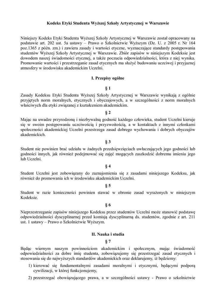 Kodeks Etyki Studenta Wyższej Szkoły Artystycznej w Warszawie Niniejszy Kodeks Etyki Studenta Wyższej Szkoły Artystycznej w Warszawie został opracowany na podstawie art. 202 ust. 5a ustawy – Prawo o Szkolnictwie Wyższym (Dz. U. z 2005 r. Nr 164 poz.1365 z późn. zm.) i zawiera zasady i wartości etyczne, wyznaczające standardy postępowania studentów Wyższej Szkoły Artystycznej w Warszawie. Zbiór zapisów w niniejszym Kodeksie jest dowodem naszej świadomości etycznej, a także poczucia odpowiedzialności, która z niej wynika. Promowanie wartości i przestrzeganie zasad etycznych ma służyć budowaniu uczciwej i przyjaznej atmosfery w środowisku akademickim Uczelni. I. Przepisy ogólne §1 Zasady Kodeksu Etyki Studenta Wyższej Szkoły Artystycznej w Warszawie wynikają z ogólnie przyjętych norm moralnych, etycznych i obyczajowych, a w szczególności z norm moralnych właściwych dla etyki związanej z kształceniem akademickim. §2 Mając na uwadze przyrodzoną i niezbywalną godność każdego człowieka, student Uczelni kieruje się w swoim postępowaniu uczciwością i przyzwoitością, a w kontaktach z innymi członkami społeczności akademickiej Uczelni przestrzega zasad dobrego wychowania i dobrych obyczajów akademickich. §3 Student nie powinien brać udziału w żadnych przedsięwzięciach uwłaczających jego godności lub godności innych, jak również podejmować się zajęć mogących zaszkodzić dobremu imieniu jego lub Uczelni. §4 Student Uczelni jest zobowiązany do zaznajomienia się z zasadami niniejszego Kodeksu, jak również do promowania ich w środowisku akademickim Uczelni. §5 Student w razie konieczności powinien stawać w obronie zasad wyrażonych w niniejszym Kodeksie. §6 Nieprzestrzeganie zapisów niniejszego Kodeksu przez studentów Uczelni może stanowić podstawę odpowiedzialności dyscyplinarnej przed komisją dyscyplinarną ds. studentów, zgodnie z art. 211 ust. 1 ustawy – Prawo o Szkolnictwie Wyższym. II. Nauka i studia §7 Będąc wiernym naszym powinnościom akademickim i społecznym, mając świadomość odpowiedzialności za dobre imię studenta, zobowiązujemy się przestrzegać zasad etycznych i stosowania się do najwyższych standardów akademickich oraz deklarujemy, iż będziemy: 1) kierować się fundamentalnymi zasadami moralnymi i etycznymi, będącymi podporą cywilizacji, w której funkcjonujemy, 2) przestrzegać obowiązującego prawa, a w szczególności ustawy - Prawo o szkolnictwie wyższym i innych aktów obowiązujących w Uczelni, prawnych powszechnie obowiązującego prawa oraz 3) nieustannie i uczciwie dążyć do samodoskonalenia, zdobywania wiedzy oraz nowych umiejętności, 4) wykorzystywać zdobytą w Uczelni wiedzę i umiejętności zgodnie z przepisami prawa oraz zasadami etyki, 5) wspierać pozostałych studentów Uczelni w ich dążeniu do poszerzania wiedzy i umiejętności, 6) zdobytą wiedzę wykorzystywać dla dobra kraju, 7) korzystać z wolności słowa z poszanowaniem zasad rzetelnej i merytorycznej dyskusji, 8) postępować zgodnie z treścią złożonego przez nas ślubowania, a w szczególności: a) wytrwale dążyć do rozwoju własnej osobowości, b) szanować prawa i zwyczaje akademickie, c) dbać o godność i honor studenta, 9) uczciwie i rzetelnie wywiązywać się z naszych obowiązków, a w szczególności: a) uczciwie uzyskiwać zaliczenia przedmiotów oraz przygotowywać prace zaliczeniowe i dyplomowe, z poszanowaniem praw autorskich, b) wypełniać zobowiązania wobec Uczelni z poszanowaniem wyznaczonych terminów. III. Stosunek do pracowników §8 Student traktuje pracowników uczelni z należnym im szacunkiem, przestrzegając w kontaktach z nimi zasad dobrego wychowania i obyczajów akademickich. §9 Student nie wykorzystuje prywatnych kontaktów i zażyłości osobistych z pracownikami Uczelni. § 10 Student powinien w sposób adekwatny reagować na wszelkie przejawy zachowań nieetycznych pracowników Uczelni. Przy zachowaniach stanowiących przekroczenie obowiązujących norm prawnych powinien również powiadomić władze Uczelni. IV. Stosunek do studentów § 11 Student traktuje innych studentów z szacunkiem. We wzajemnych kontaktach pozostaje uprzejmy i życzliwy. § 12 Student stara się wspierać innych studentów w nauce, pomagać w dostosowywaniu się do warunków życia akademickiego, jak również w poznaniu i przestrzeganiu reguł panujących w Uczelni. § 13 Student powinien w sposób adekwatny reagować na wszelkie przejawy zachowań nieetycznych innych studentów Uczelni. § 14 Student nie dyskryminuje innych studentów, w szczególności ze względu na kolor skóry, wyznanie, narodowość, przekonania polityczne czy orientację seksualną. § 15 Student powstrzymuje się od wszelkich zachowań nieetycznych w stosunku do innych studentów, w szczególności takich, które mają na celu wyrządzenie komuś szkody. V. Stosunek do uczelni § 16 Student dba o dobre imię Uczelni i godnie ją reprezentuje, także poza jej murami. § 17 Student stara się uczestniczyć w ważnych dla społeczności akademickiej wydarzeniach. W miarę możliwości powinien także aktywnie włączyć się w ich organizację. § 18 Student współdziała z osobami związanymi z Uczelnią w celu ulepszania jej funkcjonowania, w szczególności czyni to poprzez uczestnictwo w inicjatywach wspierających rozwój Uczelni, jak również przez udział w organizacjach studenckich. Wspiera działalność Rady Samorządu Studentów Uczelni jako głównego reprezentanta jego interesów oraz przedstawicieli studentów w innych organach Uczelni, zwraca się do nich we wszystkich kwestiach spornych wymagających współdziałania z władzami Uczelni. § 19 Student także po ukończeniu studiów zobowiązany jest, świadcząc swoim poziomem moralnym i intelektualnym, dbać o dobre imię Uczelni. § 20 Niniejszy Kodeks wchodzi w życie z dniem 1 października 2012 r. po przyjęciu stosownej 