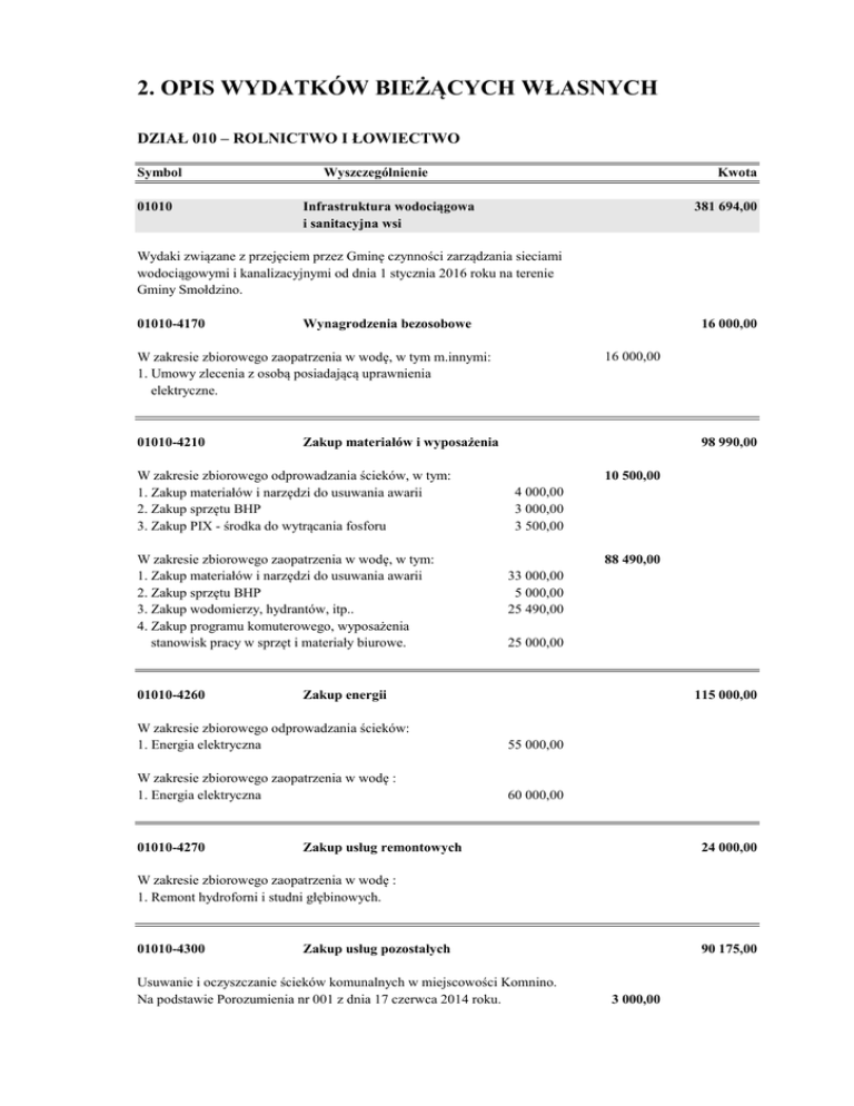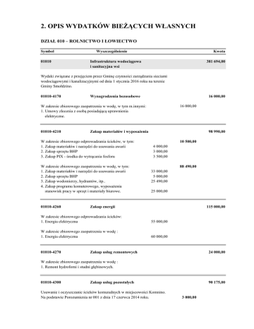 2. OPIS WYDATKÓW BIEŻĄCYCH WŁASNYCH DZIAŁ 010 – ROLNICTWO I ŁOWIECTWO Symbol 01010 Wyszczególnienie Kwota 381 694,00 Infrastruktura wodociągowa i sanitacyjna wsi Wydaki związane z przejęciem przez Gminę czynności zarządzania sieciami wodociągowymi i kanalizacyjnymi od dnia 1 stycznia 2016 roku na terenie Gminy Smołdzino. 01010-4170 16 000,00 Wynagrodzenia bezosobowe 16 000,00 W zakresie zbiorowego zaopatrzenia w wodę, w tym m.innymi: 1. Umowy zlecenia z osobą posiadającą uprawnienia elektryczne. 01010-4210 Zakup materiałów i wyposażenia W zakresie zbiorowego odprowadzania ścieków, w tym: 1. Zakup materiałów i narzędzi do usuwania awarii 2. Zakup sprzętu BHP 3. Zakup PIX - środka do wytrącania fosforu W zakresie zbiorowego zaopatrzenia w wodę, w tym: 1. Zakup materiałów i narzędzi do usuwania awarii 2. Zakup sprzętu BHP 3. Zakup wodomierzy, hydrantów, itp.. 4. Zakup programu komuterowego, wyposażenia stanowisk pracy w sprzęt i materiały biurowe. 01010-4260 98 990,00 10 500,00 4 000,00 3 000,00 3 500,00 88 490,00 33 000,00 5 000,00 25 490,00 25 000,00 Zakup energii 115 000,00 W zakresie zbiorowego odprowadzania ścieków: 1. Energia elektryczna 55 000,00 W zakresie zbiorowego zaopatrzenia w wodę : 1. Energia elektryczna 60 000,00 01010-4270 Zakup usług remontowych 24 000,00 W zakresie zbiorowego zaopatrzenia w wodę : 1. Remont hydroforni i studni głębinowych. 01010-4300 Zakup usług pozostałych Usuwanie i oczyszczanie ścieków komunalnych w miejscowości Komnino. Na podstawie Porozumienia nr 001 z dnia 17 czerwca 2014 roku. 90 175,00 3 000,00 W zakresie zbiorowego odprowadzania ścieków, w tym: 1. Usługi WUKO i elektryczne w związku z awariami. 2. Gospodarka odpadami - wywóz osadu, skratki, piaskownika. 3. Naprawy pomp i silników. 4. Wywóz nieczystości Komnino, Żelazo, Gardna Mała. W zakresie zbiorowego zaopatrzenia w wodę, w tym : 1. Usługi transportowe. 2. Dozór techniczny. 3. Naprawa pomp i silnków. 01010-4390 67 675,00 12 000,00 8 175,00 10 000,00 37 500,00 19 500,00 3 000,00 1 500,00 15 000,00 Zakup usług obejmujących wykonanie ekspertyz, analiz i opinii W zakresie zbiorowego odprowadzania ścieków, w tym: 1. Badania ścieków. 2 500,00 W zakresie zbiorowego zaopatrzenia w wodę, w tym : 1. Badanie wody. 5 000,00 01010-4430 7 500,00 5 029,00 Różne opłaty i składki Zgodnie z obowiązującymi taryfami za wodę i odbiór ścieków oraz opłaty abonamentowej hydrantowej - wydatek realizowany w cyklach miesięcznych na konto Zakładu Usług wodnych w Słupsku. Wg wyliczenia: stawka abonamentowa x 163 szt. hydrantów. Opłata za m-c grudzień 2015 rok. 529,00 W zakresie zbiorowego odprowadzania ścieków, w tym: 1. Ubezpieczenie. 2 500,00 W zakresie zbiorowego zaopatrzenia w wodę, w tym : 1. Ubezpieczenie. 2 000,00 01010-4510 W zakresie zbiorowego odprowadzania ścieków, w tym: 1. Opłata dot. ochrony środowiska. W zakresie zbiorowego zaopatrzenia w wodę, w tym : 1. Opłata dot. ochrony środowiska. 01010-4530 18 000,00 Opłaty na rzecz budżetu państwa 4 000,00 14 000,00 Podatek od towarów i usług (VAT) W zakresie zbiorowego odprowadzania ścieków, w tym: Podatek od towarów i usług (VAT). Przy założeniu: miesięczna wartość podatu VAT od sprzedaży opodatkowanej wynosi 889,97 zł, zabezpieczenie na dwa miesiące, do chwili możliwości odliczenia VAT od zakupów. 7 000,00 2 000,00 W zakresie zbiorowego zaopatrzenia w wodę, w tym: Podatek od towarów i usług (VAT). Przy założeniu: miesięczna wartość podatu VAT od sprzedaży opodatkowanej wynosi 4.876,39 zł, zabezpieczenie na dwa miesiące, do chwili możliwości odliczenia VAT od zakupów. 5 000,00 01030 Izby rolnicze 6 703,00 01030-2850 Wpłaty gmin na rzecz izb rolniczych w wysokości 2% uzyskanych wpływów z podatku rolnego 6 703,00 Planowane wpływy z tytułu podatku rolnego 335 120 6 702,40 X 2% = 01095 Pozostała działalność 0,00 01095-4210 Zakup materiałów i wyposażenia 0,00 Zakup poradnika dla rolników. 388 397,00 OGÓŁEM DZIAŁ 010 –ROLNICTWO I ŁOWIECTWO DZIAŁ 600 - TRANSPORT I ŁĄCZNOŚĆ Symbol Wyszczególnienie 60016 Drogi publiczne gminne 60016-4210 Zakup materiałów i wyposażenia Kwota 30 000,00 2 000,00 Zakup drogowskazów. 60016-4270 Zakup usług remontowych 10 000,00 Uzupełnienie nawierzchni – bieżące usuwanie uszkodzeń, bieżące utrzymanie dróg. 60016-4300 Orzeczenia techniczne (np.. w sprawie mostu). Dostęp do programu cmentarnego (księga weczysta, księga kwater) 60016-4430 8 000,00 Zakup usług pozostałych Różne opłaty i składki 5 000,00 3 000,00 10 000,00 Opłata składki OC dróg gminnych. Opłaty za zajęcie pasa drogowego dla Zarządu Dróg Powiatowych. 60095 Pozostała działalność 3 500,00 60095-2320 Dotacje celowe przekazane dla powiatu na zadania bieżące realizowane na podstawie porozumień (umów) między jednostkami samorządu terytorialnego 3 500,00 Pomoc finansowa w wysokości 3.500,-zł na opracowanie aktualizacji: "Planu zrównoważonego rozwoju publicznego transportu zbiorowego dla Powiatu Słupskiego" (planu transportowego) wraz z koncepcją organizacji i funkcjonowania publicznego transportu zbiorowego w powiecie słupskim. W związku z podjęciem przez Radę Gminy Smołdzino Uchwały Nr XV/94/2015 z dnia 27 października 2015 roku w sprawie wyrażenia woli zawarcia umowy partnerskiej pomiędzy Gminą Smołdzino a Powiatem Słupskim. OGÓŁEM DZIAŁ 600 - TRANSPORT I ŁĄCZNOŚĆ 33 500,00 DZIAŁ 630 – TURYSTYKA Symbol Wyszczególnienie 63003 Zadania w zakresie upowszechniania turystyki 63003-2820 Dotacja celowa z budżetu na finansowanie lub dofinansowanie zadań zleconych do realizacji stowarzyszeniom Kwota 19 411,00 9 000,00 Zadanie zlecone do realizacji organizacjom pozarządowych i podmiotom prowadzącym działalność pożytku publicznego, w formie: 1) powierzania wykonywania zadania publicznego wraz z udzieleniem dotacji na finansowanie lub dofinansowanie jego realizacji,