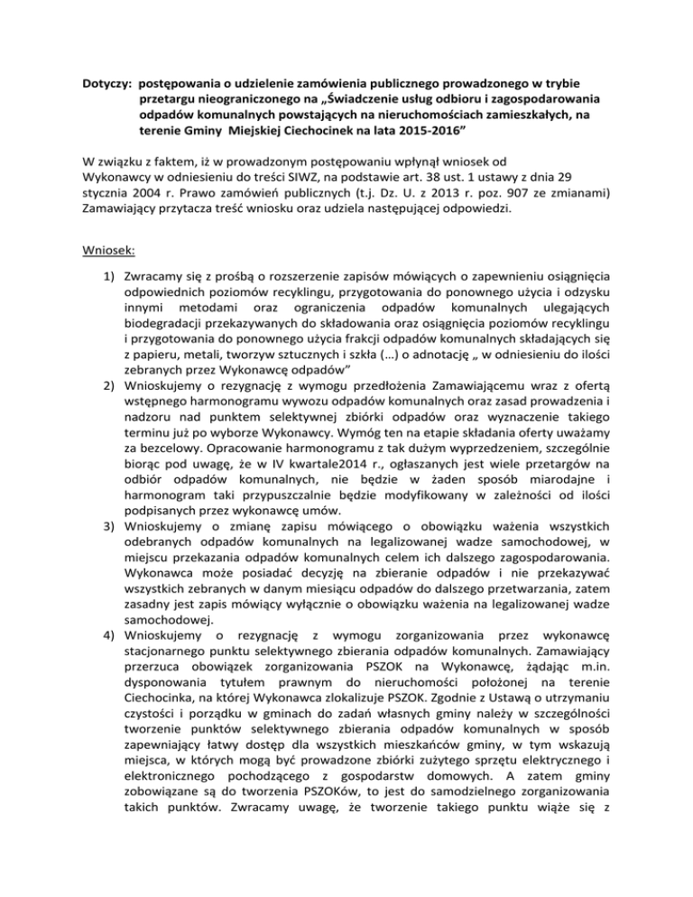 Dotyczy: postępowania o udzielenie zamówienia publicznego prowadzonego w trybie przetargu nieograniczonego na „Świadczenie usług odbioru i zagospodarowania odpadów komunalnych powstających na nieruchomościach zamieszkałych, na terenie Gminy Miejskiej Ciechocinek na lata 2015-2016” W związku z faktem, iż w prowadzonym postępowaniu wpłynął wniosek od Wykonawcy w odniesieniu do treści SIWZ, na podstawie art. 38 ust. 1 ustawy z dnia 29 stycznia 2004 r. Prawo zamówień publicznych (t.j. Dz. U. z 2013 r. poz. 907 ze zmianami) Zamawiający przytacza treść wniosku oraz udziela następującej odpowiedzi. Wniosek: 1) Zwracamy się z prośbą o rozszerzenie zapisów mówiących o zapewnieniu osiągnięcia odpowiednich poziomów recyklingu, przygotowania do ponownego użycia i odzysku innymi metodami oraz ograniczenia odpadów komunalnych ulegających biodegradacji przekazywanych do składowania oraz osiągnięcia poziomów recyklingu i przygotowania do ponownego użycia frakcji odpadów komunalnych składających się z papieru, metali, tworzyw sztucznych i szkła (…) o adnotację „ w odniesieniu do ilości zebranych przez Wykonawcę odpadów” 2) Wnioskujemy o rezygnację z wymogu przedłożenia Zamawiającemu wraz z ofertą wstępnego harmonogramu wywozu odpadów komunalnych oraz zasad prowadzenia i nadzoru nad punktem selektywnej zbiórki odpadów oraz wyznaczenie takiego terminu już po wyborze Wykonawcy. Wymóg ten na etapie składania oferty uważamy za bezcelowy. Opracowanie harmonogramu z tak dużym wyprzedzeniem, szczególnie biorąc pod uwagę, że w IV kwartale2014 r., ogłaszanych jest wiele przetargów na odbiór odpadów komunalnych, nie będzie w żaden sposób miarodajne i harmonogram taki przypuszczalnie będzie modyfikowany w zależności od ilości podpisanych przez wykonawcę umów. 3) Wnioskujemy o zmianę zapisu mówiącego o obowiązku ważenia wszystkich odebranych odpadów komunalnych na legalizowanej wadze samochodowej, w miejscu przekazania odpadów komunalnych celem ich dalszego zagospodarowania. Wykonawca może posiadać decyzję na zbieranie odpadów i nie przekazywać wszystkich zebranych w danym miesiącu odpadów do dalszego przetwarzania, zatem zasadny jest zapis mówiący wyłącznie o obowiązku ważenia na legalizowanej wadze samochodowej. 4) Wnioskujemy o rezygnację z wymogu zorganizowania przez wykonawcę stacjonarnego punktu selektywnego zbierania odpadów komunalnych. Zamawiający przerzuca obowiązek zorganizowania PSZOK na Wykonawcę, żądając m.in. dysponowania tytułem prawnym do nieruchomości położonej na terenie Ciechocinka, na której Wykonawca zlokalizuje PSZOK. Zgodnie z Ustawą o utrzymaniu czystości i porządku w gminach do zadań własnych gminy należy w szczególności tworzenie punktów selektywnego zbierania odpadów komunalnych w sposób zapewniający łatwy dostęp dla wszystkich mieszkańców gminy, w tym wskazują miejsca, w których mogą być prowadzone zbiórki zużytego sprzętu elektrycznego i elektronicznego pochodzącego z gospodarstw domowych. A zatem gminy zobowiązane są do tworzenia PSZOKów, to jest do samodzielnego zorganizowania takich punktów. Zwracamy uwagę, że tworzenie takiego punktu wiąże się z uzyskaniem odpowiednich, wymaganych prawem zezwoleń i decyzji, co w znacznym stopniu może wydłużyć czas na utworzenie takiego punktu nawet do 6 miesięcy. W przypadku stacjonarnego PSZOKa wymagane może być uzyskanie decyzji o środowiskowych uwarunkowaniach w rozumieniu Ustawy z dnia 3 października 2008 r. o udostępnianiu informacji o środowisku i jego ochronie, udziale społeczeństwa w ochronie środowiska oraz ocenach oddziaływania na środowisko. Ponadto utworzenie stacjonarnego PSZOK powinno być zgodne z Miejscowym Planem Zagospodarowania Przestrzennego 5) Wnioskujemy o zmianę wymagań w zakresie spełnienia warunków posiadania wiedzy i doświadczenia. Prosimy o możliwość wykazania wymaganych tonaży rocznych dla kilku/kilkunastu usług wykonywanych w ciągu ostatnich trzech lat. Odpowiedź Ad. 1. Nie istnieje potrzeba zmiany zapisu SIWZ dotyczącym osiągnięcia poziomów recyklingu poprzez zapis zgodnie z którym te poziomy byłyby określane w odniesieniu do ilości zebranych przez Wykonawcę odpadów. Wynika to z zasady logiki, ponieważ nałożone w SIWZ zobowiązanie na Wykonawcę w zakresie osiągniecia poziomu recyklingu może odnosić się wyłącznie do ilości odpadów zebranych przez Wykonawcę. Ad. 2. Zamawiający uważa za konieczne ustalenie aby Wykonawca przedłożył wraz z ofertą zasady prowadzenia PSZOK , ponieważ umożliwi to już na tym etapie kontrole czy wykonawca w sposób prawidłowy przygotowuje ofertę w tym zakresie. Zamawiający nie przychyla się do wniosku. Zapisy SIWZ Zamawiający pozostawi bez zmian. Ad. 3. Obowiązek ważenia odpadów komunalnych na legalizowanej wadze w miejscu przekazania odpadów komunalnych jest konieczne chociażby z uwagi na możliwość kontroli czy określone odpady są przewożone do właściwego miejsca. Taki zapis nie uniemożliwia Wykonawcy zbierania określonych grup odpadów w celu wykorzystania komercyjnego . Zamawiający nie przychyla się do wniosku. Zapisy SIWZ Zamawiający pozostawi bez zmian Ad. 4. Organizacja i prowadzenie PSZOK stanowi istotny element systemu odbioru odpadów komunalnych od właścicieli nieruchomości zamieszkałych położonych na terenie Gminy Ciechocinek. Zgodnie z regulaminem utrzymania czystości i porządku na terenie Gminy Miejskiej Ciechocinek oraz Ustawą o utrzymaniu czystości i porządku w gminach (Dz. U. z 2013 r. poz. 1399, ze zmianami) gminy tworzą punkty selektywnego zbierania odpadów komunalnych w sposób zapewniający łatwy dostęp dla wszystkich mieszkańców gminy (...). W związku z powyższym Zamawiający wskazał organizację i prowadzenie PSZOK jako element przedmiotu zamówienia i nie przychyla się do wniosku . Ad.5 Zamawiający nie przychyla się 