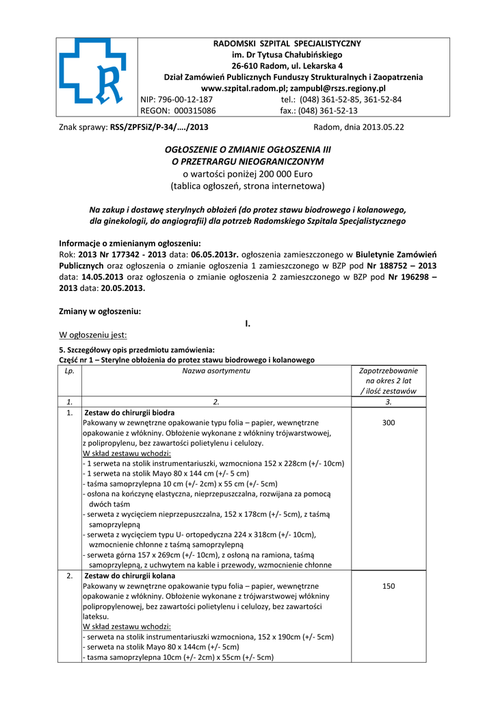 RADOMSKI SZPITAL SPECJALISTYCZNY im. Dr Tytusa Chałubińskiego 26-610 Radom, ul. Lekarska 4 Dział Zamówień Publicznych Funduszy Strukturalnych i Zaopatrzenia www.szpital.radom.pl; [email protected] NIP: 796-00-12-187 tel.: (048) 361-52-85, 361-52-84 REGON: 000315086 fax.: (048) 361-52-13 Znak sprawy: RSS/ZPFSiZ/P-34/…./2013 Radom, dnia 2013.05.22 OGŁOSZENIE O ZMIANIE OGŁOSZENIA III O PRZETRARGU NIEOGRANICZONYM o wartości poniżej 200 000 Euro (tablica ogłoszeń, strona internetowa) Na zakup i dostawę sterylnych obłożeń (do protez stawu biodrowego i kolanowego, dla ginekologii, do angiografii) dla potrzeb Radomskiego Szpitala Specjalistycznego Informacje o zmienianym ogłoszeniu: Rok: 2013 Nr 177342 - 2013 data: 06.05.2013r. ogłoszenia zamieszczonego w Biuletynie Zamówień Publicznych oraz ogłoszenia o zmianie ogłoszenia 1 zamieszczonego w BZP pod Nr 188752 – 2013 data: 14.05.2013 oraz ogłoszenia o zmianie ogłoszenia 2 zamieszczonego w BZP pod Nr 196298 – 2013 data: 20.05.2013. Zmiany w ogłoszeniu: I. W ogłoszeniu jest: 5. Szczegółowy opis przedmiotu zamówienia: Część nr 1 – Sterylne obłożenia do protez stawu biodrowego i kolanowego Lp. Nazwa asortymentu 1. 1. 2. 2. Zestaw do chirurgii biodra Pakowany w zewnętrzne opakowanie typu folia – papier, wewnętrzne opakowanie z włókniny. Obłożenie wykonane z włókniny trójwarstwowej, z polipropylenu, bez zawartości polietylenu i celulozy. W skład zestawu wchodzi: - 1 serweta na stolik instrumentariuszki, wzmocniona 152 x 228cm (+/- 10cm) - 1 serweta na stolik Mayo 80 x 144 cm (+/- 5 cm) - taśma samoprzylepna 10 cm (+/- 2cm) x 55 cm (+/- 5cm) - osłona na kończynę elastyczna, nieprzepuszczalna, rozwijana za pomocą dwóch taśm - serweta z wycięciem nieprzepuszczalna, 152 x 178cm (+/- 5cm), z taśmą samoprzylepną - serweta z wycięciem typu U- ortopedyczna 224 x 318cm (+/- 10cm), wzmocnienie chłonne z taśmą samoprzylepną - serweta górna 157 x 269cm (+/- 10cm), z osłoną na ramiona, taśmą samoprzylepną, z uchwytem na kable i przewody, wzmocnienie chłonne Zestaw do chirurgii kolana Pakowany w zewnętrzne opakowanie typu folia – papier, wewnętrzne opakowanie z włókniny. Obłożenie wykonane z trójwarstwowej włókniny polipropylenowej, bez zawartości polietylenu i celulozy, bez zawartości lateksu. W skład zestawu wchodzi: - serweta na stolik instrumentariuszki wzmocniona, 152 x 190cm (+/- 5cm) - serweta na stolik Mayo 80 x 144cm (+/- 5cm) - tasma samoprzylepna 10cm (+/- 2cm) x 55cm (+/- 5cm) Zapotrzebowanie na okres 2 lat / ilość zestawów 3. 300 150 - elastyczna, nieprzepuszczalna osłona na kończynę rozwijana za pomocą dwóch taśm - serweta na kończynę 274 x 315cm (+/- 15cm), z otworem elastycznym (bez zawartości lateksu) 6 cm (+/- 2cm), z osłonami na ramiona, z uchwytami na kable i przewody, wzmocnienie chłonne Część nr 2 – Bielizna jednorazowa do operacji laparoskopowych Lp. Nazwa asortymentu 1. 1. 2. 3. 4. 5. 2. Kieszeń na narzędzia laparoskopowe wykonana z mocnego, przezroczystego polietylenu (folii PE ) o wymiarach 24,5cm x 47cm. Kieszenie powinny posiadać 2 warstwy kleju umożliwiającego zamocowanie kieszeni w dowolnym miejscu obłożenia, serwety czy fartucha. Zastosowany klej hypoalergiczny, akrylowy, repozycjonalny - co pozwala na wielokrotne przyklejanie i odklejanie bez ryzyka uszkodzenia kieszeni i materiału, do którego jest przyklejana. Kieszeń na gaziki - jednodziałowa wykonana z przezroczystego polietylenu (folii PE) o wymiarach 33cm x 38cm służy do przechowywania narzędzi chirurgicznych, wacików, gazików itp. podczas zabiegu chirurgicznego. Zastosowany klej hypoalergiczny, akrylowy, repozycjonalny - co pozwala na wielokrotne przyklejanie i odklejanie bez ryzyka uszkodzenia kieszeni i materiału, do którego jest przyklejana. Kieszeń posiada w górnej części sztywnik umożliwiający wygięcie kieszeni. Osłona na kamerę - Serweta na przewód kamery lasera służąca do sterylnego zabezpieczenia przewodu kamery lasera i zachowania jego sterylności podczas całego zabiegu operacyjnego. Wykonana z przezroczystego polietylenu (folii PE) w rozmiarze: 250cm x 13cm. Serweta na końcu wyposażona jest w elastyczne zakończenie z otworem i taśmą do umocowania wokół kamery. Osłony ginekologiczne na kończyny Osłony ginekologiczne pakowane po 2 szt. wykonane z materiału z włókien sztucznych (polipropylen/polietylen) bez zawartości włókien wiskozowych i celulozowych (dwuwarstwowy laminat). Materiał niepylacy, chłonny, absorpcyjny na całej powierzchni. Wymiary: 114cm x 75cm. Gramatura materiału min. 60g/m2 Organizator przewodów o wymiarach 13,3cm x 3,8cm jest białym przylepcem z ruchomą częścią w środkowej części umożliwiającą swobodne wielokrotne przyklejanie i odklejanie. Organizator pozwala na przyklejenie do obłożenia, serwety czy fartucha itp. drenów, kabli i przewodów. Organizator może być przyklejony do każdego typu materiału, z którego wykonywane są obłożenia, fartuchy czy serwety operacyjne. Zastosowany klej akrylowy, repozycjonowalny – co pozwala na wielokrotne przyklejanie i odklejanie bez ryzyka uszkodzenia organizatora i materiału, do którego jest przyklejany. Część nr 3 – Bielizna jednorazowa do operacji cięcia cesarskiego Lp. Nazwa asortymentu 1. 1. 2. Zestaw do cięcia cesarskiego z folią bakteriobójczą: Zestaw do cięcia w składzie: obłożenie do cięcia cesarskiego o wymiarach 254cm x 307cm posiadające w polu operacyjnym folię chirurgiczną (folia wykonana z poliestru o grubości 0,025mm o działaniu bakteriobójczym posiadająca w warstwie klejącej jodofor) o wymiarach 30cm x 30cm. Obłożenie posiada zbiornik na płyny 360 stopni wokół pola operacyjnego z usztywnionym brzegiem wykonanym z polipropylenu oraz dwoma organizatorami przewodów (w każdym 4 otwory na przewody). Obłożenie zintegowane z ekranem anestezjologicznym - serweta na stolik instrumentariuszki 2