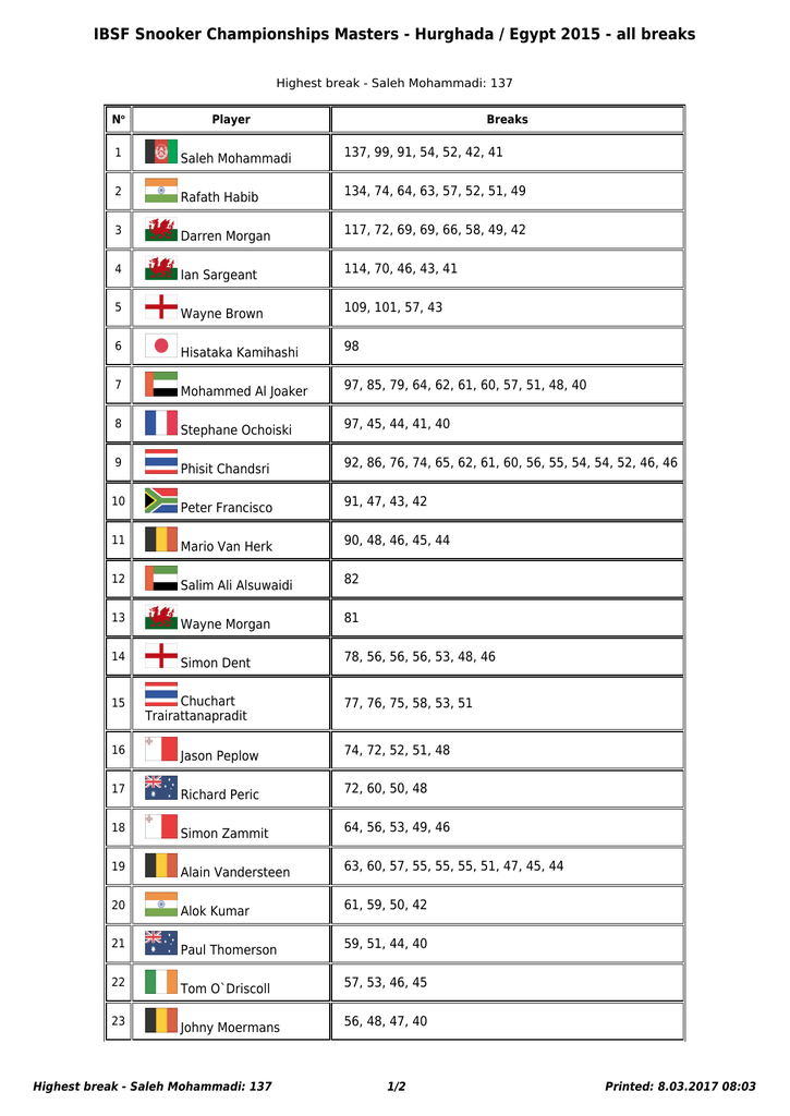 IBSF Snooker Championships Masters - Hurghada / Egypt 2015 - all breaks Highest break - Saleh Mohammadi: 137 No Player Breaks 1 Saleh Mohammadi 137, 99, 91, 54, 52, 42, 41 2 Rafath Habib 134, 74, 64, 63, 57, 52, 51, 49 3 Darren Morgan 117, 72, 69, 69, 66, 58, 49, 42 4 Ian Sargeant 114, 70, 46, 43, 41 5 Wayne Brown 109, 101, 57, 43 6 Hisataka Kamihashi 98 7 Mohammed Al Joaker 97, 85, 79, 64, 62, 61, 60, 57, 51, 48, 40 8 Stephane Ochoiski 97, 45, 44, 41, 40 9 Phisit Chandsri 92, 86, 76, 74, 65, 62, 61, 60, 56, 55, 54, 54, 52, 46, 46 10 Peter Francisco 91, 47, 43, 42 11 Mario Van Herk 90, 48, 46, 45, 44 12 Salim Ali Alsuwaidi 82 13 Wayne Morgan 81 14 Simon Dent 78, 56, 56, 56, 53, 48, 46 15 Chuchart Trairattanapradit 77, 76, 75, 58, 53, 51 16 Jason Peplow 74, 72, 52, 51, 48 17 Richard Peric 72, 60, 50, 48 18 Simon Zammit 64, 56, 53, 49, 46 19 Alain Vandersteen 63, 60, 57, 55, 55, 55, 51, 47, 45, 44 20 Alok Kumar 61, 59, 50, 42 21 Paul Thomerson 59, 51, 44, 40 22 Tom O`Driscoll 57, 53, 46, 45 23 Johny Moermans 56, 48, 47, 40 Highest break - Saleh Mohammadi: 137 1/2 Printed: 8.03.2017 08:03 IBSF Snooker Championships Masters - Hurghada / Egypt 2015 - all breaks No Player 24 Igshaan Stanfield 55 25 Wael Talaat 55 26 Mohamed Essam 51 27 Maged Shafik 51 28 Joy Mehra 51 29 Ivan Attard 51 30 Walid Hamdy 50, 46 31 Munier Cassim 50, 40 32 Graham Beardmore 49, 48, 43 33 Eissa Ali Al Hashmi 49 34 Jon Perring 48, 48, 44, 41 35 Daniel Poly 48 36 Alen Matic 47 37 Stuart Duncan 46 Highest break - Saleh Mohammadi: 137 Breaks 2/2 Printed: 8.03.2017 08:03