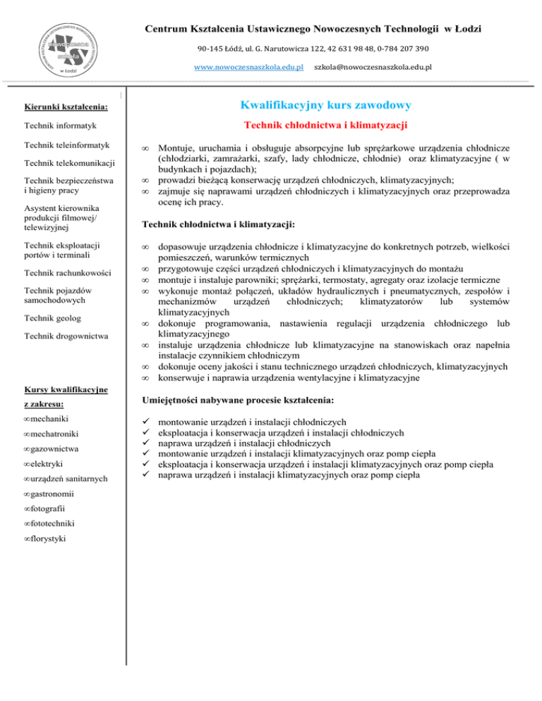 Centrum Kształcenia Ustawicznego Nowoczesnych Technologii w Łodzi 90-145 Łódź, ul. G. Narutowicza 122, 42 631 98 48, 0-784 207 390 www.nowoczesnaszkola.edu.pl Kwalifikacyjny kurs zawodowy Kierunki kształcenia: Technik chłodnictwa i klimatyzacji Technik informatyk Technik teleinformatyk • Technik telekomunikacji Montuje, uruchamia i obsługuje absorpcyjne lub sprężarkowe urządzenia chłodnicze (chłodziarki, zamrażarki, szafy, lady chłodnicze, chłodnie) oraz klimatyzacyjne ( w budynkach i pojazdach); prowadzi bieżącą konserwację urządzeń chłodniczych, klimatyzacyjnych; zajmuje się naprawami urządzeń chłodniczych i klimatyzacyjnych oraz przeprowadza ocenę ich pracy. Technik bezpieczeństwa i higieny pracy • • Asystent kierownika produkcji filmowej/ telewizyjnej Technik chłodnictwa i klimatyzacji: Technik eksploatacji portów i terminali Technik rachunkowości Technik pojazdów samochodowych Technik geolog Technik drogownictwa [email protected] • • • • • • • • dopasowuje urządzenia chłodnicze i klimatyzacyjne do konkretnych potrzeb, wielkości pomieszczeń, warunków termicznych przygotowuje części urządzeń chłodniczych i klimatyzacyjnych do montażu montuje i instaluje parowniki; sprężarki, termostaty, agregaty oraz izolacje termiczne wykonuje montaż połączeń, układów hydraulicznych i pneumatycznych, zespołów i mechanizmów urządzeń chłodniczych; klimatyzatorów lub systemów klimatyzacyjnych dokonuje programowania, nastawienia regulacji urządzenia chłodniczego lub klimatyzacyjnego instaluje urządzenia chłodnicze lub klimatyzacyjne na stanowiskach oraz napełnia instalacje czynnikiem chłodniczym dokonuje oceny jakości i stanu technicznego urządzeń chłodniczych, klimatyzacyjnych konserwuje i naprawia urządzenia wentylacyjne i klimatyzacyjne Kursy kwalifikacyjne z zakresu: • mechaniki • mechatroniki • gazownictwa • elektryki • urządzeń sanitarnych • gastronomii • fotografii • fototechniki • florystyki Umiejętności nabywane procesie kształcenia: montowanie urządzeń i instalacji chłodniczych eksploatacja i konserwacja urządzeń i instalacji chłodniczych naprawa urządzeń i instalacji chłodniczych montowanie urządzeń i instalacji klimatyzacyjnych oraz pomp ciepła eksploatacja i konserwacja urządzeń i instalacji klimatyzacyjnych oraz pomp ciepła naprawa urządzeń i instalacji klimatyzacyjnych oraz pomp ciepła