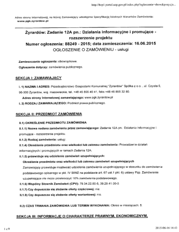 h申/伽pl.portal.uzp.govpllindcxpilP90gloszenle=Show&PozycJa AdresstronyinternetOWej.naktdrejZamawiajaCYudostepn−aSpeCy航acjeIstotnychWarunkewZamdw−enia: WWW,pgk,Zyrardow.pl Zyrardew:Zadanie12Apn”:DziaねniainformacyJnelPromuJaCe− rozszerzenieprojektu NumerogJoszenia‥88249−2015;datazamieszczenia:16”06°2015 0GLOSZENIEOZAMOwIENiU−uSlugi Zamieszc乙anieogloszenia:ObowiaZkowe Ogloszeniedotyczy:ZamdwieniapublICZnegO SEKCJAl:ZAMAWIAJACY i,1)NAZWA−ADRES:Przeds−eblOrStWOGospodarklKomunainej1−ZyrardOwIiSp撮az00,ulCzysta5・ 96−300Zyrarddw.woj mazowieCkie.teI・+48468554041−faks+48468553280 AdresstronyinternetOWejzamawiajacego:WPgkzyrardow・Pi l.2)ROD乙AJZAMAWIAJACEGO:PodmiOtPraWaPUbiicznego・ SEKCJAil:PRZEDMiOTZAMOWIENIA 11.1)OKRESLENIEPRZEDM一〇TUZAMO…ENiA ii.1,1)Nazwanadana乙am6wieniuprzezzamawiajalCego:Zadanie12Apn・iDzIala川a一nfomacyJnei PrOmuJaCe−rOZSZerZeniePrOJektu Il.1.2)Rodzaj乙ambwienia:uSiugi lI.1,4〉OkreSlenieprzNidmiotuorazwielkoScilubzakresuzam6wienia:Prowadzeniedziaはh lnformacyinyChlPrOmuJaCyChwramachZadania12A・ li.1.5〉przewidujesieudzieleniezamewie uzupeIniajacych: OkreSienieprzedmiotu°raZWieIkoScilubzakresuzamewieIiuzupe油ajacych ZamawlaJaCyPrZeWidujemoZIMOSCudzIelenlaZambwieniauzupe回ajacegowstosunkudozamewlenia podstawowegoopiSanegOWPktiVSiWZnapodstawieart67ustlpkt6)ustaWPzp ZamOwienie uzupeInlajaceniemoZeprzekrOC2y510%zamdvheniaPOdstawowego Il工6)WspdinySわWnikZamewieh(CPV):793422・00−5,39・294100−O Il.1.7)Czydopuszc乙aSiezloZenieofertyczeSciowej:nIe l1.1.8)Czydopuszczasiezねえenieofeltywariantowej:nie li,2)CZASTRWANIAZAMOwIENIALUBTERMINVWKONANIA:OkreswmieSlaCaCh5 SEKCJA冊INFORMACJEOCHARAKTERZEPRAWNYM,EKONOMICZNYM, l z9 2015−06−1614i43 http://bzpl.portal.uzp.gov.pl/Index.phP?ogloszenie=Show&pozyqa. FINANSOVWMITECHNICZNYM 111,1)WADIUM informacjanatematwadium:1WysokoSewadium KazdyWkonawcazobowiaZanyjestzabezpieCZye SWaOfertewadiumWWySOkoScl:5000.00zl(SIownie pieetySiecyzlotych)2Formawadiuml)Wadium diazamewieniamOZebyCwnieSlCneWnaStePujacychformach:a)pienladzu,b)Por CZeniachbankowych iubporeczemaChspOldzieIcze」kasyoszczednoSciOWO−kredytoweJIZtymZeporeczeniekasyJeStZaWSZe POreCZeniempienieznym,C)gwarancJaChbankowych;d)gwarancJaChubezpleCZeniOWyCh;e) POreCZenIaChudzIeianychprzezpodmIOty,Okterychmowawart6bust・5pkt2ustawyzdnia9iistopada 2000rokuoutworzeniuPoiskiejAgencJiRozwoJuPrzedsIebiorczoScI(Dz U z2007r Nr42,POZ275,Z POZn zm)2)WprzypadkuskladamaPrZeZWykonawcewadiumwformiegwarancji,gWaranCjapowinna byesporzadzonazgodnieZObowlaZuJaCymPraWemIWinnaZaWleraCnastepujaceeIementyia)nazwe dajacegozIeceme(Wykonawcy),BenefiCjentagWaranqi(Zamawiajacego),gWaranta(bankuiubinstytucji UdzielajacychgwarancjI)orazwskazanIeIChsiedzib.b)okreSlenieWierZyteInoScI,ktOramabye ZabezpleCZOnagWaranCialC)kwotくigWaranCj主d)terminwaznoScigwaranqiie)zobowIaZaniegWarantado ZaPiaceniakwotygwaranqinaPierWSZePisemnezadanieZamawiaJaCegOZaWIeraJaCeOSwiadczenIe,iZ Wykonawca,ktOreg00fe鴫Wγbrano一〇dmbwllpodpiSaniaUmowynawarunkachokreSionychwofercIe, Iub−nieWnIOs†zabezpleCZenIanaiezytegowykonaniaUmowy,iub−ZaWarCieUmowystaIosienlemcZllWeZ PrZyCZyniezacychpostronleWykonawcy・3)PostanowienIaPOWyZSZemaJaZaStOSOWanierOwnieZdo POreCZeh il1.2)ZALICZKi li1.3)WARUNKIUDZIALUWPOSTEPOWANIUORAZOPiSSPOSOBUDOKONYWANIAOCENY SPELNIANiATYCHWARUNKOw ilI.3.1)UprawnieniadowykonywaniaokreSionejdziaiainoSciiubczynnoSci,je圭eiiprzepisy prawanakJadajaobowiazekichposiadania OpissposobudokonywaniaocenyspelIlianiategowarunku Niedotyczy lli,3.2)WiedzaidoSwiadczenie Opissposobudok°nyWaniaocenyspeJnialliategowarunku OudzIeie用eZamdwIeniapubilCZnegOmOgaubiegaesieWykonawcyspemiaiaCyWarunek dotyczacyposiadanianIeZbednejWIedzyidoSwiadczenIa WszczegbinoSciWykonawcamusi SPeInIaenaStePujacywarunek(WPrZyPadkuwspdlnegoubIeganiaSiedwbchiubwieCej Wykonawc(5woudzleIenien而ejszegozambwienia,OCenianebedalacznIelChkwalifIkacJel doSwiadczenie)・−WykonaeznaiezytastarannoSciaWOkresieostatniChtrzechIatprzeddniem WSZCZeCianinieJSZegOPOStePOWania,aJeZeiiOk「esprowadzeniadzIaはinoScIJeStkretszywtym OkresIe.COnaJmnieJJednaus山ge,ktdre」PrZedmiotembyIoprowadzeniedzialahinformacyInyChi PrOmuJaCyChdiazadahinwestycyJnyChzzakresugospodarkiwodn0−5clekoweJOWartOScime 2Z9 2015−06−161443 h哩:/化zpLPOrtaLuzp・gOV・Pi/indexphp?ogloszenic=Show・&pozyga… mnieJSZeJnIZ200tys zl(b「utto)WceiupotwierdzemaSPe油anIaniniejszegowarunku WykonawcyzobowlaZanisaprzediozyCwykazwykonanychusIugwykonanychwokresle3lat PrZedupIywemterminuskiadaniaofeh,a」eZeIiOkresprowadzemadziaIaInoScijestkrOtszy−W tymokresie,WraZZPOdaniemIChrodzajuIWartOScl,datyimIejSCaWykonaniaorazdowody OkreSiajace,CZyuS仙giteZOStaiywykonanewsposObnalezyty.Dowodami,Oktbrychmowa POWyZeJSaPOSw−adczeniaIubinnedokumenty−jeZeIIZuZaSadnionychprzyczyn00biektywnym Cha「akterzeWykonawcanleJeStWStanieuZySkaCpoSwIadczenIaiWykonawca,Wykazu」aC SPelnlanIeWarunkdw,mOZepoiegaCnawiedzyldoSwIadczenlu,OSObachzd0lnychdowykonanIa ZamOwienialubzdoInoSciaChfinanSOWyChIubekonomiCZnyChinnyChpodmiotOw申ieZaiezmeOd CharakteruprawnegClaczacychgoznimistos…kew・WykonawcawtakiejsytuaqiZObowIaZany JeStudowodnieZamawIaJaCemu,iZbedziedysponowaizasobamlnieZbednymIdorealizacji ZamOwienla−WSZCZegOinoScIPrZedstawIaJaCWtymCeiupiSemneZObowiaZanietyChpodmlOtOw dooddaniamudodyspozyqInieZbednychzasobOwnaokreskorzystanIaZniChprzy WykonywanIuZamOwienia.0cenaspe柚aniaWW Warunkuudzialuwpostepowaniudokonana ZOStaniezgodnieZformuiaspehia−nieSPe油a lII“3.3)Potencjaltechniczny Opissposobudokonywaniaocenyspeinianiategowarunku Niedotyczy 川.3,4)Osobyzdoinedowykonaniazamewienia OpissposobudokonywaniaocenyspeInianiategowarunku OudzIeIenieZamOwleniaPubiicznegomogaubiegaeSieWykonawcyspehIa」aCynaStePuIaCy Warunek(WPrZyPadkuwspOInegoubIeganiaSiedwdchIubwIeCeJWykonawcdwoudzleIenie niniejszegozambwienia一〇CenianebedaIacznieiChkwalIflkacjeidoSwradczenIe)−do uczestniCZeniaWWykonanlunInieJSZegOZambwIenjawskazaCosoby,ktdrebedauczestniCZyeW Wykonywaniu