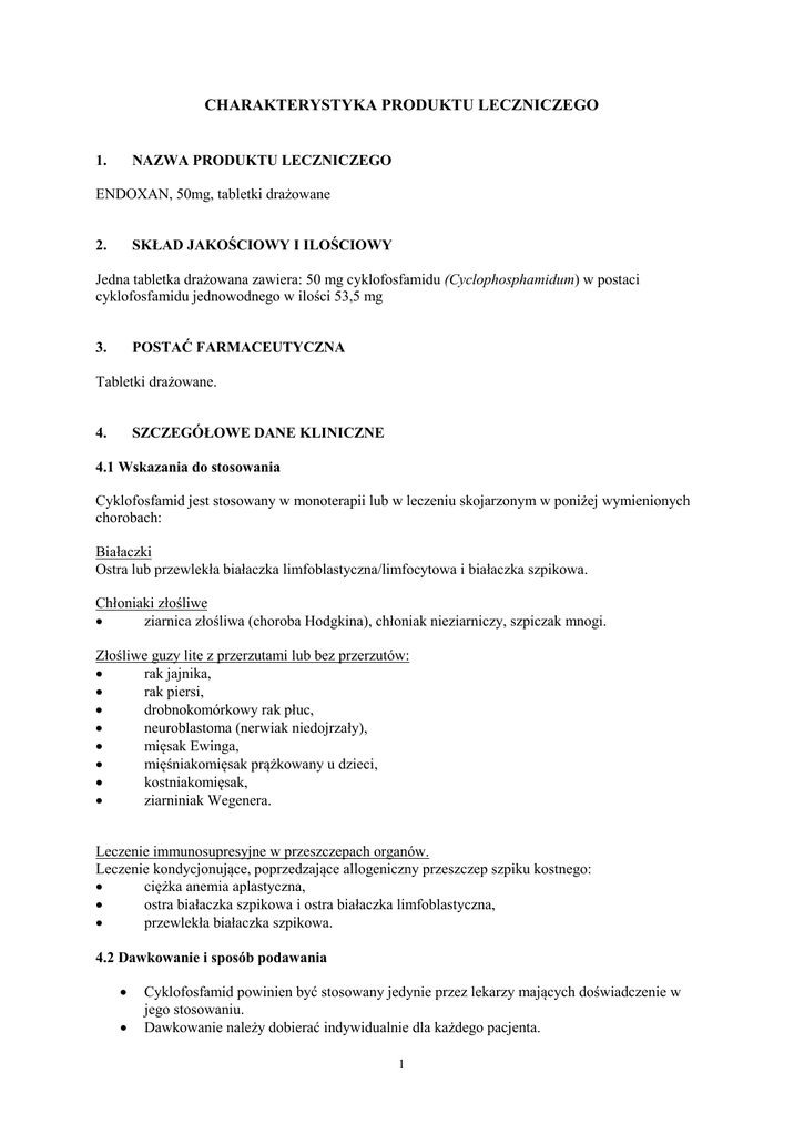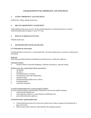 CHARAKTERYSTYKA PRODUKTU LECZNICZEGO 1. NAZWA PRODUKTU LECZNICZEGO ENDOXAN, 50mg, tabletki drażowane SKŁAD JAKOŚCIOWY I ILOŚCIOWY 2. Jedna tabletka drażowana zawiera: 50 mg cyklofosfamidu (Cyclophosphamidum) w postaci cyklofosfamidu jednowodnego w ilości 53,5 mg POSTAĆ FARMACEUTYCZNA 3. Tabletki drażowane. SZCZEGÓŁOWE DANE KLINICZNE 4. 4.1 Wskazania do stosowania Cyklofosfamid jest stosowany w monoterapii lub w leczeniu skojarzonym w poniżej wymienionych chorobach: Białaczki Ostra lub przewlekła białaczka limfoblastyczna/limfocytowa i białaczka szpikowa. Chłoniaki złośliwe • ziarnica złośliwa (choroba Hodgkina), chłoniak nieziarniczy, szpiczak mnogi. Złośliwe guzy lite z przerzutami lub bez przerzutów: • rak jajnika, • rak piersi, • drobnokomórkowy rak płuc, • neuroblastoma (nerwiak niedojrzały), • mięsak Ewinga, • mięśniakomięsak prążkowany u dzieci, • kostniakomięsak, • ziarniniak Wegenera. Leczenie immunosupresyjne w przeszczepach organów. Leczenie kondycjonujące, poprzedzające allogeniczny przeszczep szpiku kostnego: • ciężka anemia aplastyczna, • ostra białaczka szpikowa i ostra białaczka limfoblastyczna, • przewlekła białaczka szpikowa. 4.2 Dawkowanie i sposób podawania • • Cyklofosfamid powinien być stosowany jedynie przez lekarzy mających doświadczenie w jego stosowaniu. Dawkowanie należy dobierać indywidualnie dla każdego pacjenta. 1 • Dawki i czas trwania leczenia i (lub) przerwy w leczeniu zależą od wskazania terapeutycznego, schematu terapii skojarzonej, ogólnego stanu zdrowia pacjenta i funkcjonowania narządów, a także od wyników kontrolnych badań laboratoryjnych (zwłaszcza monitorowania komórek krwi). W leczeniu skojarzonym z innymi lekami cytostatycznymi o podobnej toksyczności może być konieczne zredukowanie dawki lub wydłużenie odstępów pomiędzy kolejnymi cyklami leczenia. Dzięki zastosowaniu czynników stymulujących hematopoezę (czynnik wzrostu kolonii i czynniki stymulujące erytropoezę) można zmniejszyć ryzyko powikłań mielosupresyjnych i (lub) ułatwić dostarczenie zamierzonej dawki. W celu zmniejszenia ryzyka toksycznego działania na drogi moczowe w trakcie lub niezwłocznie po podaniu, należy podać odpowiednią ilość płynów doustnie lub w postaci infuzji w celu wymuszenia diurezy. Dlatego cyklofosfamid powinien być podawany rano. Patrz punkt 4.4. Pacjenci z zaburzeniami wątroby Ciężkie zaburzenie czynności wątroby może wiązać się ze zmniejszoną aktywacją cyklofosfamidu. Może to wpłynąć na skuteczność leczenia cyklofosfamidem i powinno być wzięte pod uwagę przy doborze dawki i interpretacji odpowiedzi pacjenta na zastosowaną dawkę produktu leczniczego. Pacjenci z zaburzeniami czynności nerek U pacjentów z zaburzeniami czynności nerek, zwłaszcza u pacjentów z ciężkimi zaburzeniami czynności nerek, w wyniku zmniejszonego wydalania przez nerki może dojść do zwiększenia stężenia cyklofosfamidu i jego metabolitów w osoczu. Może to powodować zwiększoną toksyczność i powinno być wzięte pod uwagę przy ustalaniu dawkowania u tych pacjentów. Cyklofosfamid i jego metabolity podlegają dializie, chociaż mogą występować różnice w oczyszczaniu zależnie od użytego systemu do dializy. U pacjentów wymagających dializy należy rozważyć zapewnienie stałych odstępów pomiędzy podawaniem cyklofosfamidu i dializą. Patrz punkt 4.4. Osoby w podeszłym wieku U pacjentów w podeszłym wieku, podczas monitorowania działań toksycznych i dostosowania dawki należy uwzględnić częstsze w tej populacji zaburzenia czynności wątroby, nerek, serca lub innych narządów oraz jednocześnie występujące choroby i inne stosowane leki. 4.3 Przeciwwskazania Cyklofosfamid jest przeciwwskazany u pacjentów z: • nadwrażliwością na cyklofosfamid, na którykolwiek z jego metabolitów lub na jakikolwiek inny składnik leku; • obturacją odpływu moczu. Stosowanie w okresie ciąży i okresie karmienia piersią, patrz punkt 4.6. 4.4 Specjalne ostrzeżenia i środki ostrożności dotyczące stosowania Czynniki ryzyka wystąpienia efektów toksycznych cyklofosfamidu i ich następstw podane poniżej i w innych punktach mogą stanowić przeciwwskazania, jeśli cyklofosfamid nie jest stosowany w leczeniu stanu zagrażającego życiu. W takich przypadkach konieczna jest indywidualna ocena ryzyka i spodziewanych korzyści. 2 OSTRZEŻENIA Mielosupresja, immunosupresja, zakażenia • Leczenie cyklofosfamidem może wywoływać mielosupresję i znaczące zahamowanie odpowiedzi immunologicznej. • Mielosupresja wywołana przez cyklofosfamid może powodować leukopenię, neutropenię, trombocytopenię (związaną ze zwiększonym ryzykiem krwotoków) i anemię. • Ciężka immunosupresja prowadziła do ciężkich zakażeń, czasem prowadzących do zgonu. Zgłaszano także występowanie sepsy i wstrząsu septycznego. Do zakażeń zgłaszanych w związku ze stosowaniem cyklofosfamidu należą zapalenia płuc, a także zakażenia bakteryjne, grzybicze, wirusowe, pierwotniakowe i pasożytnicze. • Zakażenia utajone mogą być reaktywowane. Ponowne uaktywnienie zakażeń zgłaszano dla różnych zakażeń bakteryjnych, grzybiczych, wirusowych, pierwotniakowych i pasożytniczych. • W przypadku zakażeń należy wdrożyć odpowiednie leczenie. • W niektórych przypadkach neutropenii może być wskazana profilaktyka przeciw drobnoustrojom według oceny lekarza prowadzącego. • W przypadku wystąpienia gorączki neutropenicznej konieczne jest podawanie antybiotyków i (lub) leków przeciwgrzybiczych. • Cyklofosfamid należy stosować ze szczególną ostrożnością, jeśli w ogóle, u pacjentów z ciężkim zaburzeniem czynności szpiku kostnego i u pacjentów z ciężką immunosupresją. • O ile nie jest to bezwzględnie konieczne, cyklofosfamidu nie należy stosować u pacjentów z liczbą leukocytów mniejszą niż 2 500 komórek