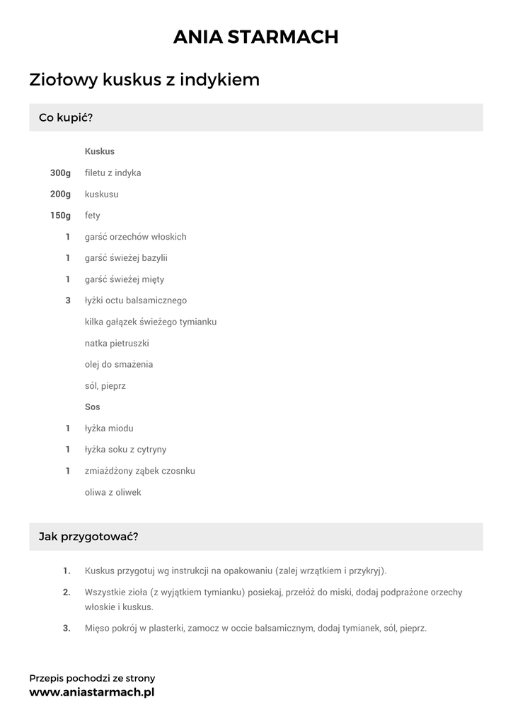 ANIA STARMACH Ziołowy kuskus z indykiem Co kupić? Kuskus 300g filetu z indyka 200g kuskusu 150g fety 1 garść orzechów włoskich 1 garść świeżej bazylii 1 garść świeżej mięty 3 łyżki octu balsamicznego kilka gałązek świeżego tymianku natka pietruszki olej do smażenia sól, pieprz Sos 1 łyżka miodu 1 łyżka soku z cytryny 1 zmiażdżony ząbek czosnku oliwa z oliwek Jak przygotować? 1. Kuskus przygotuj wg instrukcji na opakowaniu (zalej wrzątkiem i przykryj). 2. Wszystkie zioła (z wyjątkiem tymianku) posiekaj, przełóż do miski, dodaj podprażone orzechy włoskie i kuskus. 3. Mięso pokrój w plasterki, zamocz w occie balsamicznym, dodaj tymianek, sól, pieprz. Przepis pochodzi ze strony www.aniastarmach.pl ANIA STARMACH 4. Na patelnię wlej odrobinę oleju, smaż mięso przez kilka minut. 5. Wszystkie składniki sosu wymieszaj, dodaj do kuskusu. 6. Kuskus przekładaj do miseczek, tuż przed podaniem dodaj pokruszoną fetę. Przepis pochodzi ze strony www.aniastarmach.pl