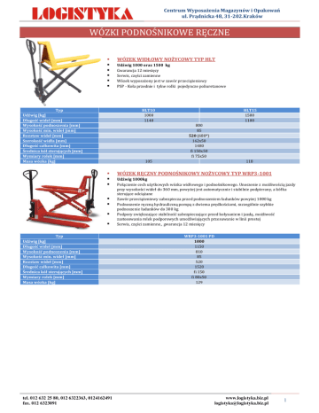 Centrum Wyposażenia Magazynów i Opakowań ul. Prądnicka 48, 31-202.Kraków WÓZKI PODNOŚNIKOWE RĘCZNE Typ Udźwig [kg] Długość wideł [mm] Wysokość podnoszenia [mm] Wysokość min. wideł [mm] Rozstaw wideł [mm] Szerokość widła [mm] Długość całkowita [mm] Średnica kół sterujących [mm] Wymiary rolek [mm] Masa wózka [kg] WÓZEK WIDŁOWY NOŻYCOWY TYP HLT Udźwig 1000 oraz 1500 kg Gwarancja 12 miesięcy Serwis, części zamienne Wózek wyposażony jest w zawór przeciążeniowy PSP - Koła przednie i tylne rolki pojedyncze poliuretanowe HLT10 1000 1140 HLT15 1500 1100 800 85 520 (680*) 162x50 1480 fi 150x50 fi 75x50 105 Typ Udźwig [kg] Długość wideł [mm] Wysokość podnoszenia [mm] Wysokość min. wideł [mm] Rozstaw wideł [mm] Długość całkowita [mm] Średnica kół sterujących [mm] Wymiary rolek [mm] Masa wózka [kg] tel. 012 632 25 80, 012 6322363, 0124162491 fax. 012 6323091 118 WÓZEK RĘCZNY PODNOŚNIKOWY NOŻYCOWY TYP WRP3-1001 Udźwig 1000kg Połączenie cech użytkowych wózka widłowego i podnośnikowego. Unoszenie z możliwością jazdy przy wysokości wideł do 360 mm, powyżej jest automatycznie i stabilnie podpierany, a kółka sterujące odciążane Zawór przeciążeniowy zabezpiecza przed podnoszeniem ładunków powyżej 1000 kg Podnoszenie ręczną hydrauliczną pompą z dwiema prędkościami, szczególnie szybkie podnoszenie ładunków do 300 kg Podpory zwiększające stabilność zabezpieczające przed kołysaniem i jazdą, możliwość zastosowania rolek podporowych umożliwiających przesuwanie w linii prostej Serwis, części zamienne, gwarancja 12 miesięcy WRP3-1001 PD 1000 1150 810 85 520 1520 fi 150 fi 80x50 129 www.logistyka.biz.pl [email protected] 1