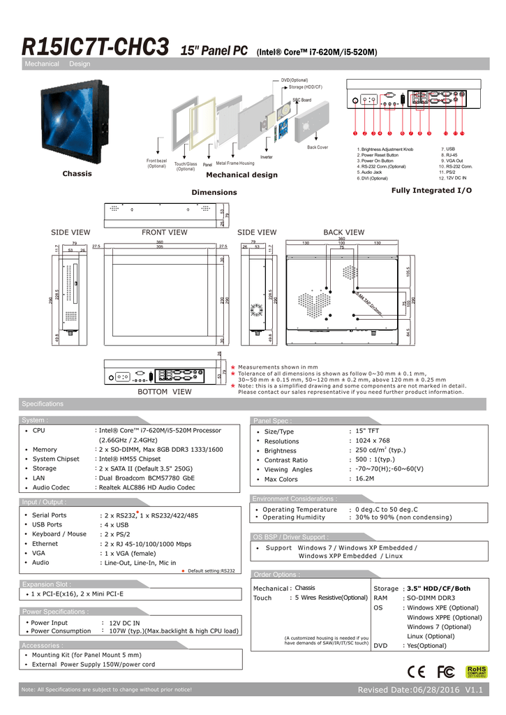 R15IC7T-CHC3 15" Panel PC (Intel®Core™i7-620M/i5-520M) Design Mechanical Storage (HDD/CF) SBC Board 1 Back Cover Front bezel (Optional) Chassis Inverter Touch/Glass (Optional) Panel Metal Frame Housing Mechanical design 2 3 4 5 FRONT VIEW 8 9 10 11 12 7. USB 8. RJ-45 9. VGA Out 10. RS-232 Conn. 11. PS/2 12. 12V DC IN Fully Integrated I/O SIDE VIEW BOTTOM VIEW 7 1. Brightness Adjustment Knob 2. Power Reset Button 3. Power On Button 4. RS-232 Conn.(Optional) 5. Audio Jack 6. DVI (Optional) Dimensions SIDE VIEW 6 BACK VIEW Measurements shown in mm * Tolerance dimensions is shown as follow 0~30 mm ± 0.1 mm, * 30~50 mmof±all0.15 mm, 50~120 mm ± 0.2 mm, above 120 mm ± 0.25 mm Note: this is a simplified drawing and some components are not marked in detail. * Please contact our sales representative if you need further product information. Specifications System : CPU Panel Spec : : Intel®Core™i7-620M/i5-520MProcessor Size/Type : 15" TFT Resolutions : 1024 x 768 : 2 x SO-DIMM, Max 8GB DDR3 1333/1600 : Intel®HM55 Chipset Brightness 2 : 250 cd/m (typ.) Contrast Ratio : 500 : 1(typ.) Viewing Angle s : -70~70(H);-60~60(V) LAN : 2 x SATA II (Default3.5" 250G) : Dual Broadcom BCM57780 GbE Max Colors : 16.2M AudioCodec : Realtek ALC886 HD Audio Codec (2.66GHz /2.4GHz) Memory SystemChipset Storage Environment Considerations : Input / Output : Serial Ports : 2 x RS232, 1 x RS232/422/485 USB Ports : 4 x USB Keyboard / Mouse : 2 x PS/2 Ethernet : 2 x RJ 45-10/100/1000 Mbps VGA : 1 x VGA (female) Audio : Line-Out, Line-In, Mic in Operating Temperature Operating Humidity : 0 deg.C to 50 deg.C : 30% to 90% (non condensing) OS BSP / Driver Support : Default setting:RS232 Expansion Slot : 1 x PCI-E(x16), 2 x Mini PCI-E Support Windows 7 / Windows XP Embedded / Windows XPP Embedded / Linux Order Options : Mechanical : Chassis Storage : 3.5" HDD/CF/Both : 5 Wires Resistive(Optional) RAM : SO-DIMM DDR3 Touch OS Power Specifications : Power Input Power Consumption Windows XPPE (Optional) : 12V DC IN : 107W (typ.)(Max.backlight & high CPU load) Accessories : : Windows XPE (Optional) Windows 7 (Optional) (A customized housing is needed if you have demands of SAW/IR/IT/SC touch) Linux (Optional) DVD : Yes(Optional) Mounting Kit (for Panel Mount 5 mm) External Power Supply 150W/power cord Note: All Specifications are subject to change without prior notice! Revised Date:06/28/2016 V1.1