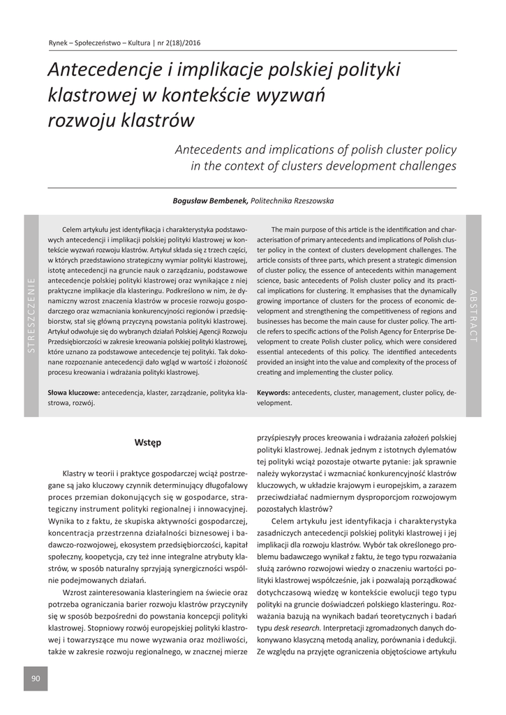 Rynek – Społeczeństwo – Kultura | nr 2(18)/2016 Antecedencje i implikacje polskiej polityki klastrowej w kontekście wyzwań rozwoju klastrów Antecedents and implications of polish cluster policy in the context of clusters development challenges Celem artykułu jest identyfikacja i charakterystyka podstawowych antecedencji i implikacji polskiej polityki klastrowej w kontekście wyzwań rozwoju klastrów. Artykuł składa się z trzech części, w których przedstawiono strategiczny wymiar polityki klastrowej, istotę antecedencji na gruncie nauk o zarządzaniu, podstawowe antecedencje polskiej polityki klastrowej oraz wynikające z niej praktyczne implikacje dla klasteringu. Podkreślono w nim, że dynamiczny wzrost znaczenia klastrów w procesie rozwoju gospodarczego oraz wzmacniania konkurencyjności regionów i przedsiębiorstw, stał się główną przyczyną powstania polityki klastrowej. Artykuł odwołuje się do wybranych działań Polskiej Agencji Rozwoju Przedsiębiorczości w zakresie kreowania polskiej polityki klastrowej, które uznano za podstawowe antecedencje tej polityki. Tak dokonane rozpoznanie antecedencji dało wgląd w wartość i złożoność procesu kreowania i wdrażania polityki klastrowej. The main purpose of this article is the identification and characterisation of primary antecedents and implications of Polish cluster policy in the context of clusters development challenges. The article consists of three parts, which present a strategic dimension of cluster policy, the essence of antecedents within management science, basic antecedents of Polish cluster policy and its practical implications for clustering. It emphasises that the dynamically growing importance of clusters for the process of economic development and strengthening the competitiveness of regions and businesses has become the main cause for cluster policy. The article refers to specific actions of the Polish Agency for Enterprise Development to create Polish cluster policy, which were considered essential antecedents of this policy. The identified antecedents provided an insight into the value and complexity of the process of creating and implementing the cluster policy. Słowa kluczowe: antecedencja, klaster, zarządzanie, polityka klastrowa, rozwój. Keywords: antecedents, cluster, management, cluster policy, development. Wstęp przyśpieszyły proces kreowania i wdrażania założeń polskiej polityki klastrowej. Jednak jednym z istotnych dylematów tej polityki wciąż pozostaje otwarte pytanie: jak sprawnie należy wykorzystać i wzmacniać konkurencyjność klastrów kluczowych, w układzie krajowym i europejskim, a zarazem przeciwdziałać nadmiernym dysproporcjom rozwojowym pozostałych klastrów? Celem artykułu jest identyfikacja i charakterystyka zasadniczych antecedencji polskiej polityki klastrowej i jej implikacji dla rozwoju klastrów. Wybór tak określonego problemu badawczego wynikał z faktu, że tego typu rozważania służą zarówno rozwojowi wiedzy o znaczeniu wartości polityki klastrowej współcześnie, jak i pozwalają porządkować dotychczasową wiedzę w kontekście ewolucji tego typu polityki na gruncie doświadczeń polskiego klasteringu. Rozważania bazują na wynikach badań teoretycznych i badań typu desk research. Interpretacji zgromadzonych danych dokonywano klasyczną metodą analizy, porównania i dedukcji. Ze względu na przyjęte ograniczenia objętościowe artykułu Klastry w teorii i praktyce gospodarczej wciąż postrzegane są jako kluczowy czynnik determinujący długofalowy proces przemian dokonujących się w gospodarce, strategiczny instrument polityki regionalnej i innowacyjnej. Wynika to z faktu, że skupiska aktywności gospodarczej, koncentracja przestrzenna działalności biznesowej i badawczo-rozwojowej, ekosystem przedsiębiorczości, kapitał społeczny, koopetycja, czy też inne integralne atrybuty klastrów, w sposób naturalny sprzyjają synergiczności wspólnie podejmowanych działań. Wzrost zainteresowania klasteringiem na świecie oraz potrzeba ograniczania barier rozwoju klastrów przyczyniły się w sposób bezpośredni do powstania koncepcji polityki klastrowej. Stopniowy rozwój europejskiej polityki klastrowej i towarzyszące mu nowe wyzwania oraz możliwości, także w zakresie rozwoju regionalnego, w znacznej mierze 90 ABSTRACT STRESZCZENIE Bogusław Bembenek, Politechnika Rzeszowska Bogusław Bembenek – Antecedencje i implikacje ... rozważania skoncentrowano na analizie wybranych antecedencji polskiej polityki klastrowej, w szczególności tych, które dotyczą aktywności Polskiej Agencji Rozwoju Przedsiębiorczości (PARP) na rzecz kreowania tej polityki. Strategiczny wymiar polityki klastrowej Współczesne klastry to organizacje partnerskie, uczące się, a w niektórych przypadkach też inteligentne, które powstają w efekcie rozwoju współpracy wokół wspólnych celów w układach poziomych i pionowych o charakterze formalnym i nieformalnym, pomiędzy interesariuszami lokalnych procesów gospodarczych, tj. przedsiębiorstwami danego sektora i sektorów pokrewnych, jednostkami sektora B+R, instytucjami wsparcia biznesu, jednostkami samorządu terytorialnego. Biorąc pod uwagę ewolucję koncepcji klastra i uwarunkowań w jakich powstawały i rozwijały się te struktury, nie sposób nie zauważyć różnorodności definicji klastra. W teorii i praktyce gospodarczej popularnym podejściem w definiowaniu tego pojęcia jest traktowanie go jako: • geograficzne skupisko niezależnych podmiotów, które reprezentują daną specjalizację gospodarczą, współpracujących i konkurujących ze sobą w ramach łańcucha wartości (Ministerstwo Rozwoju 2016); • specyficzne ugrupowania strategiczne przedsiębiorstw, pomiędzy którymi występuje jednoczesna konkurencja i współpraca, silna specjalizacja w oparciu o dominujący typ wiedzy i tradycje w regionie (Kuczewska 2014: 228); • forma samoorganizacji dzia