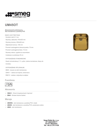 UM45OT Zlewozmywak podwieszany Stal nierdzewna z powłoką PVD EAN13: 8017709175443 Grubość stali 0,7 mm Wymiary całkowite: 470x420 mm Wymiary komory: 450x400 mm Głębokość komory: 180 mm Promień zaokrąglenia zlewozmywaka: 75 mm Promień zaokrąglenia blatu: 72 mm Wymiary otworu: zgodnie ze wzornikiem Instalacja w podstawę 45 cm WYPOSAŻENIE STANDARDOWE Zawór mimośrodowy 3 “½, syfon, taśma montażowa, klipsy do montażu. WYPOSAŻENIE OPCJONALNE DB45 - koszyk ze stali nierdzewnej CB45-1 - deska do krojenia, drewniana RND1V - zestaw z zatyczką na odpływ Functions Akcesoria CB45-1 - Wood chopping board, big bowl DB45 - St/steel drainer basket Wersje UM45RA - stal nierdzewna z powłoką PVD, miedź UM45N - stal nierdzewna z powłoką PVD, postarzane srebro UM45 - stal nierdzewna Smeg Polska Sp. z o.o. ul. Cybernetyki 9 02-677 Warszawa Tel. +48 22 276 14 00 UM45OT iLOŚĆ KOMÓR: 1 mosiądz 45 cm zlewozmywaki ze stali nierdzewnej podwieszane INSTALACJA POD BLATEM: Instalacja pod blatem zwiększa powierzchnie roboczą blatu. 45 CM PODSTAWA: Szerokość szafki/ podstawy wymagana do instalacji - 45 cm Smeg Polska Sp. z o.o. ul. Cybernetyki 9 02-677 Warszawa Tel. +48 22 276 14 00 UM45OT iLOŚĆ KOMÓR: 1 mosiądz 45 cm zlewozmywaki ze stali nierdzewnej podwieszane Smeg Polska Sp. z o.o. ul. Cybernetyki 9 02-677 Warszawa Tel. +48 22 276 14 00