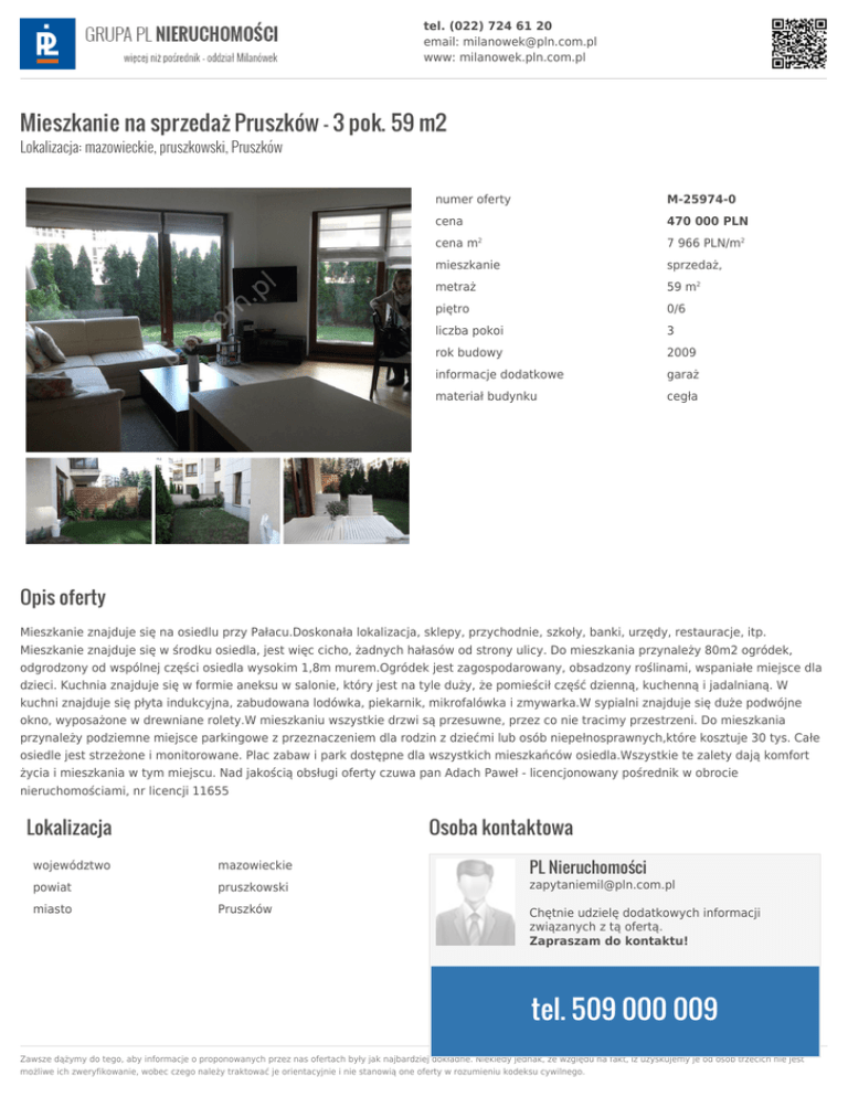 tel. (022) 724 61 20 email: [email protected] www: milanowek.pln.com.pl Mieszkanie na sprzedaż Pruszków - 3 pok. 59 m2 Lokalizacja: mazowieckie, pruszkowski, Pruszków numer oferty M-25974-0 cena 470 000 PLN cena m 7 966 PLN/m2 mieszkanie sprzedaż, metraż 59 m2 piętro 0/6 liczba pokoi 3 rok budowy 2009 informacje dodatkowe garaż materiał budynku cegła 2 Opis oferty Mieszkanie znajduje się na osiedlu przy Pałacu.Doskonała lokalizacja, sklepy, przychodnie, szkoły, banki, urzędy, restauracje, itp. Mieszkanie znajduje się w środku osiedla, jest więc cicho, żadnych hałasów od strony ulicy. Do mieszkania przynależy 80m2 ogródek, odgrodzony od wspólnej części osiedla wysokim 1,8m murem.Ogródek jest zagospodarowany, obsadzony roślinami, wspaniałe miejsce dla dzieci. Kuchnia znajduje się w formie aneksu w salonie, który jest na tyle duży, że pomieścił część dzienną, kuchenną i jadalnianą. W kuchni znajduje się płyta indukcyjna, zabudowana lodówka, piekarnik, mikrofalówka i zmywarka.W sypialni znajduje się duże podwójne okno, wyposażone w drewniane rolety.W mieszkaniu wszystkie drzwi są przesuwne, przez co nie tracimy przestrzeni. Do mieszkania przynależy podziemne miejsce parkingowe z przeznaczeniem dla rodzin z dziećmi lub osób niepełnosprawnych,które kosztuje 30 tys. Całe osiedle jest strzeżone i monitorowane. Plac zabaw i park dostępne dla wszystkich mieszkańców osiedla.Wszystkie te zalety dają komfort życia i mieszkania w tym miejscu. Nad jakością obsługi oferty czuwa pan Adach Paweł - licencjonowany pośrednik w obrocie nieruchomościami, nr licencji 11655 Lokalizacja Osoba kontaktowa PL Nieruchomości województwo mazowieckie powiat pruszkowski [email protected] miasto Pruszków Chętnie udzielę dodatkowych informacji związanych z tą ofertą. Zapraszam do kontaktu! tel. 509 000 009 Zawsze dążymy do tego, aby informacje o proponowanych przez nas ofertach były jak najbardziej dokładne. Niekiedy jednak, ze względu na fakt, iż uzyskujemy je od osób trzecich nie jest możliwe ich zweryfikowanie, wobec czego należy traktować je orientacyjnie i nie stanowią one oferty w rozumieniu kodeksu cywilnego.
