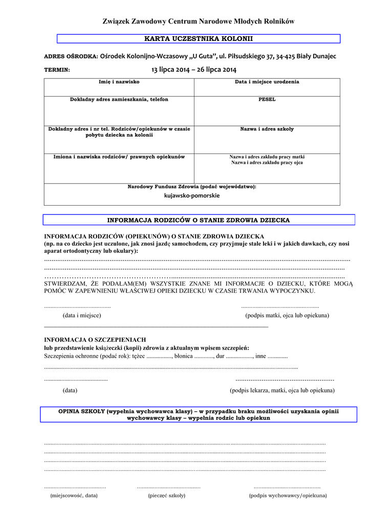 Związek Zawodowy Centrum Narodowe Młodych Rolników KARTA UCZESTNIKA KOLONII ADRES OŚRODKA: Ośrodek Kolonijno-Wczasowy „U Guta”, ul. Piłsudskiego 37, 34-425 Biały Dunajec 13 lipca 2014 – 26 lipca 2014 TERMIN: Imię i nazwisko Data i miejsce urodzenia Dokładny adres zamieszkania, telefon PESEL Dokładny adres i nr tel. Rodziców/opiekunów w czasie pobytu dziecka na kolonii Nazwa i adres szkoły Imiona i nazwiska rodziców/ prawnych opiekunów Nazwa i adres zakładu pracy matki Nazwa i adres zakładu pracy ojca Narodowy Fundusz Zdrowia (podać województwo): kujawsko-pomorskie INFORMACJA RODZICÓW O STANIE ZDROWIA DZIECKA INFORMACJA RODZICÓW (OPIEKUNÓW) O STANIE ZDROWIA DZIECKA (np. na co dziecko jest uczulone, jak znosi jazdę samochodem, czy przyjmuje stale leki i w jakich dawkach, czy nosi aparat ortodontyczny lub okulary): .................................................................................................................................................................... ................................................................................................................................................................. ……………………………………………............................................................................................. STWIERDZAM, ŻE PODAŁAM(EM) WSZYSTKIE ZNANE MI INFORMACJE O DZIECKU, KTÓRE MOGĄ POMÓC W ZAPEWNIENIU WŁAŚCIWEJ OPIEKI DZIECKU W CZASIE TRWANIA WYPOCZYNKU. .......................................... ................................................. (data i miejsce) (podpis matki, ojca lub opiekuna) ____________________________________________________________ INFORMACJA O SZCZEPIENIACH lub przedstawienie książeczki (kopii) zdrowia z aktualnym wpisem szczepień: Szczepienia ochronne (podać rok): tężec ................, błonica ............, dur ................., inne ............. ................................................................................................................................................................... ..................................................... ......................................... (data) (podpis lekarza, matki, ojca lub opiekuna) OPINIA SZKOŁY (wypełnia wychowawca klasy) – w przypadku braku możliwości uzyskania opinii wychowawcy klasy – wypełnia rodzic lub opiekun ................................................................................................................................................................................. ................................................................................................................................................................................. ................................................................................................................................................................................. ................................................................................................................................................................................. ....................................... (miejscowość, data) ........................................ (pieczęć szkoły) .......................................... (podpis wychowawcy/opiekuna) Potwierdzenie pobytu dziecka na wypoczynku Dziecko przebywało na ……………………………………………………………………………………………………………………...........…………………………….. (forma i adres miejsca wypoczynku) od dnia …......…..……. do dnia ……….....…….. 2…………. r. ………………….........……. (data) ………………………………………………………….. (czytelny podpis kierownika wypoczynku) Uwagi i spostrzeżenia wychowawcy o dziecku podczas pobytu na kolonii/ zimowisku ……………………………………………………………………………………………………………………………………………………………………………… ……………………………………………………………………………………………………………………………………………………………………………… ……………………………………………………………………………………………………………………………………………………………………………… ……………………………………………………………………………………………………………………………………………………………………………… ……………………………………………………………………………………………………………………………………………………………………………… ................................................... (miejscowość, data) …..................................... (podpis wychowawcy) Informacje o stanie zdrowia dziecka w czasie pobytu na kolonii ……………………………………………………………………………………………………………………………………………………………………………… ……………………………………………………………………………………………………………………………………………………………………………… ……………………………………………………………………………………………………………………………………………………………………………… ……………………………………………………………………………………………………………………………………………………………………………… ....................................... (miejscowość, data) …............................................ (podpis lekarza lub pi