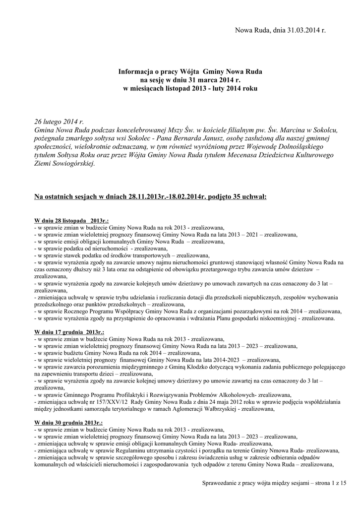 Nowa Ruda, dnia 31.03.2014 r. Informacja o pracy Wójta Gminy Nowa Ruda na sesję w dniu 31 marca 2014 r. w miesiącach listopad 2013 - luty 2014 roku 26 lutego 2014 r. Gmina Nowa Ruda podczas koncelebrowanej Mszy Św. w kościele filialnym pw. Św. Marcina w Sokolcu, pożegnała zmarłego sołtysa wsi Sokolec - Pana Bernarda Janusz, osobę zasłużoną dla naszej gminnej społeczności, wielokrotnie odznaczaną, w tym również wyróżnioną przez Wojewodę Dolnośląskiego tytułem Sołtysa Roku oraz przez Wójta Gminy Nowa Ruda tytułem Mecenasa Dziedzictwa Kulturowego Ziemi Sowiogórskiej. Na ostatnich sesjach w dniach 28.11.2013r.-18.02.2014r. podjęto 35 uchwał: W dniu 28 listopada 2013r.: - w sprawie zmian w budżecie Gminy Nowa Ruda na rok 2013 - zrealizowana, - w sprawie zmian wieloletniej prognozy finansowej Gminy Nowa Ruda na lata 2013 – 2021 – zrealizowana, - w sprawie emisji obligacji komunalnych Gminy Nowa Ruda – zrealizowana, - w sprawie podatku od nieruchomości - zrealizowana, - w sprawie stawek podatku od środków transportowych – zrealizowana, - w sprawie wyrażenia zgody na zawarcie umowy najmu nieruchomości gruntowej stanowiącej własność Gminy Nowa Ruda na czas oznaczony dłuższy niż 3 lata oraz na odstąpienie od obowiązku przetargowego trybu zawarcia umów dzierżaw – zrealizowana, - w sprawie wyrażenia zgody na zawarcie kolejnych umów dzierżawy po umowach zawartych na czas oznaczony do 3 lat – zrealizowana, - zmieniająca uchwałę w sprawie trybu udzielania i rozliczania dotacji dla przedszkoli niepublicznych, zespołów wychowania przedszkolnego oraz punktów przedszkolnych – zrealizowana, - w sprawie Rocznego Programu Współpracy Gminy Nowa Ruda z organizacjami pozarządowymi na rok 2014 – zrealizowana, - w sprawie wyrażenia zgody na przystąpienie do opracowania i wdrażania Planu gospodarki niskoemisyjnej - zrealizowana. W dniu 17 grudnia 2013r.: - w sprawie zmian w budżecie Gminy Nowa Ruda na rok 2013 - zrealizowana, - w sprawie zmian wieloletniej prognozy finansowej Gminy Nowa Ruda na lata 2013 – 2023 – zrealizowana, - w sprawie budżetu Gminy Nowa Ruda na rok 2014 – zrealizowana, - w sprawie wieloletniej prognozy finansowej Gminy Nowa Ruda na lata 2014-2023 – zrealizowana, - w sprawie zawarcia porozumienia międzygminnego z Gminą Kłodzko dotyczącą wykonania zadania publicznego polegającego na zapewnieniu transportu dzieci – zrealizowana, - w sprawie wyrażenia zgody na zawarcie kolejnej umowy dzierżawy po umowie zawartej na czas oznaczony do 3 lat – zrealizowna, - w sprawie Gminnego Programu Profilaktyki i Rozwiązywania Problemów Alkoholowych- zrealizowana, - zmieniająca uchwałę nr 157/XXV/12 Rady Gminy Nowa Ruda z dnia 24 maja 2012 roku w sprawie podjęcia współdziałania między jednostkami samorządu terytorialnego w ramach Aglomeracji Wałbrzyskiej - zrealizowana, W dniu 30 grudnia 2013r.: - w sprawie zmian w budżecie Gminy Nowa Ruda na rok 2013 - zrealizowana, - w sprawie zmian wieloletniej prognozy finansowej Gminy Nowa Ruda na lata 2013 – 2023 – zrealizowana, - zmieniająca uchwałę w sprawie emisji obligacji komunalnych Gminy Nowa Ruda- zrealizowana, - zmieniająca uchwałę w sprawie Regulaminu utrzymania czystości i porządku na terenie Gminy Nmowa Ruda- zrealizowana, - zmieniająca uchwałę w sprawie szczegółowego sposobu i zakresu świadczenia usług w zakresie odbierania odpadów komunalnych od właścicieli nieruchomości i zagospodarowania tych odpadów z terenu Gminy Nowa Ruda – zrealizowana, Sprawozdanie z pracy wójta między sesjami – strona 1 z 15 W dniu 18 lutego 2014r.: - w sprawie zmian w budżecie Gminy Nowa Ruda na rok 2014 - zrealizowana, - w sprawie zmian wieloletniej prognozy finansowej Gminy Nowa Ruda na lata 2014 – 2023 – zrealizowana, - zmieniająca uchwałę w sprawie inkasa podatków: rolnego, leśnego oraz od nieruchomości – zrealizowana, - w sprawie nie wyrażenia zgody na wyodrębnienie w budżecie Gminy Nowa Ruda środków przeznaczonych na fundusz sołecki – zrealizowana, - w sprawie udzielenia pomocy finansowej Powiatowi Kłodzkiemu na realizację zadań z zakresu dróg publicznych – zrealizowana, - zmieniająca uchwałę w sprawie poboru opłaty za gospodarowanie odpadami komunalnymi w drodze inkasa oraz wyznaczenia inkasentów i określenia wysokości wynagrodzenia za inkaso – zrealizowana, - w sprawie zmiany Statutu Gminy Nowa Ruda – zrealizowana, - w sprawie upoważnienia Kierownika Gminnego Ośrodka Pomocy Społecznej w Nowej Rudzie do załatwiania indywidualnych spraw z zakresu administracji publicznej dotyczących przyznawania dodatku energetycznego – w trakcie realizacji, - zmieniająca uchwałę w sprawie uchwalenia regulaminu określającego tryb i sposób powoływania i odwoływania członków zespołu interdyscyplinarnego oraz szczegółowych warunków jego funkcjonowania – zrealizowna, - w sprawie wyrażnie zgody na zawarcie porozumienia pomiędzy Gminą Miejską, Gminą Nowa Ruda i Gminą Radków dotyczącego świadczeń pomocy społecznej z zakresu administracji rządowej mieszkańcom Gminy Nowa Ruda i Gminy Radków przez Miejski Środowiskowy Dom Samopomocy w Nowej Rudzie - zrealizowana, - w sprawie wyrażenia zgody na zawarcie kolejnej umowy dzierżawy po umowie zawartej na czas oznaczony do 3 lat zrealizowana, - w sprawie wyrażenia zgody na zawarcie umowy najmu części lokalu użytkowego stanowiącego własność Gminy Nowa Ruda na czas nieoznaczony oraz na odstąpienie od obowiązku przetargowego trybu zawarcia umowy najmu - zrealizowana, Zadania Budżetowo-Finansowe oraz informatyczne prowadzone przez Urząd Gminy: 1. Zadania Budżetowe: - przygotowanie projektu budżetu Gminy Nowa Ruda na rok 2014 i jego przedstawienie Radzie Gminy Nowa Ruda oraz Regionalnej Izbie Obrachunkowej celem zaopiniowania, - przygotowanie i wprowadzenie pakietu uchwał dotyczących restrukturyzacji zadłużenia. Uchwały zostały p