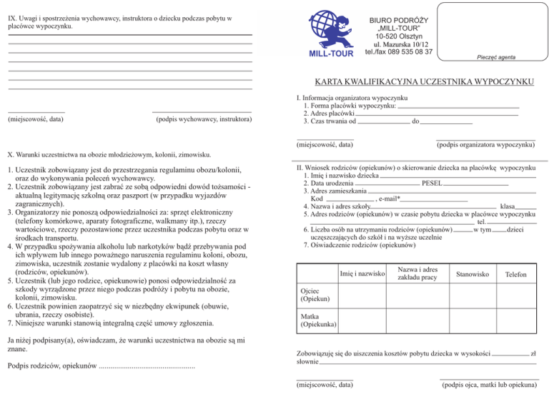 IX. Uwagi i spostrze¿enia wychowawcy, instruktora o dziecku podczas pobytu w placówce wypoczynku. BIURO PODRÓ¯Y „MILL-TOUR” 10-520 Olsztyn ul. Mazurska 10/12 tel./fax 089 535 08 37 Pieczêæ agenta KARTA KWALIFIKACYJNA UCZESTNIKA WYPOCZYNKU (miejscowoœæ, data) (podpis wychowawcy, instruktora) I. Informacja organizatora wypoczynku 1. Forma placówki wypoczynku: 2. Adres placówki 3. Czas trwania od do (miejscowoœæ, data) (podpis organizatora wypoczynku) X. Warunki uczestnictwa na obozie m³odzie¿owym, kolonii, zimowisku. 1. Uczestnik zobowi¹zany jest do przestrzegania regulaminu obozu/kolonii, oraz do wykonywania poleceñ wychowawcy. 2. Uczestnik zobowi¹zany jest zabraæ ze sob¹ odpowiedni dowód to¿samoœci aktualn¹ legitymacjê szkoln¹ oraz paszport (w przypadku wyjazdów zagranicznych). 3. Organizatorzy nie ponosz¹ odpowiedzialnoœci za: sprzêt elektroniczny (telefony komórkowe, aparaty fotograficzne, walkmany itp.), rzeczy wartoœciowe, rzeczy pozostawione przez uczestnika podczas pobytu oraz w œrodkach transportu. 4. W przypadku spo¿ywania alkoholu lub narkotyków b¹dŸ przebywania pod ich wp³ywem lub innego powa¿nego naruszenia regulaminu koloni, obozu, zimowiska, uczestnik zostanie wydalony z placówki na koszt w³asny (rodziców, opiekunów). 5. Uczestnik (lub jego rodzice, opiekunowie) ponosi odpowiedzialnoœæ za szkody wyrz¹dzone przez niego podczas podró¿y i pobytu na obozie, kolonii, zimowisku. 6. Uczestnik powinien zaopatrzyæ siê w niezbêdny ekwipunek (obuwie, ubrania, rzeczy osobiste). 7. Niniejsze warunki stanowi¹ integraln¹ czêœæ umowy zg³oszenia. Ja ni¿ej podpisany(a), oœwiadczam, ¿e warunki uczestnictwa na obozie s¹ mi znane. Podpis rodziców, opiekunów .................................................. II. Wniosek rodziców (opiekunów) o skierowanie dziecka na placówkê wypoczynku 1. Imiê i nazwisko dziecka 2. Data urodzenia PESEL 3. Adres zamieszkania Kod , e-mail* 4. Nazwa i adres szko³y klasa 5. Adres rodziców (opiekunów) w czasie pobytu dziecka w placówce wypoczynku tel. 6. Liczba osób na utrzymaniu rodziców (opiekunów) w tym dzieci uczêszczaj¹cych do szkó³ i na wy¿sze uczelnie 7. Oœwiadczenie rodziców (opiekunów) Imiê i nazwisko Nazwa i adres zak³adu pracy Stanowisko Telefon Ojciec (Opiekun) Matka (Opiekunka) Zobowi¹zujê siê do uiszczenia kosztów pobytu dziecka w wysokoœci s³ownie (miejscowoœæ, data) z³ (podpis ojca, matki lub opiekuna) III. Informacja rodziców (opiekunów) o stanie zdrowia dziecka (np. na co dziecko jest uczulone, jak znosi jazdê samochodem, czy przyjmuje sta³e leki i w jakich dawkach, czy nosi aparat ortodontyczny lub okulary) VI. Specjalne ¿yczenia lub przeciwwskazania (data) (podpis) Stwierdzam, ¿e poda³em wszystkie znane mi informacje o dziecku, które mog¹ pomóc w zapewnieniu w³aœciwej opieki w czasie pobytu dziecka w placówce wypoczynku. VII. Potwierdzenie pobytu dziecka w placówce wypoczynku (miejscowoœæ, data) (podpis ojca, matki lub opiekuna) Dziecko przebywa³o na (forma i adres wypoczynku) od dnia IV. Informacje pielêgniarki o szczepieniach lub przedstawienie ksi¹¿eczki zdrowia z aktualnym wpisem szczepieñ Szczepienia ochronne (podaæ rok) tê¿ec dur , inne , b³onica , (data) do dnia 200 r. (podpis) VIII. Informacja o stanie zdrowia dziecka w czasie pobytu w placówce wypoczynku (dane o zachorowaniach, urazach, leczeniu itp.) (miejscowoœæ, data) (podpis pielêgniarki) V. Informacja o dziecku wychowawcy klasy (w przypadku braku mo¿liwoœci uzyskania opinii wychowawcy klasy - wype³nia rodzic lub opiekun) (miejscowoœæ, data) Organizator informuje rodziców o leczeniu ambulatoryjnym lub hospitalizacji dziecka (podpis wychowawcy lub rodzica) (miejscowoœæ, data) (podpis lekarza lub pielêgniarki placówki wypoczynku)