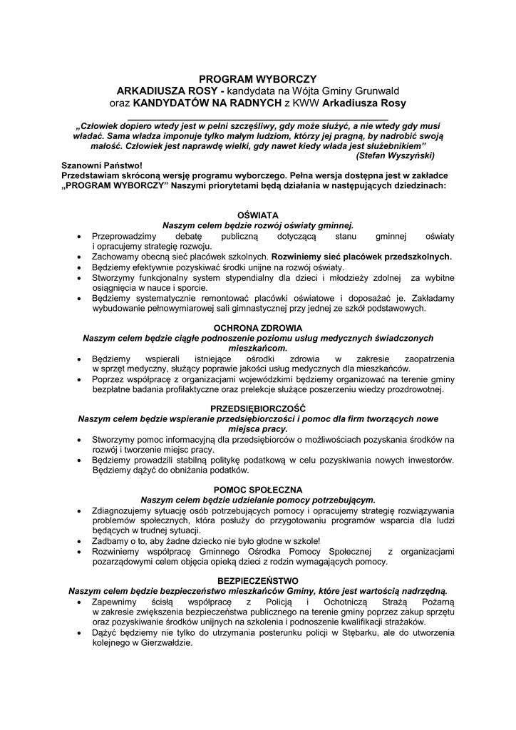 PROGRAM WYBORCZY ARKADIUSZA ROSY - kandydata na Wójta Gminy Grunwald oraz KANDYDATÓW NA RADNYCH z KWW Arkadiusza Rosy _____________________________________________ „Człowiek dopiero wtedy jest w pełni szczęśliwy, gdy może służyć, a nie wtedy gdy musi władać. Sama władza imponuje tylko małym ludziom, którzy jej pragną, by nadrobić swoją małość. Człowiek jest naprawdę wielki, gdy nawet kiedy włada jest służebnikiem” (Stefan Wyszyński) Szanowni Państwo! Przedstawiam skróconą wersję programu wyborczego. Pełna wersja dostępna jest w zakładce „PROGRAM WYBORCZY” Naszymi priorytetami będą działania w następujących dziedzinach: OŚWIATA Naszym celem będzie rozwój oświaty gminnej. Przeprowadzimy debatę publiczną dotyczącą stanu gminnej oświaty i opracujemy strategię rozwoju. Zachowamy obecną sieć placówek szkolnych. Rozwiniemy sieć placówek przedszkolnych. Będziemy efektywnie pozyskiwać środki unijne na rozwój oświaty. Stworzymy funkcjonalny system stypendialny dla dzieci i młodzieży zdolnej za wybitne osiągnięcia w nauce i sporcie. Będziemy systematycznie remontować placówki oświatowe i doposażać je. Zakładamy wybudowanie pełnowymiarowej sali gimnastycznej przy jednej ze szkół podstawowych. OCHRONA ZDROWIA Naszym celem będzie ciągłe podnoszenie poziomu usług medycznych świadczonych mieszkańcom. Będziemy wspierali istniejące ośrodki zdrowia w zakresie zaopatrzenia w sprzęt medyczny, służący poprawie jakości usług medycznych dla mieszkańców. Poprzez współpracę z organizacjami wojewódzkimi będziemy organizować na terenie gminy bezpłatne badania profilaktyczne oraz prelekcje służące poszerzeniu wiedzy prozdrowotnej. PRZEDSIĘBIORCZOŚĆ Naszym celem będzie wspieranie przedsiębiorczości i pomoc dla firm tworzących nowe miejsca pracy. Stworzymy pomoc informacyjną dla przedsiębiorców o możliwościach pozyskania środków na rozwój i tworzenie miejsc pracy. Będziemy prowadzili stabilną politykę podatkową w celu pozyskiwania nowych inwestorów. Będziemy dążyć do obniżania podatków. POMOC SPOŁECZNA Naszym celem będzie udzielanie pomocy potrzebującym. Zdiagnozujemy sytuację osób potrzebujących pomocy i opracujemy strategię rozwiązywania problemów społecznych, która posłuży do przygotowaniu programów wsparcia dla ludzi będących w trudnej sytuacji. Zadbamy o to, aby żadne dziecko nie było głodne w szkole! Rozwiniemy współpracę Gminnego Ośrodka Pomocy Społecznej z organizacjami pozarządowymi celem objęcia opieką dzieci z rodzin wymagających pomocy. BEZPIECZEŃSTWO Naszym celem będzie bezpieczeństwo mieszkańców Gminy, które jest wartością nadrzędną. Zapewnimy ścisłą współpracę z Policją i Ochotniczą Strażą Pożarną w zakresie zwiększenia bezpieczeństwa publicznego na terenie gminy poprzez zakup sprzętu oraz pozyskiwanie środków unijnych na szkolenia i podnoszenie kwalifikacji strażaków. Dążyć będziemy nie tylko do utrzymania posterunku policji w Stębarku, ale do utworzenia kolejnego w Gierzwałdzie. INFRASTRUKTURA TECHNICZNA Naszym celem będzie rozwój infrastruktury technicznej. Dążyć będziemy do pełnego skanalizowania gminy. Będziemy systematycznie poprawiać jakość dróg gminnych i eliminować uciążliwości w poruszaniu się po nich poprzez budowę chodników. OCHRONA ŚRODOWISKA, ZABYTKÓW I ROLNICTWO Naszym priorytetem będzie zdrowe i nieskażone środowisko. Zapewnimy rolnikom merytoryczną pomoc w pozyskiwaniu środków unijnych. Dążyć będziemy do zmniejszenia wysokości podatków rolnych. Będziemy promowali akcje konkursowe na najładniejsze otoczenia domostw, w celu promowania poprawy estetyki poszczególnych wsi. Będziemy podejmować działania w celu pozyskania środków zewnętrznych na renowację zabytków gminnych. KULTURA Naszym celem będzie organizacja większej liczby imprez dla mieszkańców, pomoc i wspieranie inicjatyw mieszkańców. Kontynuować będziemy organizację Obchodów Dni Grunwaldzkich, która jest imprezą ogólnokrajową. Wprowadzimy zwyczaj organizacji corocznego Święta Gminy – imprezy skierowanej do mieszkańców. Zwiększymy ilość i atrakcyjność imprez oferowanych przez Gminny Ośrodek Kultury, w tym szczególnie w okresie wakacyjnym i feryjnym - spotkania muzyczne, koncerty, wernisaże. Ustanowimy Nagrody Wójta Gminy Grunwald za osiągnięcia w dziedzinie twórczości artystycznej, upowszechnianie i rozwoju kultury. Będziemy wydawać bezpłatny kwartalnik gminny w celu szerokiej informacji o podejmowanych działaniach gospodarczych, kulturalnych i społecznych na terenie gminy. SPORT I REKREACJA Naszym celem będzie wspieranie rozwoju sportowego mieszkańców, a także stwarzanie warunków do aktywnej rekreacji. Zapewnimy dalszy rozwój bazy sportowej poprzez budowę sali gimnastycznej przy jednej ze szkół podstawowych wraz z profesjonalnie wyposażoną siłownią, budowę boisk do siatkówki plażowej przy każdej ze szkół, rozwój bazy stadionu sportowego we Frygnowie poprzez budowę trybuny dla widzów. Będziemy dążyć do objęcia nauką pływania dzieci ze szkół podstawowych. Zwiększymy dotacje z budżetu gminy dla GKS „Grunwald” Gierzwałd na organizowanie zajęć sportowych i rekreacyjnych dla młodzieży. ZARZĄDZANIE Gmina Grunwald zasługuje na dobre zarządzanie. Stworzymy właściwe warunki i zadbamy o skuteczne pozyskanie środków unijnych na inwestycje. Zwiększymy skuteczność Gminy Grunwald w pozyskiwaniu środków unijnych na realizację zadań infrastrukturalnych i społecznych. Wyznaczymy jeden dzień w tygodniu, w którym godziny pracy Urzędu Gminy umożliwiać będą załatwienie spraw w godzinach popołudniowych. Poszukamy Gminy Partnerskiej za granicą. Będziemy organizowali stałe, otwarte spotkania Wójta i Radnych z mieszkańcami gminy – nie tylko przed wyborami. Zapraszam Państwa na spotkania wyborcze! Arkadiusz Rosa