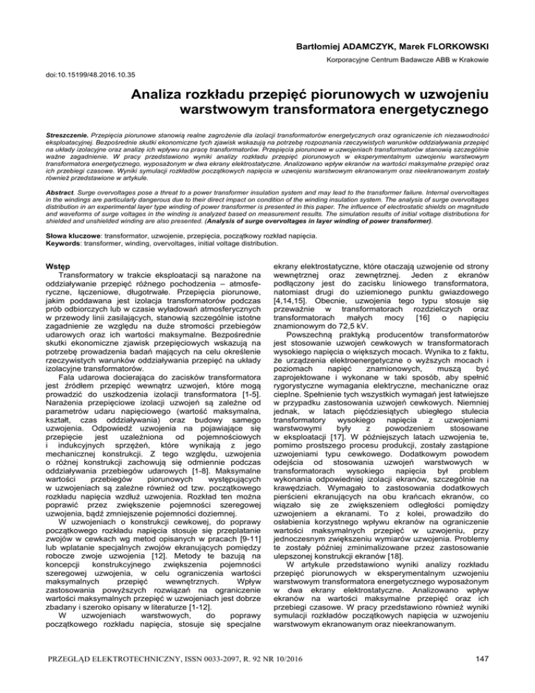 Bartłomiej ADAMCZYK, Marek FLORKOWSKI Korporacyjne Centrum Badawcze ABB w Krakowie doi:10.15199/48.2016.10.35 Analiza rozkładu przepięć piorunowych w uzwojeniu warstwowym transformatora energetycznego Streszczenie. Przepięcia piorunowe stanowią realne zagrożenie dla izolacji transformatorów energetycznych oraz ograniczenie ich niezawodności eksploatacyjnej. Bezpośrednie skutki ekonomiczne tych zjawisk wskazują na potrzebę rozpoznania rzeczywistych warunków oddziaływania przepięć na układy izolacyjne oraz analizę ich wpływu na pracę transformatorów. Przepięcia piorunowe w uzwojeniach transformatorów stanowią szczególnie ważne zagadnienie. W pracy przedstawiono wyniki analizy rozkładu przepięć piorunowych w eksperymentalnym uzwojeniu warstwowym transformatora energetycznego, wyposażonym w dwa ekrany elektrostatyczne. Analizowano wpływ ekranów na wartości maksymalne przepięć oraz ich przebiegi czasowe. Wyniki symulacji rozkładów początkowych napięcia w uzwojeniu warstwowym ekranowanym oraz nieekranowanym zostały również przedstawione w artykule. Abstract. Surge overvoltages pose a threat to a power transformer insulation system and may lead to the transformer failure. Internal overvoltages in the windings are particularly dangerous due to their direct impact on condition of the winding insulation system. The analysis of surge overvoltages distribution in an experimental layer type winding of power transformer is presented in this paper. The influence of electrostatic shields on magnitude and waveforms of surge voltages in the winding is analyzed based on measurement results. The simulation results of initial voltage distributions for shielded and unshielded winding are also presented. (Analysis of surge overvoltages in layer winding of power transformer). Słowa kluczowe: transformator, uzwojenie, przepięcia, początkowy rozkład napięcia. Keywords: transformer, winding, overvoltages, initial voltage distribution. Wstęp Transformatory w trakcie eksploatacji są narażone na oddziaływanie przepięć różnego pochodzenia – atmosferyczne, łączeniowe, długotrwałe. Przepięcia piorunowe, jakim poddawana jest izolacja transformatorów podczas prób odbiorczych lub w czasie wyładowań atmosferycznych w przewody linii zasilających, stanowią szczególnie istotne zagadnienie ze względu na duże stromości przebiegów udarowych oraz ich wartości maksymalne. Bezpośrednie skutki ekonomiczne zjawisk przepięciowych wskazują na potrzebę prowadzenia badań mających na celu określenie rzeczywistych warunków oddziaływania przepięć na układy izolacyjne transformatorów. Fala udarowa docierająca do zacisków transformatora jest źródłem przepięć wewnątrz uzwojeń, które mogą prowadzić do uszkodzenia izolacji transformatora [1-5]. Narażenia przepięciowe izolacji uzwojeń są zależne od parametrów udaru napięciowego (wartość maksymalna, kształt, czas oddziaływania) oraz budowy samego uzwojenia. Odpowiedź uzwojenia na pojawiające się przepięcie jest uzależniona od pojemnościowych i indukcyjnych sprzężeń, które wynikają z jego mechanicznej konstrukcji. Z tego względu, uzwojenia o różnej konstrukcji zachowują się odmiennie podczas oddziaływania przebiegów udarowych [1-8]. Maksymalne wartości przebiegów piorunowych występujących w uzwojeniach są zależne również od tzw. początkowego rozkładu napięcia wzdłuż uzwojenia. Rozkład ten można poprawić przez zwiększenie pojemności szeregowej uzwojenia, bądź zmniejszenie pojemności doziemnej. W uzwojeniach o konstrukcji cewkowej, do poprawy początkowego rozkładu napięcia stosuje się przeplatanie zwojów w cewkach wg metod opisanych w pracach [9-11] lub wplatanie specjalnych zwojów ekranujących pomiędzy robocze zwoje uzwojenia [12]. Metody te bazują na koncepcji konstrukcyjnego zwiększenia pojemności szeregowej uzwojenia, w celu ograniczenia wartości maksymalnych przepięć wewnętrznych. Wpływ zastosowania powyższych rozwiązań na ograniczenie wartości maksymalnych przepięć w uzwojeniach jest dobrze zbadany i szeroko opisany w literaturze [1-12]. W uzwojeniach warstwowych, do poprawy początkowego rozkładu napięcia, stosuje się specjalne ekrany elektrostatyczne, które otaczają uzwojenie od strony wewnętrznej oraz zewnętrznej. Jeden z ekranów podłączony jest do zacisku liniowego transformatora, natomiast drugi do uziemionego punktu gwiazdowego [4,14,15]. Obecnie, uzwojenia tego typu stosuje się przeważnie w transformatorach rozdzielczych oraz transformatorach małych mocy [16] o napięciu znamionowym do 72,5 kV. Powszechną praktyką producentów transformatorów jest stosowanie uzwojeń cewkowych w transformatorach wysokiego napięcia o większych mocach. Wynika to z faktu, że urządzenia elektroenergetyczne o wyższych mocach i poziomach napięć znamionowych, muszą być zaprojektowane i wykonane w taki sposób, aby spełnić rygorystyczne wymagania elektryczne, mechaniczne oraz cieplne. Spełnienie tych wszystkich wymagań jest łatwiejsze w przypadku zastosowania uzwojeń cewkowych. Niemniej jednak, w latach pięćdziesiątych ubiegłego stulecia transformatory wysokiego napięcia z uzwojeniami warstwowymi były z powodzeniem stosowane w eksploatacji [17]. W późniejszych latach uzwojenia te, pomimo prostszego procesu produkcji, zostały zastąpione uzwojeniami typu cewkowego. Dodatkowym powodem odejścia od stosowania uzwojeń warstwowych w transformatorach wysokiego napięcia był problem wykonania odpowiedniej izolacji ekranów, szczególnie na krawędziach. Wymagało to zastosowania dodatkowych pierścieni ekranujących na obu krańcach ekranów, co wiązało się ze zwiększeniem odległości pomiędzy uzwojeniem a ekranami. To z kolei, prowadziło do osłabienia korzystnego wpływu ekranów na ograniczenie wartości maksymalnych przepięć w uzwojeniu, przy jednoczesnym zwiększeniu wymiarów uzwojenia. Problemy 