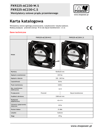 FK9225‐AC230‐W.S FK9225‐AC230‐C.S Wentylatory osiowe prądu przemiennego www.mwpower.pl Karta katalogowa Wentylatory osiowe ogólnego przeznaczenia. Łożyskowanie: łożyska kulkowe. Rodzaj przyłącza: przewód (wersja ‐W.S) lub złącze konektorowe (‐C.S) Dane techniczne FK9225‐AC230‐W.S FK9225‐AC230‐C.S Widok Wymiary 92x92x25 mm Napięcie znamionowe 230 Vac Napięcie robocze 220 ‐ 240 Vac Częstotliwość 50 Hz Prąd znamionowy 0,08 A Moc znamionowa elektryczna 16 W Przyłączenie Przewód Prędkość obrotowa Złącze konektorowe 2300 obr/min Wydajność objętościowa 42 m3/h Ciśnienie (spiętrzenie) statyczne 29 Pa Poziom hałasu 23 dBA Łożysko kulkowe Waga 270 g ___________________________________________________________________________________________________ www.mwpower.pl FK9225‐AC230‐W.S FK9225‐AC230‐C.S Wentylatory osiowe prądu przemiennego www.mwpower.pl Karta katalogowa Rysunki wymiarowe Akcesoria GM92.S Kratka wentylacyjna metalowa do wentylatora 92x92 mm Zastrzega się możliwość wprowadzenia zmian technicznych. ___________________________________________________________________________________________________ www.mwpower.pl