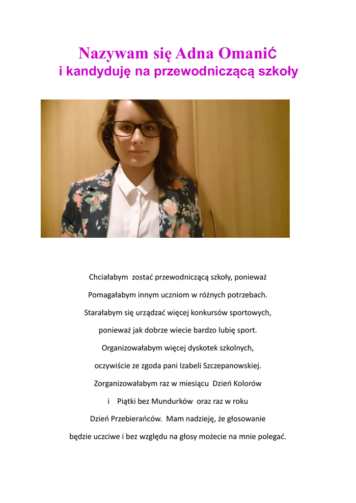 Nazywam się Adna OmaniĆ i kandyduję na przewodniczącą szkoły Chciałabym zostać przewodniczącą szkoły, ponieważ Pomagałabym innym uczniom w różnych potrzebach. Starałabym się urządzać więcej konkursów sportowych, ponieważ jak dobrze wiecie bardzo lubię sport. Organizowałabym więcej dyskotek szkolnych, oczywiście ze zgoda pani Izabeli Szczepanowskiej. Zorganizowałabym raz w miesiącu Dzień Kolorów i Piątki bez Mundurków oraz raz w roku Dzień Przebierańców. Mam nadzieję, że głosowanie będzie uczciwe i bez względu na głosy możecie na mnie polegać.