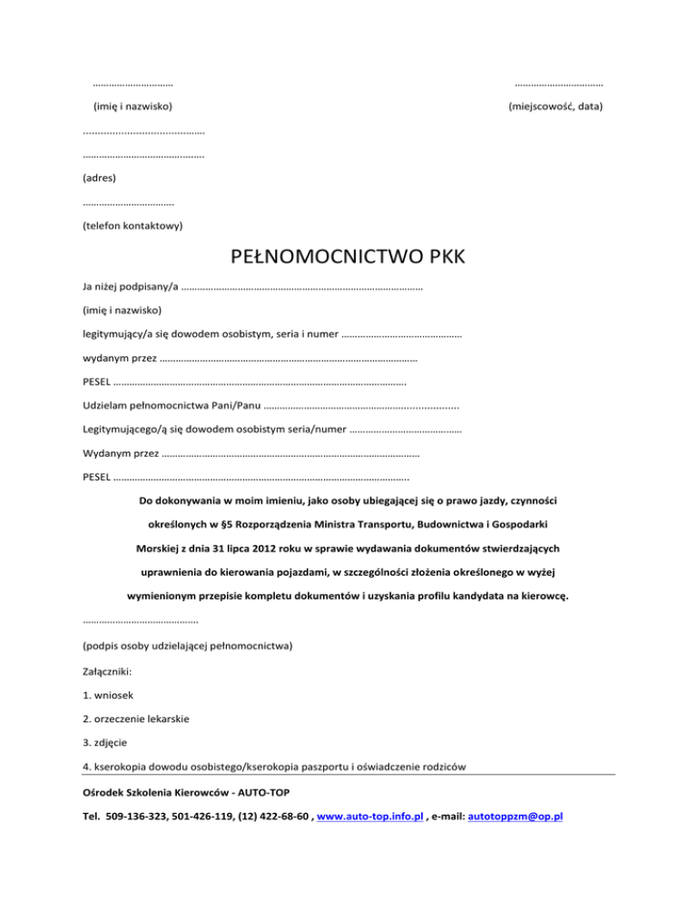 ………………………… …………………………… (imię i nazwisko) (miejscowość, data) ...................................……. ……………………………….….…. (adres) ……………………………. (telefon kontaktowy) PEŁNOMOCNICTWO PKK Ja niżej podpisany/a ……………………………………………………………………………… (imię i nazwisko) legitymujący/a się dowodem osobistym, seria i numer ……………………………………… wydanym przez …………………………………………………………………………………… PESEL ………………………………………………………………………………………………. Udzielam pełnomocnictwa Pani/Panu …………………………………………….................... Legitymującego/ą się dowodem osobistym seria/numer …………………………………… Wydanym przez …………………………………………………………………………………… PESEL ……………………………………………………………………………………………….. Do dokonywania w moim imieniu, jako osoby ubiegającej się o prawo jazdy, czynności określonych w §5 Rozporządzenia Ministra Transportu, Budownictwa i Gospodarki Morskiej z dnia 31 lipca 2012 roku w sprawie wydawania dokumentów stwierdzających uprawnienia do kierowania pojazdami, w szczególności złożenia określonego w wyżej wymienionym przepisie kompletu dokumentów i uzyskania profilu kandydata na kierowcę. ……………………………………. (podpis osoby udzielającej pełnomocnictwa) Załączniki: 1. wniosek 2. orzeczenie lekarskie 3. zdjęcie 4. kserokopia dowodu osobistego/kserokopia paszportu i oświadczenie rodziców Ośrodek Szkolenia Kierowców - AUTO-TOP Tel. 509-136-323, 501-426-119, (12) 422-68-60 , www.auto-top.info.pl , e-mail: [email protected]