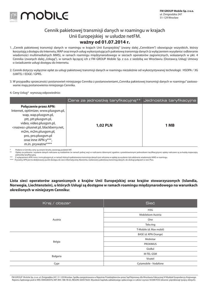 FM GROUP Mobile Sp. z o.o. ul. Żmigrodzka 247 51-129 Wrocław Cennik pakietowej transmisji danych w roamingu w krajach Unii Europejskiej w usłudze netFM. ważny od 01.07.2014 r. 1. „Cennik pakietowej transmisji danych w roamingu w krajach Unii Europejskiej” (zwany dalej „Cennikiem”) obowiązuje wszystkich, którzy korzystają z dostępu do Internetu, WAP oraz innych usług wykorzystujących pakietową transmisję danych (z wyłączeniem wysyłania i odbieranie wiadomości multimedialnych MMS), w ramach roamingu międzynarodowego w sieciach operatorów zagranicznych, wskazanych w pkt. 4 Cennika (zwanych dalej „Usługą”), w ramach łączącej ich z FM GROUP Mobile Sp. z o.o. z siedzibą we Wrocławiu (Dostawcą Usług) Umowy o świadczenie usługi dostępu do Internetu. 2. Cennik dotyczy wyłącznie opłat za usługi pakietowej transmisji danych w roamingu niezależnie od wykorzystywanej technologii: HSDPA / 3G (UMTS) / EDGE / GPRS. 3. W przypadku sprzeczności postanowień niniejszego Cennika z postanowieniami „Cennika pakietowej transmisji danych w roamingu” zastoso wanie mają postanowienia niniejszego Cennika. 4. Ceny Usług* wynoszą odpowiednio: Cena za jednostkę taryfikacyjną** Jednostka taryfikacyjna Połączenie przez APN: Internet, optimizer, www.plusgsm.pl, wap, wap.plusgsm.pl, ptt, ptt.plusgsm.pl, video, video.plusgsm.pl, <nazwa>.plusnet.pl, blackberry.net, m2m, m2m.plusgsm.pl, pro, pro.plusgsm.pl oraz inne APN-y***, m.in. prywatne**** 1,02 PLN 1 MB * ** Podane w Cenniku ceny są cenami brutto, zawierają podatek VAT. Opłaty za pobranie i wysłanie danych naliczane są rozdzielnie (w ramach jednej sesji w rozliczeniu dziennym) zgodnie z przedstawionymi jednostkami taryfikacyjnymi; opłaty naliczane są za każdą rozpoczętą jednostkę taryfikacyjną. *** Z wyłączeniem APN: mms i mms.plusgsm.pl, w ramach których pakietowana transmisja danych jest wliczona w opłatę za wysłanie lub odebranie wiadomości MMS w roamingu. **** Prywatny APN jest to dedykowany punkt dostępu do sieci informatycznej Abonenta, realizowany pakietową transmisją danych, do obsługi połączeń w sieci Plus. Lista sieci operatorów zagranicznych z krajów Unii Europejskiej oraz krajów stowarzyszonych (Islandia, Norwegia, Liechtenstein), u których Usługi są dostępne w ramach roamingu międzynarodowego na warunkach określonych w niniejszym Cenniku: Kraj / obszar Sieć H3G Mobilekom Austria Austria One Tele.ring T-Mobile (d. Max mobil) BASE (d. KPN Orange) Belgia Mobistar PROXIMUS GioBul Bułgaria Cypr M-TEL GSM Vivatel Cytamobile - Vodafone FM GROUP Mobile Sp. z o.o. ul. Żmigrodzka 247, 51-129 Wrocław. Spółka zarejestrowana w Rejestrze Przedsiębiorców przez Sąd Rejonowy dla Wrocławia-Fabrycznej VI Wydział Gospodarczy Krajowego Rejestru Sądowego pod nr KRS: 0000285976, NIP: 895-188-78-63, REGON: 020573625. Wysokość kapitału zakładowego opłaconego w całości wynosi 50.000 PLN (słownie: pięćdziesiąt tysięcy złotych). FM GROUP Mobile Sp. z o.o. ul. Żmigrodzka 247 51-129 Wrocław Telefonica O2 (d. Eurotel Praha|) Czechy T-Mobile (d. RadioMobil) Vodafone (d. OSKAR) 3 Dania SONOFON TDC Mobil (d. TeleDanmark) TELIA DK Estonia ELISA (d. RADIOLINJA EESTI) EMT GSM Alands Finlandia DNA (d. FINNET d. Suomen 2G/Finnish 2G & Telia) Elisa (d. Radiolinja) SONERA (d. Telecom Finland) BOUYGUES TELECOM Francja Orange (d. France Telecom) SFR COSMOTE Grecja Vodafone WIND (D. TIM, Stet Hellas & Telestet) Movistar Hiszpania Orange (d. amena) Vodafone KPN Mobile (d. PTT) Holandia Orange (d. Dutchtone) T-Mobile (d. Ben) Vodafone (d. Libertel) Meteor Irlandia O2 (d. Esat Digifone) Vodafone Ireland (d. Eircell) Islandia Lichtenstein Litwa Og Vodafone (d. Islandssiminn) Siminn (d. Landssiminn) Mobilkom / FL1 Bite OMNITEL LUXGSM Luksemburg TANGO VOXmobile Łotwa Malta Bite LMT GSM Go mobile Vodafone (d. Telecell) BOUYGUES TELECOM Monako Orange (d. France Telecom) SFR E-Plus Niemcy O2 (d. VIAG Interkom) T-Mobile / T-D1 (d. DeTeMobil) Vodafone (d. Mannesmann Mobilfunk) FM GROUP Mobile Sp. z o.o. ul. Żmigrodzka 247, 51-129 Wrocław. Spółka zarejestrowana w Rejestrze Przedsiębiorców przez Sąd Rejonowy dla Wrocławia-Fabrycznej VI Wydział Gospodarczy Krajowego Rejestru Sądowego pod nr KRS: 0000285976, NIP: 895-188-78-63, REGON: 020573625. Wysokość kapitału zakładowego opłaconego w całości wynosi 50.000 PLN (słownie: pięćdziesiąt tysięcy złotych). FM GROUP Mobile Sp. z o.o. ul. Żmigrodzka 247 51-129 Wrocław Norwegia NetCom TELENOR OPTIMUS Portugalia TMN Vodafone (d. Telecel) Rumunia Orange (d. Mobilrom) Vodafone (d. CONNEX) TIM San Marino Vodafone Wind Orange (d. Globtel) Słowacja T-Mobile (d. Eurotel) Mobitel SI. Mobil Vodafone 3 Szwecja COMVIQ / TELE2 Telenor (d. Vodafone, Europolitan) TeliaSonera Wielka Brytania PANNON GSM Vodafone (d. V.R.A.M. & Primatel) O2 (d. Cellnet) Wielka Brytania Orange T-Mobile (d. One 2 One) Vodafone 3 Włochy TIM Vodafone Wind FM GROUP Mobile Sp. z o.o. ul. Żmigrodzka 247, 51-129 Wrocław. Spółka zarejestrowana w Rejestrze Przedsiębiorców przez Sąd Rejonowy dla Wrocławia-Fabrycznej VI Wydział Gospodarczy Krajowego Rejestru Sądowego pod nr KRS: 0000285976, NIP: 895-188-78-63, REGON: 020573625. Wysokość kapitału zakładowego opłaconego w całości wynosi 50.000 PLN (słownie: pięćdziesiąt tysięcy złotych).