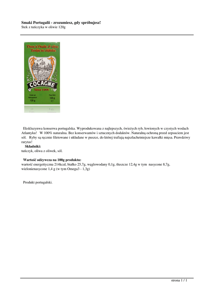 Smaki Portugalii - zrozumiesz, gdy spróbujesz! Stek z tuńczyka w oliwie 120g Ekskluzynwa konserwa portugalska. Wyprodukowana z najlepszych, świeżych ryb, łowionych w czystych wodach Atlantyku! W 100% naturalna. Bez konserwantów i sztucznych dodaktów. Naturalną ochroną przed zepsuciem jest sól. Ryby są ręcznie filetowane i układane w puszce, do której trafiają najszlachetniejsze kawałki mięsa. Prawdziwy rarytas! Składniki: tuńczyk, oliwa z oliwek, sól. Wartość odżywcza na 100g produktu: wartość energettyczna 214kcal, białko 25,7g, węglowodany 0,1g, tłuszcze 12,4g w tym nasycone 8,7g, wielonienasycone 1,4 g (w tym Omega3 - 1,3g) Produkt portugalski. strona 1 / 1