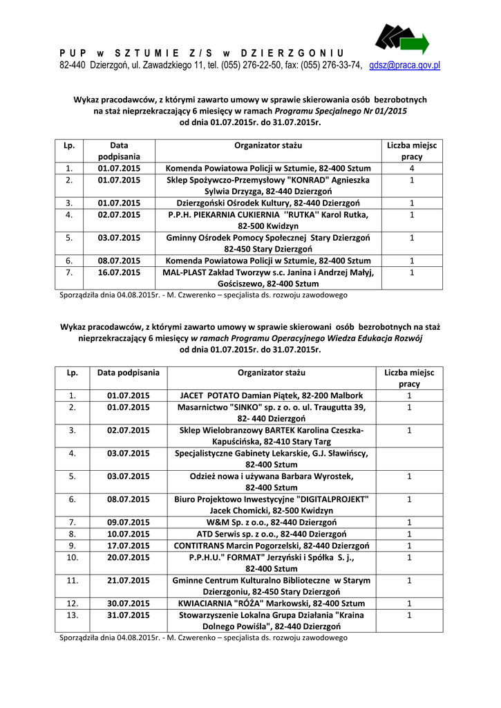 P U P w S Z T U M I E Z / S w D Z I E R Z G O N I U 82-440 Dzierzgoń, ul. Zawadzkiego 11, tel. (055) 276-22-50, fax: (055) 276-33-74, [email protected] Wykaz pracodawców, z którymi zawarto umowy w sprawie skierowania osób bezrobotnych na staż nieprzekraczający 6 miesięcy w ramach Programu Specjalnego Nr 01/2015 od dnia 01.07.2015r. do 31.07.2015r. Lp. 1. 2. Data podpisania 01.07.2015 01.07.2015 3. 4. 01.07.2015 02.07.2015 5. 03.07.2015 6. 7. 08.07.2015 16.07.2015 Organizator stażu Komenda Powiatowa Policji w Sztumie, 82-400 Sztum Sklep Spożywczo-Przemysłowy "KONRAD" Agnieszka Sylwia Drzyzga, 82-440 Dzierzgoń Dzierzgoński Ośrodek Kultury, 82-440 Dzierzgoń P.P.H. PIEKARNIA CUKIERNIA ''RUTKA'' Karol Rutka, 82-500 Kwidzyn Gminny Ośrodek Pomocy Społecznej Stary Dzierzgoń 82-450 Stary Dzierzgoń Komenda Powiatowa Policji w Sztumie, 82-400 Sztum MAL-PLAST Zakład Tworzyw s.c. Janina i Andrzej Małyj, Gościszewo, 82-400 Sztum Liczba miejsc pracy 4 1 1 1 1 1 1 Sporządziła dnia 04.08.2015r. - M. Czwerenko – specjalista ds. rozwoju zawodowego Wykaz pracodawców, z którymi zawarto umowy w sprawie skierowani osób bezrobotnych na staż nieprzekraczający 6 miesięcy w ramach Programu Operacyjnego Wiedza Edukacja Rozwój od dnia 01.07.2015r. do 31.07.2015r. Lp. Data podpisania Organizator stażu 1. 2. 01.07.2015 01.07.2015 3. 02.07.2015 4. 03.07.2015 5. 03.07.2015 6. 08.07.2015 7. 8. 9. 10. 09.07.2015 10.07.2015 17.07.2015 20.07.2015 11. 21.07.2015 12. 13. 30.07.2015 31.07.2015 JACET POTATO Damian Piątek, 82-200 Malbork Masarnictwo "SINKO" sp. z o. o. ul. Traugutta 39, 82- 440 Dzierzgoń Sklep Wielobranzowy BARTEK Karolina CzeszkaKapuścińska, 82-410 Stary Targ Specjalistyczne Gabinety Lekarskie, G.J. Sławińscy, 82-400 Sztum Odzież nowa i używana Barbara Wyrostek, 82-400 Sztum Biuro Projektowo Inwestycyjne "DIGITALPROJEKT" Jacek Chomicki, 82-500 Kwidzyn W&M Sp. z o.o., 82-440 Dzierzgoń ATD Serwis sp. z o.o., 82-440 Dzierzgoń CONTITRANS Marcin Pogorzelski, 82-440 Dzierzgoń P.P.H.U." FORMAT" Jerzyński i Spółka S. j., 82-400 Sztum Gminne Centrum Kulturalno Biblioteczne w Starym Dzierzgoniu, 82-450 Stary Dzierzgoń KWIACIARNIA "RÓŻA" Markowski, 82-400 Sztum Stowarzyszenie Lokalna Grupa Działania "Kraina Dolnego Powiśla", 82-440 Dzierzgoń Sporządziła dnia 04.08.2015r. - M. Czwerenko – specjalista ds. rozwoju zawodowego Liczba miejsc pracy 1 1 1 1 1 1 1 1 1 1 1 1 Wykaz pracodawców, z którymi zawarto umowy w sprawie skierowania osób bezrobotnych na staż nieprzekraczający sześć miesięcy w ramach „Programu aktywizacji zawodowej dla osób będących w szczególnej sytuacji na rynku pracy określonych w art. 49 ustawy o promocji zatrudnienia i instytucjach rynku pracy” finansowanego ze środków Funduszu Pracy z Rezerwy Ministra Pracy Polityki Społecznej od dnia 01.07.2015r. do 31.07.2015r. Lp. 1. Data podpisania 09.07.2015 2. 09.07.2015 3. 15.07.2015 4. 15.07.2015 5. 17.07.2015 Organizator stażu P. H. U "ADIPOL" Zakład pakowania Jaj - Hurtownia Jaj, Grzegorz Kamiński, Kraśniewo, 82-200 Malbork Biuro Projektowo Inwestycyjne "DIGITALPROJEKT" Jacek Chomicki, 82-500 Kwidzyn Gabinet Fizjoterapeutyczny "OLIWIA" Anita Góral, 82-440 Dzierzgoń eMGrow Monika Grochalska, Os.Westerplatte 64, 82- 440 Dzierzgoń Usługi Budowlane Instal. sanit. ,c.o. i gaz H. Mioduński, 82-440 Dzierzgoń Liczba miejsc pracy 1 1 1 1 1 Sporządziła dnia 04.08.2015r. - M. Czwerenko – specjalista ds. rozwoju zawodowego Wykaz pracodawców, z którymi zawarto umowy w sprawie skierowania osób bezrobotnych na staż nieprzekraczający 6 miesięcy w ramach środków Funduszu Pracy od dnia 01.07.2015r. do 31.07.2015r. Lp. 1. Data podpisania 29.07.2015 Organizator stażu Powiatowy Urząd Pracy w Sztumie z/s Dzierzgoń Sporządziła dnia 04.08.2015r. - M. Czwerenko – specjalista ds. rozwoju zawodowego Liczba miejsc pracy 1