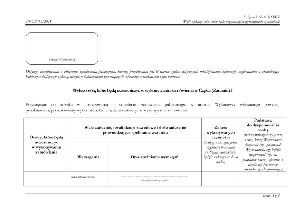 Załącznik Nr 6 do SIWZ Wzór wykazu osób, które będą uczestniczyć w wykonywaniu zamówienia 10/GDOŚ/2015 Pieczęć Wykonawcy Dotyczy: postępowania o udzielenie zamówienia publicznego, którego przedmiotem jest Wsparcie zadań dotyczących udostępniania informacji, uzupełniania i aktualizacji Publicznie dostępnego wykazu danych o dokumentach zawierających informacje o środowisku i jego ochronie. Wykaz osób, które będą uczestniczyć w wykonywaniu zamówienia w Części (Zadaniu) I Przystępując do udziału w postępowaniu o udzielenie zamówienia publicznego, w przedstawiam/przedstawiamy wykaz osób, które będą uczestniczyć w wykonywaniu zamówienia: Osoby, które będą uczestniczyć w wykonywaniu zamówienia Wykształcenie, kwalifikacje zawodowe i doświadczenie potwierdzające spełnianie warunku Wymagania wykształcenie wyższe Opis spełniania wymagań imieniu Wykonawcy Zakres wykonywanych czynności (należy wskazać, jakie czynności w ramach realizacji zamówienia będzie wykonywać dana osoba) wskazanego powyżej, Podstawa do dysponowania osobą (należy wskazać czy jest to osoba, którą Wykonawca dysponuje (np. pracownik Wykonawcy), czy będzie dysponował (np. na podstawie umowy zlecenia, o dzieło czy też innego stosunku cywilnoprawnego) ……………………………………………………………………………….. Należy podać posiadane wykształcenie Strona 1 z 4 Załącznik Nr 6 do SIWZ Wzór wykazu osób, które będą uczestniczyć w wykonywaniu zamówienia 10/GDOŚ/2015 Osoby, które będą uczestniczyć w wykonywaniu zamówienia Wykształcenie, kwalifikacje zawodowe i doświadczenie potwierdzające spełnianie warunku Wymagania co najmniej 18-miesięczne doświadczenie w wykonywaniu prac biurowych, polegających w szczególności na redagowaniu pism, notatek i innych dokumentów, rejestrowaniu pism w rejestrach elektronicznych i papierowych, gromadzeniu i klasyfikowaniu dokumentów, udzielaniu informacji i obsłudze klientów, kopiowaniu oraz skanowaniu dokumentów, obsłudze urządzeń biurowych kopiarka, faks, skaner oraz obsłudze programów pakietu Microsoft Office, w tym przede wszystkim programów Word i Excel) znajomość ustawy z dnia 3 października 2008 r. udostępnianiu informacji o środowisku i jego ochronie, udziale społeczeństwa w ochronie środowiska oraz o ocenach oddziaływania na środowisko (Dz. U. z 2013 r. poz. 1235, z późn. zm.) Opis spełniania wymagań Zakres wykonywanych czynności (należy wskazać, jakie czynności w ramach realizacji zamówienia będzie wykonywać dana osoba) Podstawa do dysponowania osobą (należy wskazać czy jest to osoba, którą Wykonawca dysponuje (np. pracownik Wykonawcy), czy będzie dysponował (np. na podstawie umowy zlecenia, o dzieło czy też innego stosunku cywilnoprawnego) Okresy poświadczające doświadczenie: ……………………………………. (od dd/mm/rrrr – do dd/mm/rrrr) ……………………………………. (od dd/mm/rrrr – do dd/mm/rrrr) ……………………………………………………….. ……………………………………………………….. ……………………………………………………….. Należy podać zakres wykonywanych prac potwierdzających spełnienie warunku Tak/Nie* (niepotrzebne skreślić) Strona 2 z 4 Załącznik Nr 6 do SIWZ Wzór wykazu osób, które będą uczestniczyć w wykonywaniu zamówienia 10/GDOŚ/2015 Osoby, które będą uczestniczyć w wykonywaniu zamówienia Wykształcenie, kwalifikacje zawodowe i doświadczenie potwierdzające spełnianie warunku Wymagania Opis spełniania wymagań znajomość ustawy z dnia 6 września 2001 r. o dostępie do informacji publicznej (Dz. U. z 2014 r. poz. 782) (niepotrzebne skreślić) znajomość rozporządzenia Ministra Środowiska z dnia 22 września 2010 r. w sprawie wzoru oraz zawartości i układu publicznie dostępnego wykazu danych o dokumentach zawierających informacje o środowisku i jego ochronie (Dz. U. Nr 186, poz. 1249) znajomość rozporządzenia Ministra Środowiska z dnia 12 listopada 2010 r. w sprawie opłat za udostępnianie informacji o środowisku (Dz. U. Nr 215, poz. 1415) Zakres wykonywanych czynności (należy wskazać, jakie czynności w ramach realizacji zamówienia będzie wykonywać dana osoba) Podstawa do dysponowania osobą (należy wskazać czy jest to osoba, którą Wykonawca dysponuje (np. pracownik Wykonawcy), czy będzie dysponował (np. na podstawie umowy zlecenia, o dzieło czy też innego stosunku cywilnoprawnego) Tak/Nie* Tak/Nie* (niepotrzebne skreślić) Tak/Nie* (niepotrzebne skreślić) Strona 3 z 4 Załącznik Nr 6 do SIWZ Wzór wykazu osób, które będą uczestniczyć w wykonywaniu zamówienia 10/GDOŚ/2015 Wykształcenie, kwalifikacje zawodowe i doświadczenie potwierdzające spełnianie warunku Osoby, które będą uczestniczyć w wykonywaniu zamówienia Wymagania Opis spełniania wymagań znajomość rozporządzenia Ministra Środowiska z dnia 23 listopada 2010 r. w sprawie sposobu i częstotliwości aktualizacji informacji o środowisku (Dz. U. Nr 227, poz. 1485) (niepotrzebne skreślić) bardzo dobra znajomość środowiska Windows oraz pakietu MS Office, (niepotrzebne skreślić) Zakres wykonywanych czynności (należy wskazać, jakie czynności w ramach realizacji zamówienia będzie wykonywać dana osoba) Podstawa do dysponowania osobą (należy wskazać czy jest to osoba, którą Wykonawca dysponuje (np. pracownik Wykonawcy), czy będzie dysponował (np. na podstawie umowy zlecenia, o dzieło czy też innego stosunku cywilnoprawnego) Tak/Nie* Tak/Nie* _____, ____________________ data miejscowość _______________________________ podpis i pieczęć osoby upoważnionej / podpisy i pieczęcie osób upoważnionych do reprezentowania Wykonawcy Strona 4 z 4