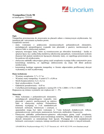 Trampolina Circle 90 nr katalogowy 7232101 Opis Trampolina przeznaczona do stosowania na placach zabaw o intensywnym użytkowaniu. Jej instalacja jak i utrzymanie są bardzo proste. Urządzenie zawiera: maty wykonane z praktycznie niezniszczalnych poliamidowych elementów, posiadających antypoślizgowe wypustki (nie plecionki z pasów), nawleczonych na stalowe linki w elastycznej otulinie, sprężyny mocujące maty, które są rozmieszczone po obwodzie konstrukcji - każda ze sprężyn łączy się z jedną linką metalową zakończoną specjalnym, wzmocnionym oczkiem (kausza) lub prętem metalowym łączącym elementy maty, co zapobiega przecieraniu się lin podczas ich użytkowania, elastyczne nakładki zakrywające górną część urządzenia wystając kilka centymetrów poza konstrukcję metalową, co zapobiega zakleszczeniu się stopy lub dłoni podczas użytkowania, konstrukcję każdego segmentu trampoliny w formie odpowiednio profilowanej skrzyni wykonanej ze stali ocynkowanej. Dane techniczne Wymiary urządzenia: 3,7 x 3,7 m Wymiary maty trampoliny: 4 sztuk 0,71 x 0,96 m Strefa bezpieczeństwa: 6,2 x 6,2 m Ilość użytkowników: 8 osób Głębokość posadowienia: - 0,45 m Certyfikat potwierdzający zgodność z normą EN 1176-1:2008 i 1176-11:2008 Dopuszcza się różnice wymiarów nie większe niż +/– 5% Materiały Mata wykonana z poliamidowych elementów, posiadających antypoślizgowe wypustki, (nie plecionki z pasów), nawleczonych na stalowe linki w elastycznej otulinie. Poliamidowe elementy występują w 3-ch standardowych kolorach: zielonym, fioletowym i czarnym, a opcjonalnie mogą być także wykonane w 7-miu kolorach dodatkowych: żółtym, pomarańczowym, czerwonym, jasnoszarym, beżowym, niebieskim i brązowym; Elastyczna nakładka poliuretanowo-gumowa zakrywająca górną część urządzenia, wystająca kilka centymetrów poza konstrukcję metalową. Nakładka składa się z czterech dużych elementów co minimalizuje ilość łączeń. Występuje w 2-ch standardowych kolorach: czerwonym i czarnym, istnieje możliwość wykonania także w innych kolorach; LINARIUM ul. Przybyszewskiego 19/2, 71-277 Szczecin, tel. +48 91 422 33 99, www.linarium.com.pl Konstrukcja w postaci kwadratowej metalowej skrzyni wykonana ze stali ocynkowanej. Rysunki techniczne Sposób mocowania maty do konstrukcji Schemat posadowienia trampoliny LINARIUM ul. Przybyszewskiego 19/2, 71-277 Szczecin, tel. +48 91 422 33 99, www.linarium.com.pl