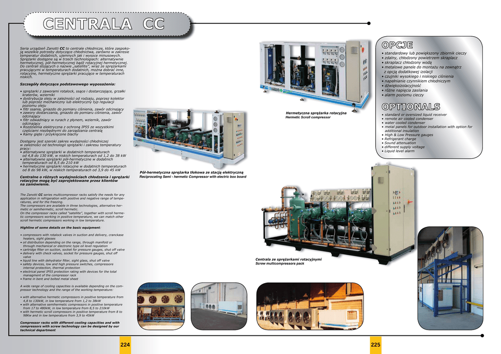 CENTRALA CC OPCJE Seria urządzeń Zanotti CC to centrale chłodnicze, które zaspokoją wszelkie potrzeby dotyczące chłodnictwa, zarówno w zakresie temperatur dodatnich, ujemnych jak i wysoce minusowych. Sprężarki dostępne są w trzech technologiach: alternatywnie hermetycznej, pół-hermetycznej bądź rotacyjnej hermetycznej. Do centrali stojących o nazwie „satellite”, wraz ze sprężarkami pracującymi w temperaturach dodatnich, można dobrać inne, rotacyjne, hermetyczne sprężarki pracujące w temperaturach niskich. • • • • standardowy lub powiększony zbiornik cieczy zdalny, chłodzony powietrzem skraplacz skraplacz chłodzony wodą metalowe panele do montażu na zewnątrz z opcją dodatkowej izolacji • czujniki wysokiego i niskiego ciśnienia • napełnianie czynnikiem chłodniczym • dźwiękoizolacyjność • różne napięcia zasilania • alarm poziomu cieczy Szczegóły dotyczące podstawowego wyposażenia: • sprężarki z zaworami rotalock, ssące i dostarczające, grzałki kraterów, wzierniki • dystrybucja oleju w zależności od rodzaju, poprzez kolektor lub poprzez mechaniczny lub elektryczny typ regulacji poziomu oleju • filtr ssania, gniazdo do pomiaru ciśnienia, zawór odcinający • zawory dostarczania, gniazdo do pomiaru ciśnienia, zawór odcinający • filtr odwadniący w rurach z płynem, wziernik, zawór odcinający • Rozdzielnia elektryczna z ochroną IP55 ze wszystkimi częściami niezbędnymi do zarządzania centralą • Ramy gięte i przykręcone blachy Dostępny jest szeroki zakres wydajności chłodniczej w zależności od technologii sprężarki i zakresu temperatury pracy: • alternatywne sprężarki w dodatnich temperaturach od 4,8 do 130 kW, w niskich temperaturach od 1,2 do 38 kW • alternatywne sprężarki pół-hermetyczne w dodatnich temperaturach od 8,5 do 210 kW • hermetyczne sprężarki rotacyjne w dodatnich temperaturach od 8 do 98 kW, w niskich temperaturach od 3,9 do 45 kW Centralne o różnych wydajnościach chłodzenia i sprężarki rotacyjne mogą być zaprojektowane przez klientów na zamówienie. OPTIONALS Hermetyczna sprężarka rotacyjna • • • • • • • • • Pół-hermetyczna sprężarka tłokowa ze stacją elektryczną Reciprocating Semi - hermetic Compressor with electric box board The Zanotti CC series multicompressor racks satisfy the needs for any application in refrigeration with positive and negative range of temperatures, and for the freezing. The compressors are available in three technologies, alternative hermetic or semihermetic, scroll hermetic. On the compressor racks called “satellite”, together with scroll hermetic compressors working in positive temperature, we can match other scroll hermetic compressors working in low temperature. Highline of some details on the basic equipment: • compressors with rotalock valves in suction and delivery, cranckase heaters, sight glasses • oil distribution depending on the range, through manifold or through mechanical or electronic type oil level regulation • cartridge filter on suction, socket for pressure gauges, shut off valve • delivery with check valves, socket for pressure gauges, shut off valve • liquid line with dehydrator filter, sight glass, shut off valve • safety devices, low and high pressure switches, compressore internal protection, thermal protection • electrical panel IP55 protection rating with devices for the total managment of the compressor rack • frame in bent and bolted metal sheet Centrala ze sprężarkami rotacyjnymi Screw ew multicompressors pack A wide range of cooling capacities is available depending on the compressor technology and the range of the working temperature: • with alternative hermetic compressors in positive temperature from 4,8 to 130kW, in low temperature from 1,2 to 38kW • with alternative semihermetic compressors in positive temperature from 17 to 480kW, in low temperature from 8,5 to 210kW • with hermetic scroll compressors in positive temperature from 8 to 98Kw and in low temperature from 3,9 to 45kW Compressor racks with different cooling capacities and with compressors with screw technology can be designed by our technical department 224 225 standard or oversized liquid receiver remote air cooled condenser water cooled condenser metal panels for outdoor installation with option for additional insulation High & Low Pressure gauges Refrigerant charge Sound attenuation different supply voltage Liquid level alarm