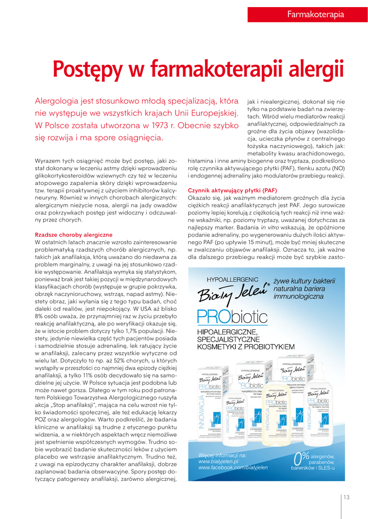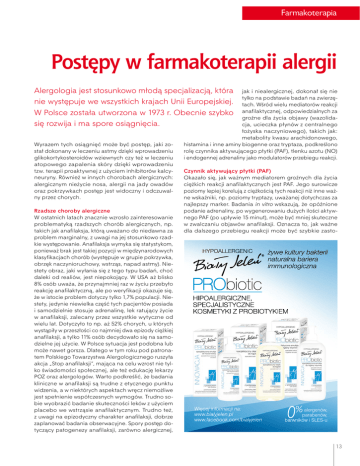 Farmakoterapia Postępy w farmakoterapii alergii Alergologia jest stosunkowo młodą specjalizacją, która jak i niealergicznej, dokonał się nie tylko na podstawie badań na zwierzęnie występuje we wszystkich krajach Unii Europejskiej. tach. Wśród wielu mediatorów reakcji W Polsce została utworzona w 1973 r. Obecnie szybko anafilaktycznej, odpowiedzialnych za groźne dla życia objawy (wazolidasię rozwija i ma spore osiągnięcia. cja, ucieczka płynów z centralnego łożyska naczyniowego), takich jak: metabolity kwasu arachidonowego, Wyrazem tych osiągnięć może być postęp, jaki zohistamina i inne aminy biogenne oraz tryptaza, podkreślono stał dokonany w leczeniu astmy dzięki wprowadzeniu rolę czynnika aktywującego płytki (PAF), tlenku azotu (NO) glikokortykosteroidów wziewnych czy też w leczeniu i endogennej adrenaliny jako modulatorów przebiegu reakcji. atopowego zapalenia skóry dzięki wprowadzeniu tzw. terapii proaktywnej z użyciem inhibitorów kalcyCzynnik aktywujący płytki (PAF) neuryny. Również w innych chorobach alergicznych: Okazało się, jak ważnym mediatorem groźnych dla życia alergicznym nieżycie nosa, alergii na jady owadów ciężkich reakcji anafilaktycznych jest PAF. Jego surowicze oraz pokrzywkach postęp jest widoczny i odczuwalpoziomy lepiej korelują z ciężkością tych reakcji niż inne ważny przez chorych. ne wskaźniki, np. poziomy tryptazy, uważanej dotychczas za najlepszy marker. Badania in vitro wskazują, że opóźnione Rzadsze choroby alergiczne podanie adrenaliny, po wygenerowaniu dużych ilości aktywW ostatnich latach znacznie wzrosło zainteresowanie nego PAF (po upływie 15 minut), może być mniej skuteczne swiatfarmacji.pdf 21-06-13 13:47:59 problematyką rzadszych chorób alergicznych, np. w zwalczaniu objawów anafilaksji. Oznacza to, jak ważne takich jak anafilaksja, którą uważano do niedawna za dla dalszego przebiegu reakcji może być szybkie zastoproblem marginalny, z uwagi na jej stosunkowo rzadkie występowanie. Anafilaksja wymyka się statystykom, ponieważ brak jest takiej pozycji w międzynarodowych klasyfikacjach chorób (występuje w grupie pokrzywka, obrzęk naczynioruchowy, wstrząs, napad astmy). Niestety obraz, jaki wyłania się z tego typu badań, choć daleki od realiów, jest niepokojący. W USA aż blisko 8% osób uważa, że przynajmniej raz w życiu przebyło reakcję anafilaktyczną, ale po weryfikacji okazuje się, że w istocie problem dotyczy tylko 1,7% populacji. Niestety, jedynie niewielka część tych pacjentów posiada i samodzielnie stosuje adrenalinę, lek ratujący życie w anafilaksji, zalecany przez wszystkie wytyczne od wielu lat. Dotyczyło to np. aż 52% chorych, u których wystąpiły w przeszłości co najmniej dwa epizody ciężkiej anafilaksji, a tylko 11% osób decydowało się na samodzielne jej użycie. W Polsce sytuacja jest podobna lub może nawet gorsza. Dlatego w tym roku pod patronatem Polskiego Towarzystwa Alergologicznego ruszyła akcja „Stop anafilaksji”, mająca na celu wzrost nie tylko świadomości społecznej, ale też edukację lekarzy POZ oraz alergologów. Warto podkreślić, że badania kliniczne w anafilaksji są trudne z etycznego punktu widzenia, a w niektórych aspektach wręcz niemożliwe jest spełnienie współczesnych wymogów. Trudno sobie wyobrazić badanie skuteczności leków z użyciem placebo we wstrząsie anafilaktycznym. Trudno też, z uwagi na epizodyczny charakter anafilaksji, dobrze zaplanować badania obserwacyjne. Spory postęp dotyczący patogenezy anafilaksji, zarówno alergicznej, C M Y CM MY CY CMY K 13 Farmakoterapia sowanie adrenaliny, co umożliwiają przecież autostrzykawki lub ampułkostrzykawki, posiadane przez chorego właśnie w celu bezzwłocznego podania po wystąpieniu pierwszych objawów. Naturalna inaktywacja i, co za tym idzie, surowicze stężenia PAF zależą w głównej mierze od enzymu – acetylohydrolazy PAF. Enzym ten jest zdolny do konwersji aktywnego PAF do postaci nieaktywnej (lyso-PAF). Osoby z osłabioną aktywnością tego enzymu nie są w stanie właściwie reagować na powstawanie nadmiernych ilości PAF, przez co mogą być obarczone szczególnym ryzykiem jego działania w dużych stężeniach. Takie wnioski wynikają z badań ludzi z ciężką anafilaksją na orzeszki ziemne. Aktywność acetylohydrolazy PAF może określać indywidualne ryzyko wystąpienia szczególnie ciężkich reakcji u osób z alergią na orzeszki ziemne. Rozpoczęto już badania na zwierzętach mające na celu opracowanie metody leczniczej substytucji niedoboru tego enzymu. Już teraz mamy możliwość terapii anty-PAF. Lekiem takim jest rupatadyna, o potwierdzonym działaniu anty-PAF i jednocześnie blokującym receptor H1 dla histaminy. Mimo że wykazano jej szczególną skuteczność w niektórych postaciach pokrzywki, to jak dotąd nie ma mocnych, przekonujących dowodów klinicznych na jej istotnie lepsze działanie w anafilaksji niż np. leków przeciwhistaminowych. Kinazy, S1P2 (sphingosine-1phosphate receptor 2) i NO (tlenek azotu) Innym ważnym ogniwem patogenezy anafilaksji, które w przyszłości może zostać wykorzystane dla wypracowania nowego kierunku leczenia, jest modulowanie działania kinaz proteinowych, enzymów kontrolujących ważne szlaki wewnątrzkomórkowego przekazywania sygnałów. Przykładem mogą być efekty działania obecnego na komórkach śródbłonka naczyń receptora S1P2. 14 Jego pobudzenie skutkuje blokadą cząsteczek aktywujących kinazy syntez tlenku azotu (NO). Prowadzi to do generowania mniejszych ilości NO, w efekcie czego jego działanie jest słabsze, zatem rozszerzenie (i uszkodzenie) naczyń może być mniejsze. Pobudzenie śródbłonkowego receptora S1P2, skutkujące zmniejszeniem wytwarzania NO, może mieć na tyle istotne znaczenie w ochronie bariery naczyniowej, że poszukuje się tu użytecznych sposobów profilaktyki i leczenia anafilaksji. Obecnie znane są 