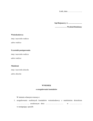 Łódź, dnia ………………….. Sąd Rejonowy w …………………. ………………. Wydział Rodzinny Wnioskodawca imię i nazwisko rodzica adres rodzica Uczestnik postępowania imię i nazwisko rodzica adres rodzica Małoletni imię i nazwisko dziecka adres dziecka WNIOSEK o uregulowanie kontaktów W imieniu własnym wnoszę o: 1. uregulowanie osobistych kontaktów wnioskodawcy z małoletnim dzieckiem ………………, urodzonym dnia ……………………… w następujący sposób: w ………………. a. w każdy wtorek i czwartek od godziny 16.00. do godziny 18.00. poza miejscem zamieszkania małoletniego dziecka …………….. z jednoczesnym obowiązkiem uczestnika do wydania małoletniego dziecka ……………….. wnioskodawcy w miejscu jego zamieszkania oraz obowiązkiem odprowadzenia małoletniego dziecka ……………….. przez wnioskodawcę do miejsca jego zamieszkania; 2. przeprowadzenie następujących dowodów: a. z przesłuchania świadka ………………… (adres zamieszkania świadka: …………………..) na okoliczność więzów łączących małoletnie dziecko z wnioskodawcą oraz przebiegu dotychczasowych kontaktów małoletniego dziecka z wnioskodawcą; b. z fotografii na okoliczność więzów łączących małoletnie dziecko z wnioskodawcą oraz przebiegu dotychczasowych kontaktów małoletniego dziecka z wnioskodawcą; c. opinii Opiniodawczego Zespołu Sądowych Specjalistów na okoliczność ustalenia więzi łączących małoletnie dziecko z wnioskodawcą oraz ustalenia najbardziej optymalnej z punktu widzenia dobra dziecka formy i częstotliwości kontaktów małoletniego dziecka z wnioskodawcą; d. przesłuchania wnioskodawcy w charakterze strony na okoliczność więzów łączących małoletnie dziecko z wnioskodawcą oraz przebiegu dotychczasowych kontaktów małoletniego dziecka z wnioskodawcą; UZASADNIENIE Wnioskodawca i uczestnik postępowania są rodzicami małoletniego dziecka ………………… . Wnioskodawca i uczestnik postępowania od ……………….. nie żyją razem oraz nie prowadzą wspólnie gospodarstwa domowego. Małoletnie dziecko mieszka na stałe z uczestnikiem postępowania. Rodzice małoletniego dziecka nie są w stanie porozumieć się co do sposobu kontaktów małoletniego dziecka z wnioskodawcą. /Dowód: odpis skróconego aktu urodzenia, przesłuchanie świadka, przesłuchanie wnioskodawcy/ Wnioskodawca kocha małoletnie dziecko oraz chce aktywnie uczestniczyć w jego życiu. Uczestnik postępowania zaś uniemożliwia wnioskodawcy regularne kontakty z małoletnim dzieckiem poza jego miejscem zamieszkania. W związku z tym zasadne jest uregulowanie kontaktów małoletniego dziecka z wnioskodawcą w taki sposób, aby w każdy wtorek i czwartek po szkole małoletnie dziecko miało kontakt z wnioskodawcą bez obecności uczestnika. Zapewni to budowanie i umacnianie prawidłowych więzi wnioskodawcy i małoletniego dziecka, co leży w jego interesie. /Dowód: opinia OZSS, przesłuchanie świadka, przesłuchanie wnioskodawcy, fotografie/ W tym stanie rzeczy wnoszę jak na wstępie. -podpis własnoręczny wnioskodawcy- Załączniki: - odpis pisma i załączników; - dowód uiszczenia opłaty sądowej – 40 zł; - odpis skróconego aktu urodzenia; - fotografie;