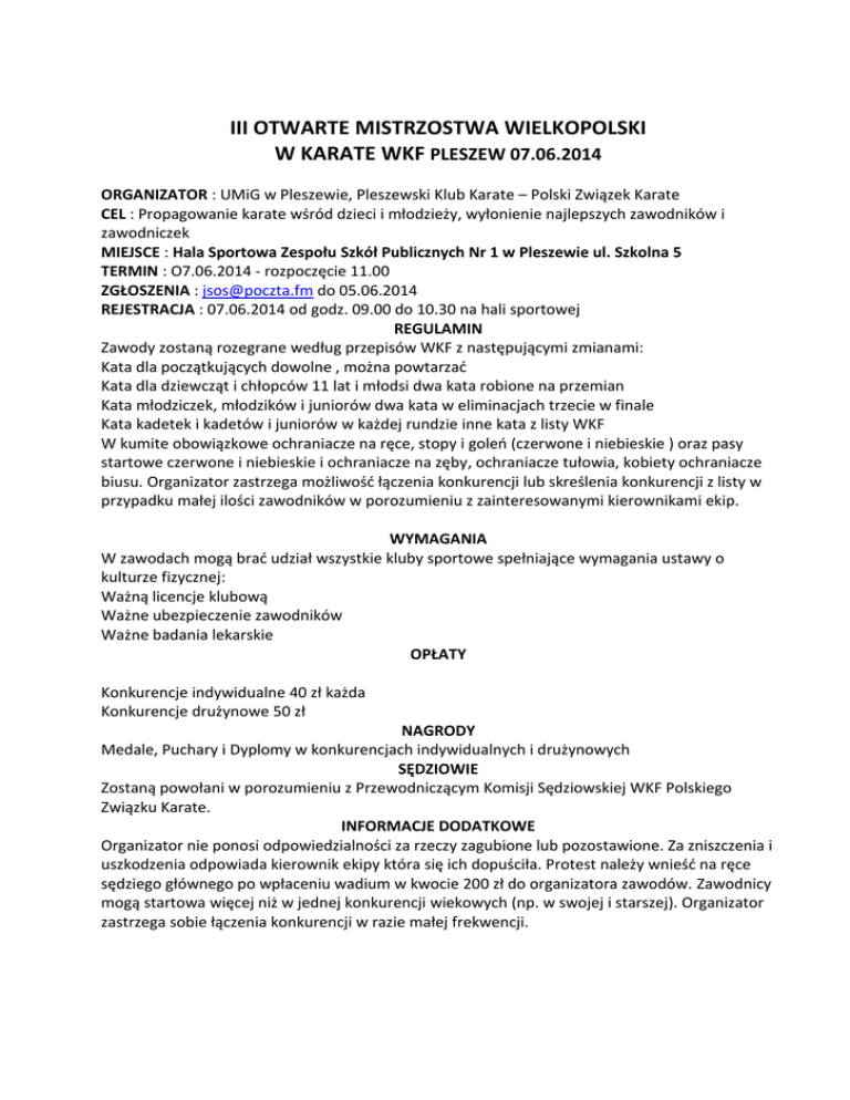 III OTWARTE MISTRZOSTWA WIELKOPOLSKI W KARATE WKF PLESZEW 07.06.2014 ORGANIZATOR : UMiG w Pleszewie, Pleszewski Klub Karate – Polski Związek Karate CEL : Propagowanie karate wśród dzieci i młodzieży, wyłonienie najlepszych zawodników i zawodniczek MIEJSCE : Hala Sportowa Zespołu Szkół Publicznych Nr 1 w Pleszewie ul. Szkolna 5 TERMIN : O7.06.2014 - rozpoczęcie 11.00 ZGŁOSZENIA : [email protected] do 05.06.2014 REJESTRACJA : 07.06.2014 od godz. 09.00 do 10.30 na hali sportowej REGULAMIN Zawody zostaną rozegrane według przepisów WKF z następującymi zmianami: Kata dla początkujących dowolne , można powtarzać Kata dla dziewcząt i chłopców 11 lat i młodsi dwa kata robione na przemian Kata młodziczek, młodzików i juniorów dwa kata w eliminacjach trzecie w finale Kata kadetek i kadetów i juniorów w każdej rundzie inne kata z listy WKF W kumite obowiązkowe ochraniacze na ręce, stopy i goleń (czerwone i niebieskie ) oraz pasy startowe czerwone i niebieskie i ochraniacze na zęby, ochraniacze tułowia, kobiety ochraniacze biusu. Organizator zastrzega możliwość łączenia konkurencji lub skreślenia konkurencji z listy w przypadku małej ilości zawodników w porozumieniu z zainteresowanymi kierownikami ekip. WYMAGANIA W zawodach mogą brać udział wszystkie kluby sportowe spełniające wymagania ustawy o kulturze fizycznej: Ważną licencje klubową Ważne ubezpieczenie zawodników Ważne badania lekarskie OPŁATY Konkurencje indywidualne 40 zł każda Konkurencje drużynowe 50 zł NAGRODY Medale, Puchary i Dyplomy w konkurencjach indywidualnych i drużynowych SĘDZIOWIE Zostaną powołani w porozumieniu z Przewodniczącym Komisji Sędziowskiej WKF Polskiego Związku Karate. INFORMACJE DODATKOWE Organizator nie ponosi odpowiedzialności za rzeczy zagubione lub pozostawione. Za zniszczenia i uszkodzenia odpowiada kierownik ekipy która się ich dopuściła. Protest należy wnieść na ręce sędziego głównego po wpłaceniu wadium w kwocie 200 zł do organizatora zawodów. Zawodnicy mogą startowa więcej niż w jednej konkurencji wiekowych (np. w swojej i starszej). Organizator zastrzega sobie łączenia konkurencji w razie małej frekwencji. KONKURENCJE TRENUJĄCY OD WRZEŚNIA 2013 roku (BIAŁE PASY ) KATA (z podziałem na płeć) Dzieci 7 lat i młodsze (konkurencje: chłopcy - 1, dziewczynki - 2) Dzieci 8-9 lat (konkurencje: chłopcy - 3, dziewczynki - 4) Dzieci 10-11 lat (konkurencje: chłopcy - 5, dziewczynki - 6) KATA INDYWIDUALNE KATA( z podziałem na płeć) Dzieci 7 lat i młodsze (konkurencje: chłopcy - 7, dziewczynki - 8) Dzieci 8-9 lat (konkurencje: chłopcy - 9, dziewczynki - 10) Dzieci 10-11 lat (konkurencje: chłopcy - 11, dziewczynki - 12) Młodzicy12-13 lat (konkurencje: młodzicy -13, młodziczki -14) Juniorzy młodsi 14-15 lat (konkurencje: juniorzy mł. - 15, juniorki mł. - 16) Junior 16-17 (konkurencje: juniorzy – 17, juniorki -18) KATA DRUŻYNOWE 19. Kata drużynowe chłopców 11 lat i młodsi 20. Kata drużynowe dziewcząt 11 lat młodsze 21. Kata drużynowe młodzików i juniorów mł., juniorów 22. Kata drużynowe młodziczek i juniorek mł. Juniorek. KUMITE INDYWIDUALNE 23. Kumite ind chłopców 9 lat i młodsi -30kg, +30kg 25. Kumite ind chłopców 10-11 lat -40kg, +40kg 27. Kumite ind młodzików -45kg, - 50kg, +50kg 29. Kumite ind juniorów młodszych -52kg, - 60kg, +60kg 31. Kumite ind. juniorów -60kg, +60kg 24. Kumite ind. dziewcząt 9 lat i młodsze -30kg, + 30kg 26. Kumite ind dziewcząt 10 -11 lat -35kg, +35kg 28. Kumite ind młodziczek -45kg, + 45kg 30. Kumite ind juniorek młodszych -54 kg, +54kg. 32. Kumite ind. juniorek -55kg, +55kg Czas walki: 9 lat i młodsi oraz 10 – 11 lat - 60 sek, dla pozostałych grup wiekowych 90 sekund. KARTA ZGŁOSZENIOWA KLUB .............................................................................. TRENER ......................................................................... ADRES ............................................................................ KIEROWNIK EKIPY ..................................................... LP Nazwisko i imię Data urodzenia Nr konkurencji kata Nr konkurencji kumite + waga