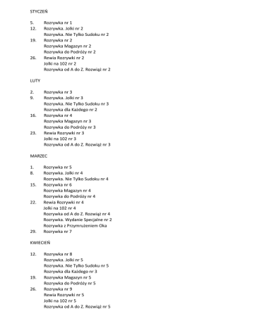 STYCZEŃ 5. 12. 19. 26. Rozrywka nr 1 Rozrywka. Jolki nr 2 Rozrywka. Nie Tylko Sudoku nr 2 Rozrywka nr 2 Rozrywka Magazyn nr 2 Rozrywka do Podróży nr 2 Rewia Rozrywki nr 2 Jolki na 102 nr 2 Rozrywka od A do Z. Rozwiąż nr 2 LUTY 2. 9. 16. 23. Rozrywka nr 3 Rozrywka. Jolki nr 3 Rozrywka. Nie Tylko Sudoku nr 3 Rozrywka dla Każdego nr 2 Rozrywka nr 4 Rozrywka Magazyn nr 3 Rozrywka do Podróży nr 3 Rewia Rozrywki nr 3 Jolki na 102 nr 3 Rozrywka od A do Z. Rozwiąż nr 3 MARZEC 1. 8. 15. 22. 29. Rozrywka nr 5 Rozrywka. Jolki nr 4 Rozrywka. Nie Tylko Sudoku nr 4 Rozrywka nr 6 Rozrywka Magazyn nr 4 Rozrywka do Podróży nr 4 Rewia Rozrywki nr 4 Jolki na 102 nr 4 Rozrywka od A do Z. Rozwiąż nr 4 Rozrywka. Wydanie Specjalne nr 2 Rozrywka z Przymrużeniem Oka Rozrywka nr 7 KWIECIEŃ 12. 19. 26. Rozrywka nr 8 Rozrywka. Jolki nr 5 Rozrywka. Nie Tylko Sudoku nr 5 Rozrywka dla Każdego nr 3 Rozrywka Magazyn nr 5 Rozrywka do Podróży nr 5 Rozrywka nr 9 Rewia Rozrywki nr 5 Jolki na 102 nr 5 Rozrywka od A do Z. Rozwiąż nr 5 MAJ 10. 17. 24. 31. Rozrywka nr 10 Rozrywka. Jolki nr 6 Rozrywka. Nie Tylko Sudoku nr 6 Rozrywka nr 11 Rozrywka Magazyn nr 6 Rozrywka do Podróży nr 6 Rewia Rozrywki nr 6 Jolki na 102 nr 6 Rozrywka od A do Z. Rozwiąż nr 6 Rozrywka. Wydanie Specjalne nr 3 CZERWIEC 7. 14. 21. 28. Rozrywka nr 12 Rozrywka. Jolki nr 7 Rozrywka. Nie Tylko Sudoku nr 7 Rozrywka dla Każdego nr 4 Rozrywka nr 13 Rozrywka Magazyn nr 7 Rozrywka do Podróży nr 7 Rewia Rozrywki nr 7 Jolki na 102 nr 7 Rozrywka od A do Z. Rozwiąż nr 7 Krzyżówki na Lato LIPIEC 5. 12. 19. 26. Rozrywka nr 14 Rozrywka. Jolki nr 8 Rozrywka. Nie Tylko Sudoku nr 8 Rozrywka nr 15 Rozrywka Magazyn nr 8 Rozrywka do Podróży nr 8 Rewia Rozrywki nr 8 Jolki na 102 nr 8 Rozrywka od A do Z. Rozwiąż nr 8 SIERPIEŃ 2. 16. 23. 30. Rozrywka nr 16 Rozrywka nr 17 Rozrywka. Jolki nr 9 Rozrywka. Nie Tylko Sudoku nr 9 Rozrywka dla Każdego nr 5 Rozrywka. Wydanie Specjalne nr 4 Rozrywka Magazyn nr 9 Rozrywka do Podróży nr 9 Rozrywka nr 18 Rewia Rozrywki nr 9 Jolki na 102 nr 9 Rozrywka od A do Z. Rozwiąż nr 9 WRZESIEŃ 13. 20. 27. Rozrywka nr 19 Rozrywka. Jolki nr 10 Rozrywka. Nie Tylko Sudoku nr 10 Rozrywka Magazyn nr 10 Rozrywka do Podróży nr 10 Rozrywka nr 20 Rewia Rozrywki nr 10 Jolki na 102 nr 10 Rozrywka od A do Z. Rozwiąż nr 10 PAŹDZIERNIK 11. 18. 25. Rozrywka nr 21 Rozrywka. Jolki nr 11 Rozrywka. Nie Tylko Sudoku nr 11 Rozrywka dla Każdego nr 6 Jolki na Cały Rok Rozrywka Magazyn nr 11 Rozrywka do Podróży nr 11 Rozrywka nr 22 Rewia Rozrywki nr 11 Jolki na 102 nr 11 Rozrywka od A do Z. Rozwiąż nr 11 LISTOPAD 8. 15. 22. 29. Rozrywka nr 23 Rozrywka. Jolki nr 12 Rozrywka. Nie Tylko Sudoku nr 12 Rozrywka nr 24 Rozrywka Magazyn nr 12 Rozrywka do Podróży nr 12 Rewia Rozrywki nr 12 Jolki na 102 nr 12 Rozrywka od A do Z. Rozwiąż nr 12 GRUDZIEŃ 6. 20. Rozrywka nr 25 Rozrywka. Jolki nr 1/2017 Rozrywka. Nie Tylko Sudoku nr 1/2017 Rozrywka dla Każdego nr 1/2017 Rozrywka. Wydanie Specjalne nr 1/2017 Rozrywka nr 26 Rozrywka Magazyn nr 1/2017 Rozrywka do Podróży nr 1/2017 Rewia Rozrywki nr 1/2017 Jolki na 102 nr 1/2017 Rozrywka od A do Z. Rozwiąż nr 1/2017