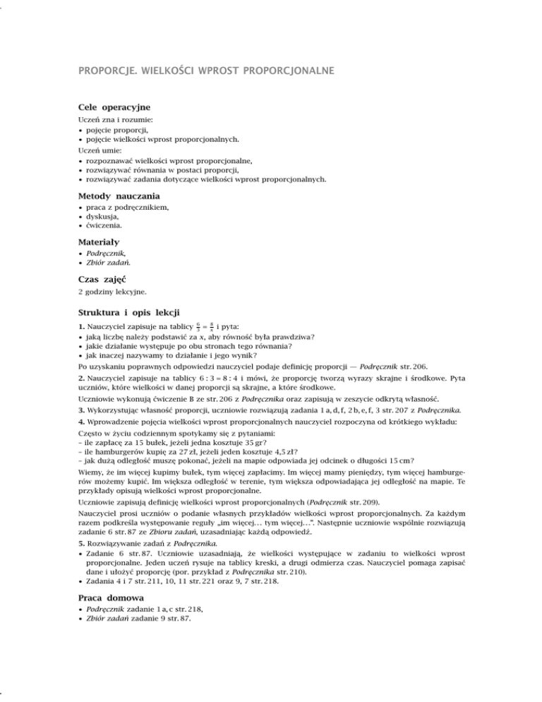 PROPORCJE. WIELKOŚCI WPROST PROPORCJONALNE Cele operacyjne Uczeń zna i rozumie: • pojęcie proporcji, • pojęcie wielkości wprost proporcjonalnych. Uczeń umie: • rozpoznawać wielkości wprost proporcjonalne, • rozwiązywać równania w postaci proporcji, • rozwiązywać zadania dotyczące wielkości wprost proporcjonalnych. Metody nauczania • praca z podręcznikiem, • dyskusja, • ćwiczenia. Materiały • Podręcznik, • Zbiór zadań. Czas zajęć 2 godziny lekcyjne. Struktura i opis lekcji 1. Nauczyciel zapisuje na tablicy 6 3 = 8 x i pyta: • jaką liczbę należy podstawić za x, aby równość była prawdziwa? • jakie działanie występuje po obu stronach tego równania? • jak inaczej nazywamy to działanie i jego wynik? Po uzyskaniu poprawnych odpowiedzi nauczyciel podaje definicję proporcji — Podręcznik str. 206. 2. Nauczyciel zapisuje na tablicy 6 : 3 = 8 : 4 i mówi, że proporcję tworzą wyrazy skrajne i środkowe. Pyta uczniów, które wielkości w danej proporcji są skrajne, a które środkowe. Uczniowie wykonują ćwiczenie B ze str. 206 z Podręcznika oraz zapisują w zeszycie odkrytą własność. 3. Wykorzystując własność proporcji, uczniowie rozwiązują zadania 1 a, d, f, 2 b, e, f, 3 str. 207 z Podręcznika. 4. Wprowadzenie pojęcia wielkości wprost proporcjonalnych nauczyciel rozpoczyna od krótkiego wykładu: Często w życiu codziennym spotykamy się z pytaniami: – ile zapłacę za 15 bułek, jeżeli jedna kosztuje 35 gr? – ile hamburgerów kupię za 27 zł, jeżeli jeden kosztuje 4,5 zł? – jak dużą odległość muszę pokonać, jeżeli na mapie odpowiada jej odcinek o długości 15 cm? Wiemy, że im więcej kupimy bułek, tym więcej zapłacimy. Im więcej mamy pieniędzy, tym więcej hamburgerów możemy kupić. Im większa odległość w terenie, tym większa odpowiadająca jej odległość na mapie. Te przykłady opisują wielkości wprost proporcjonalne. Uczniowie zapisują definicję wielkości wprost proporcjonalnych (Podręcznik str. 209). Nauczyciel prosi uczniów o podanie własnych przykładów wielkości wprost proporcjonalnych. Za każdym razem podkreśla występowanie reguły „im więcej. . . tym więcej. . .”. Następnie uczniowie wspólnie rozwiązują zadanie 6 str. 87 ze Zbioru zadań, uzasadniając każdą odpowiedź. 5. Rozwiązywanie zadań z Podręcznika. • Zadanie 6 str. 87. Uczniowie uzasadniają, że wielkości występujące w zadaniu to wielkości wprost proporcjonalne. Jeden uczeń rysuje na tablicy kreski, a drugi odmierza czas. Nauczyciel pomaga zapisać dane i ułożyć proporcję (por. przykład z Podręcznika str. 210). • Zadania 4 i 7 str. 211, 10, 11 str. 221 oraz 9, 7 str. 218. Praca domowa • Podręcznik zadanie 1 a, c str. 218, • Zbiór zadań zadanie 9 str. 87.
