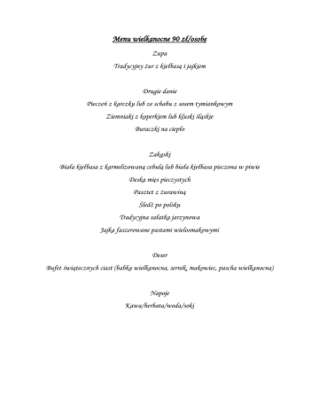 Menu wielkanocne 90 zł/osobę Zupa Tradycyjny żur z kiełbasą i jajkiem Drugie danie Pieczeń z karczku lub ze schabu z sosem tymiankowym Ziemniaki z koperkiem lub kluski śląskie Buraczki na ciepło Zakąski Biała kiełbasa z karmelizowaną cebulą lub biała kiełbasa pieczona w piwie Deska mięs pieczystych Pasztet z żurawiną Śledź po polsku Tradycyjna sałatka jarzynowa Jajka faszerowane pastami wielosmakowymi Deser Bufet świątecznych ciast (babka wielkanocna, sernik, makowiec, pascha wielkanocna) Napoje Kawa/herbata/woda/soki