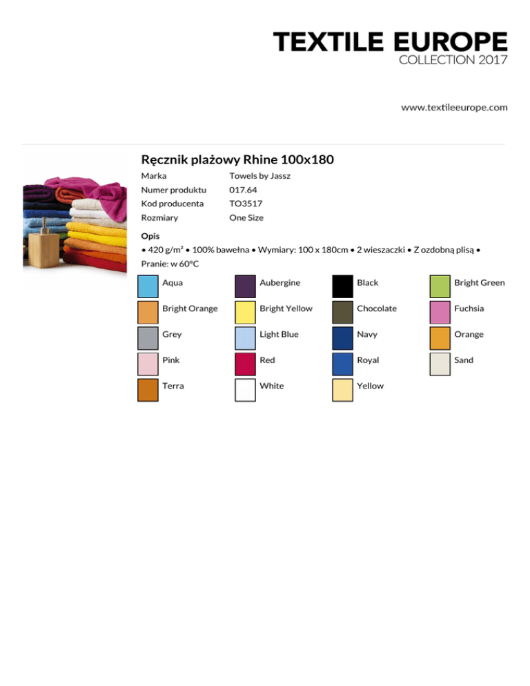 Ręcznik plażowy Rhine 100x180 Marka Towels by Jassz Numer produktu 017.64 Kod producenta TO3517 Rozmiary One Size Opis • 420 g/m² • 100% bawełna • Wymiary: 100 x 180cm • 2 wieszaczki • Z ozdobną plisą • Pranie: w 60°C Aqua Aubergine Black Bright Green Bright Orange Bright Yellow Chocolate Fuchsia Grey Light Blue Navy Orange Pink Red Royal Sand Terra White Yellow