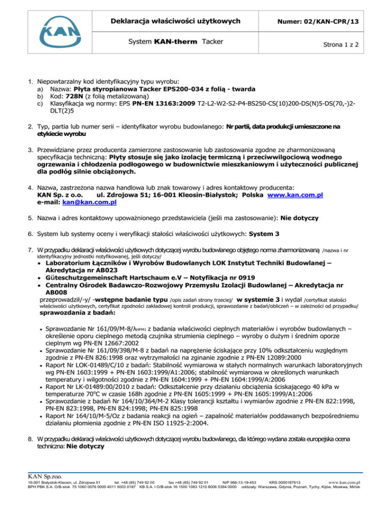 Deklaracja właściwości użytkowych Numer: 02/KAN-CPR/13 System KAN-therm Tacker Strona 1 z 2 1. Niepowtarzalny kod identyfikacyjny typu wyrobu: a) Nazwa: Płyta styropianowa Tacker EPS200-034 z folią - twarda b) Kod: 728N (z folią metalizowaną) c) Klasyfikacja wg normy: EPS PN-EN 13163:2009 T2-L2-W2-S2-P4-BS250-CS(10)200-DS(N)5-DS(70,-)2DLT(2)5 2. Typ, partia lub numer serii – identyfikator wyrobu budowlanego: Nr partii, data produkcji umieszczone na etykiecie wyrobu 3. Przewidziane przez producenta zamierzone zastosowanie lub zastosowania zgodne ze zharmonizowaną specyfikacja techniczną: Płyty stosuje się jako izolację termiczną i przeciwwilgociową wodnego ogrzewania i chłodzenia podłogowego w budownictwie mieszkaniowym i użyteczności publicznej dla podłóg silnie obciążonych. 4. Nazwa, zastrzeżona nazwa handlowa lub znak towarowy i adres kontaktowy producenta: KAN Sp. z o.o. ul. Zdrojowa 51; 16-001 Kleosin-Białystok; Polska www.kan.com.pl e-mail: [email protected] 5. Nazwa i adres kontaktowy upoważnionego przedstawiciela (jeśli ma zastosowanie): Nie dotyczy 6. System lub systemy oceny i weryfikacji stałości właściwości użytkowych: System 3 7. W przypadku deklaracji właściwości użytkowych dotyczącej wyrobu budowlanego objętego norma zharmonizowaną /nazwa i nr identyfikacyjny jednostki notyfikowanej, jeśli dotyczy/ Laboratorium Łączników i Wyrobów Budowlanych LOK Instytut Techniki Budowlanej – Akredytacja nr AB023 Güteschutzgemeinschaft Hartschaum e.V – Notyfikacja nr 0919 Centralny Ośrodek Badawczo-Rozwojowy Przemysłu Izolacji Budowlanej – Akredytacja nr AB008 przeprowadził/-y/ -wstępne badanie typu /opis zadań strony trzeciej/ w systemie 3 i wydał /certyfikat stałości właściwości użytkowych, certyfikat zgodności zakładowej kontroli produkcji, sprawozdanie z badań/obliczeń – w zależności od przypadku/ sprawozdania z badań: Sprawozdanie Nr 161/09/M-8/λHFM1 z badania właściwości cieplnych materiałów i wyrobów budowlanych – określenie oporu cieplnego metodą czujnika strumienia cieplnego – wyroby o dużym i średnim oporze cieplnym wg PN-EN 12667:2002 Sprawozdanie Nr 161/09/398/M-8 z badań na naprężenie ściskające przy 10% odkształceniu względnym zgodnie z PN-EN 826:1998 oraz wytrzymałości na zginanie zgodnie z PN-EN 12089:2000 Raport Nr LOK-01489/C/10 z badań: Stabilność wymiarowa w stałych normalnych warunkach laboratoryjnych wg PN-EN 1603:1999 + PN-EN 1603:1999/A1:2006; stabilność wymiarowa w określonych warunkach temperatury i wilgotności zgodnie z PN-EN 1604:1999 + PN-EN 1604:1999/A:2006 Raport Nr LK-01489:00/2010 z badań: Odkształcenie przy działaniu obciążenia ściskającego 40 kPa w temperaturze 70oC w czasie 168h zgodnie z PN-EN 1605:1999 + PN-EN 1605:1999/A1:2006 Sprawozdanie z badań Nr 164/10/364/M-2 Klasy tolerancji kształtu i wymiarów zgodnie z PN-EN 822:1998, PN-EN 823:1998, PN-EN 824:1998; PN-EN 825:1998 Raport Nr 164/10/M-5/Oz z badania reakcji na ogień – zapalność materiałów poddawanych bezpośredniemu działaniu płomienia zgodnie z PN-EN ISO 11925-2:2004. 8. W przypadku deklaracji właściwości użytkowych dotyczącej wyrobu budowlanego, dla którego wydana została europejska ocena techniczna: Nie dotyczy KAN Sp.zo.o. 16-001 Białystok-Kleosin, ul. Zdrojowa 51 tel. +48 (85) 749 92 00 fax +48 (85) 749 92 01 NIP 966-13-19-453 KRS 0000187613 www.kan.com.pl BPH PBK S.A. O/B-stok 75 1060 0076 0000 4011 5003 0187 KB S.A. I O/B-stok 16 1500 1083 1210 8006 5384 0000 oddziały: Warszawa, Gdynia, Poznań, Tychy, Kijów, Moskwa, Mińsk Deklaracja właściwości użytkowych Numer: 02/KAN-CPR/13 System KAN-therm Tacker Strona 2 z 2 9. Deklarowane właściwości użytkowe: Zasadnicze charakterystyki Właściwości użytkowe Zharmonizowana specyfikacja techniczna 1. Klasa reakcji na ogień 2. Współczynnik przewodzenia ciepła 3. Poziomy naprężenia ściskającego przy 10% odkształceniu 4. Wytrzymałość na zginanie 5. Stabilność wymiarowa w stałych normalnych warunkach laboratoryjnych 6. Stabilność wymiarowa w określonych warunkach temperaturowych i wilgotnościowych 7. Odkształcenie w określonych warunkach obciążenia ściskającego i temperatury E Co najwyżej 0,034 W/mK Co najmniej 100 kPa (CS(10)200 PN-EN 13163:2009 8. Długość 9. Szerokość 10. Prostokątność 11. Płaskość 12. Grubość 13. Opór cieplny: Grubość 30 mm 10. Co najmniej 250 kPa (klasa BS250) ±0,5% (klasa DS(N)5) Wymagania – 2% w warunkach: 48 h oraz 70°C Klasa (DS(70,-)2) Co najwyżej 5% w warunkach: Obciążenie – 40 kPa; Temp. – (70±1)°C; Czas – (168±1) h Klasa DLT(2)5 ±2 mm (klasa L2) ±2 mm (klasa W2) ±2 mm/1000 mm (klasa S2) 5 mm (klasa P4) ±1 mm (klasa T2) 0,85 m2K/W Właściwości użytkowe wyrobu zidentyfikowanego w pkt. 1 i 2 są zgodne z właściwościami użytkowymi deklarowanymi w pkt 9. Niniejsza deklaracja właściwości użytkowych wydana zostaje na wyłączną odpowiedzialność producenta określonego w pkt 4. W imieniu producenta podpisał: Kleosin – 01.07.2013 r. (miejsce - data wydania) Janusz Żukowski – Kierownik Działu Kontroli Jakości ......................................... (podpis) KAN Sp.zo.o. 16-001 Białystok-Kleosin, ul. Zdrojowa 51 tel. +48 (85) 749 92 00 fax +48 (85) 749 92 01 NIP 966-13-19-453 KRS 0000187613 www.kan.com.pl BPH PBK S.A. O/B-stok 75 1060 0076 0000 4011 5003 0187 KB S.A. I O/B-stok 16 1500 1083 1210 8006 5384 0000 oddziały: Warszawa, Gdynia, Poznań, Tychy, Kijów, Moskwa, Mińsk