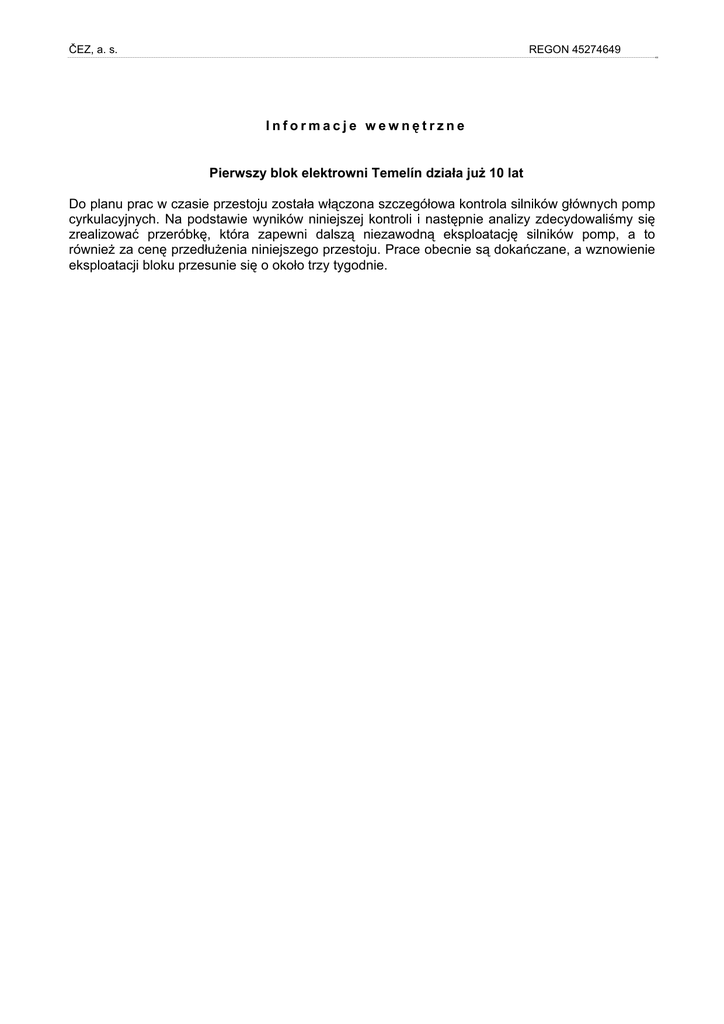 ČEZ, a. s. REGON 45274649 Informacje wewnętrzne Pierwszy blok elektrowni Temelín działa już 10 lat Do planu prac w czasie przestoju została włączona szczegółowa kontrola silników głównych pomp cyrkulacyjnych. Na podstawie wyników niniejszej kontroli i następnie analizy zdecydowaliśmy się zrealizować przeróbkę, która zapewni dalszą niezawodną eksploatację silników pomp, a to również za cenę przedłużenia niniejszego przestoju. Prace obecnie są dokańczane, a wznowienie eksploatacji bloku przesunie się o około trzy tygodnie.