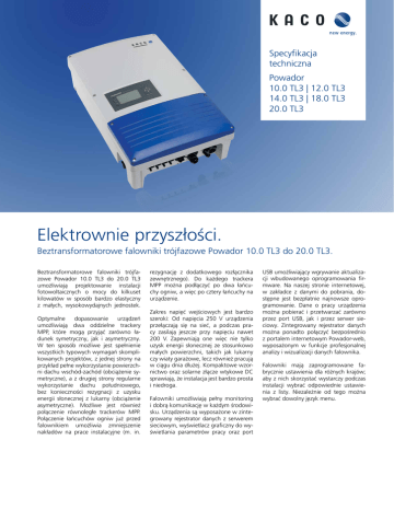 Specyfikacja techniczna Powador 10.0 TL3 | 12.0 TL3 14.0 TL3 | 18.0 TL3 20.0 TL3 Elektrownie przyszłości. Beztransformatorowe falowniki trójfazowe Powador 10.0 TL3 do 20.0 TL3. Beztransformatorowe falowniki trójfazowe Powador 10.0 TL3 do 20.0 TL3 umożliwiają projektowanie instalacji fotowoltaicznych o mocy do kilkuset kilowatów w sposób bardzo elastyczny z małych, wysokowydajnych jednostek. Optymalne dopasowanie urządzeń umożliwiają dwa oddzielne trackery MPP, które mogą przyjąć zarówno ładunek symetryczny, jak i asymetryczny. W ten sposób możliwe jest spełnienie wszystkich typowych wymagań skomplikowanych projektów, z jednej strony na przykład pełne wykorzystanie powierzchni dachu wschód-zachód (obciążenie symetryczne), a z drugiej strony regularne wykorzystanie dachu południowego, bez konieczności rezygnacji z uzysku energii słonecznej z lukarny (obciążenie asymetryczne). Możliwe jest również połączenie równoległe trackerów MPP. Połączenie łańcuchów ogniw już przed falownikiem umożliwia zmniejszenie nakładów na prace instalacyjne (m. in. rezygnację z dodatkowego rozłącznika zewnętrznego). Do każdego trackera MPP można podłączyć po dwa łańcuchy ogniw, a więc po cztery łańcuchy na urządzenie. Zakres napięć wejściowych jest bardzo szeroki: Od napięcia 250 V urządzenia przełączają się na sieć, a podczas pracy zasilają jeszcze przy napięciu nawet 200 V. Zapewniają one więc nie tylko uzysk energii słonecznej ze stosunkowo małych powierzchni, takich jak lukarny czy wiaty garażowe, lecz również pracują w ciągu dnia dłużej. Kompaktowe wzornictwo oraz solarne złącze wtykowe DC sprawiają, że instalacja jest bardzo prosta i niedroga. Falowniki umożliwiają pełny monitoring i dobrą komunikację w każdym środowisku. Urządzenia są wyposażone w zintegrowany rejestrator danych z serwerem sieciowym, wyświetlacz graficzny do wyświetlania parametrów pracy oraz port Geleceğin enerji santralleri. 10.0 TL3 ila 20.0 TL3 Powador trafosuz üç fazlı eviriciler. 10.0 TL3 ila 20.0 TL3 Powador trafosuz üç dört dizi ba USB umożliwiający wgrywanie aktualizacji wbudowanego oprogramowania firmware. Na naszej stronie internetowej, w zakładce z danymi do pobrania, dostępne jest bezpłatnie najnowsze oprogramowanie. Dane o pracy urządzenia można pobierać i przetwarzać zarówno przez port USB, jak i przez serwer sieciowy. Zintegrowany rejestrator danych można ponadto połączyć bezpośrednio z portalem internetowym Powador-web, wyposażonym w funkcje profesjonalnej analizy i wizualizacji danych falownika. Falowniki mają zaprogramowane fabrycznie ustawienia dla różnych krajów; aby z nich skorzystać wystarczy podczas instalacji wybrać odpowiednie ustawienia z listy. Niezależnie od tego można wybrać dowolny język menu. Dane techniczne Powador 10.0 TL3 | 12.0 TL3 | 14.0 TL3 | 18.0 TL3 | 20.0 TL3 10.0 TL3 12.0 TL3 14.0 TL3 18.0 TL3 20.0 TL3 Zakres modułów śledzenia MPP 200 V ... 800 V 1) 200 V ... 800 V 2) 200 V ... 800 V 2) 200 V ... 800 V 3) 200 V ... 800 V 4) Napięcie startowe 250 V 250 V 250 V 250 V 250 V Napięcie stanu jałowego 1000 V 1000 V 1000 V 1000 V 1000 V Prąd wejściowy maks. 2 x 11,0 A 2 x 18,6 A 2 x 18,6 A 2 x 18,6 A 2 x 18,6 A Liczba trackerów MPP 2 2 2 2 2 14,9 kW 14,9 kW Dane elektryczne Parametry wejściowe Moc maks. / tracker 8,8 kW 10,2 kW 12,8 kW Liczba łańcuchów dla każdego trackera MPP 2x2 2x2 2x2 2x2 2x2 Moc znamionowa (przy napięciu 230 V) 9000 VA 10 000 VA 12 500 VA 15 000 VA 17 000 VA Napięcie sieciowe 400 V / 230 V (3 / N / PE) 400 V / 230 V (3 / N / PE) 400 V / 230 V (3 / N / PE) 400 V / 230 V (3 / N / PE) 400 V / 230 V (3 / N / PE) Prąd znamionowy 3 x 13,0 A 3 x 14,5 A 3 x 18,1 A 3 x 21,8 A 3 x 24,6 A Częstotliwość znamionowa 50 Hz 50 Hz 50 Hz 50 Hz 50 Hz Cos fi 0,80 indukcyjna ... 0,80 pojemnościowa 0,80 indukcyjna ... 0,80 pojemnościowa 0,80 indukcyjna ... 0,80 pojemnościowa 0,80 indukcyjna ... 0,80 pojemnościowa 0,80 indukcyjna ... 0,80 pojemnościowa Liczba faz zasilających 3 3 3 3 3 97,9% 98,0% 98,0% 98,0% 97,9% 97,7% 97,6% 1,5 W 1,5 W Parametry wyjściowe Ogólne dane elektryczne Współczynnik sprawności maks. Europejski współczynnik sprawności 97,1% 97,5% 97,6% Pobór mocy w trybie nocnym 1,5 W 1,5 W 1,5 W Konfiguracja obwodu bez transformatora bez transformatora bez transformatora bez transformatora bez transformatora Certyfikacje Przegląd: patrz strona główna / do pobrania Pprzegląd: patrz strona główna / do pobrania Przegląd: patrz strona główna / do pobrania Pzegląd: patrz strona główna / do pobrania Przegląd: patrz strona główna / do pobrania Wyświetlacz Wyświetlacz graficzny + diody LED Wyświetlacz graficzny + diody LED Wyświetlacz graficzny + diody LED Wyświetlacz graficzny + diody LED Wyświetlacz graficzny + diody LED Elementy obsługi Nawigacja 4-kierunkowa + 2 przyciski Nawigacja 4-kierunkowa + 2 przyciski Nawigacja 4-kierunkowa + 2 przyciski Nawigacja 4-kierunkowa + 2 przyciski Nawigacja 4-kierunkowa + 2 przyciski Porty Ethernet, USB, RS485, wyjście S0, wejście cyfrowe „Falownik wył.” Ethernet, USB, RS485, wyjście S0, wejście cyfrowe „Falownik wył.” Ethernet, USB, RS485, wyjście S0, wejście cyfrowe „Falownik wył.” Ethernet, USB, RS485, wyjście S0, wejście cyfrowe „Falownik wył.” Ethernet, USB, RS485, wyjście S0, wejście cyfrowe „Falownik wył.” Przekaźnik sygnału błędu zestyk bezpotencjałowy maks. 230 V / 1 A zestyk bezpotencjałowy maks. 230 V / 1 A zestyk bezpotencjałowy maks. 230 V / 1 A zestyk bezpotencjałowy maks. 230 V / 1 A zestyk bezpotencjałowy maks. 230 V / 1 A Złącza DC: Wtyk solarny, AC: przepust kablowy M40 i zacisk (przekrój maks. 16 mm2) DC: Wtyk solarny, AC: przepust kablowy M40 i zacisk (przekrój maks. 16 mm2) DC: Wtyk solarny, AC: przepust kablowy M40 i zacisk (przekrój maks. 16 mm2) DC: Wtyk solarny, AC: przepust kablowy M40 i zacisk (prz