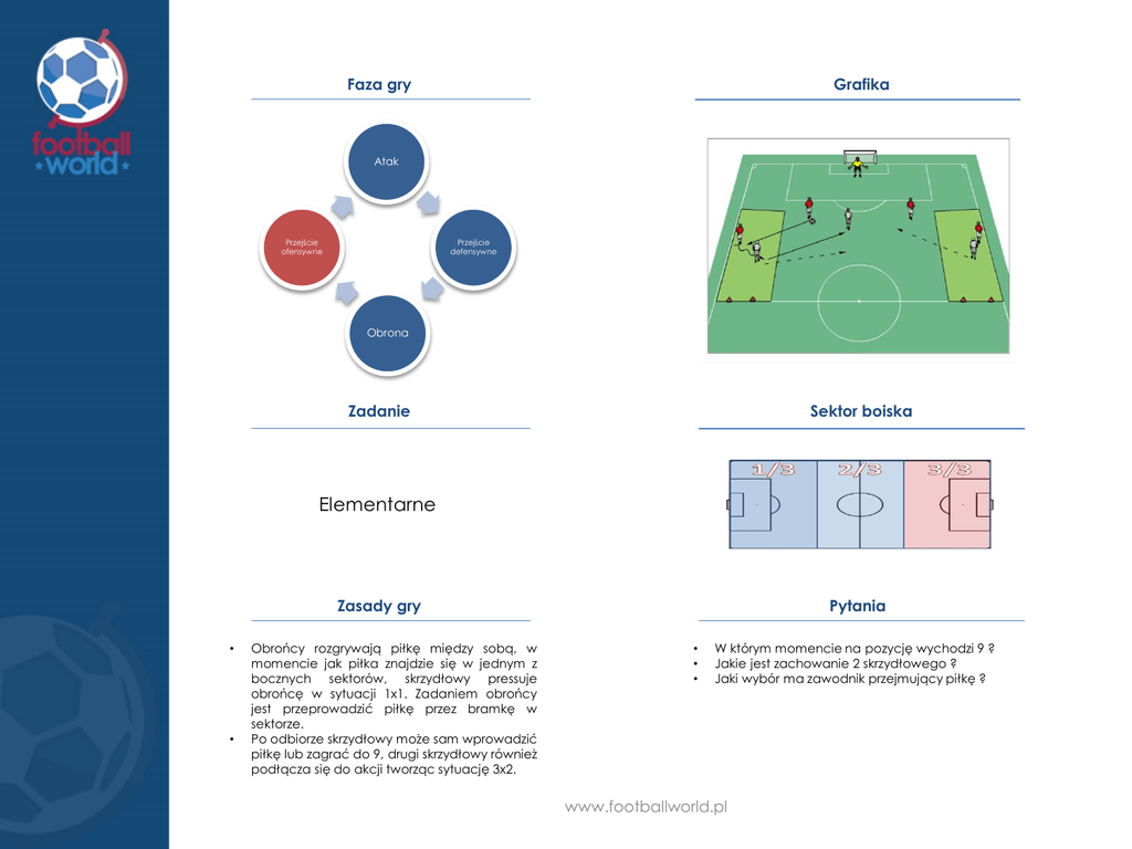 Faza gry Grafika Atak Przejście ofensywne Przejście defensywne Obrona Zadanie Sektor boiska Elementarne Zasady gry • • Obrońcy rozgrywają piłkę między sobą, w momencie jak piłka znajdzie się w jednym z bocznych sektorów, skrzydłowy pressuje obrońcę w sytuacji 1x1. Zadaniem obrońcy jest przeprowadzić piłkę przez bramkę w sektorze. Po odbiorze skrzydłowy może sam wprowadzić piłkę lub zagrać do 9, drugi skrzydłowy również podłącza się do akcji tworząc sytuację 3x2. Pytania • • • W którym momencie na pozycję wychodzi 9 ? Jakie jest zachowanie 2 skrzydłowego ? Jaki wybór ma zawodnik przejmujący piłkę ? www.footballworld.pl