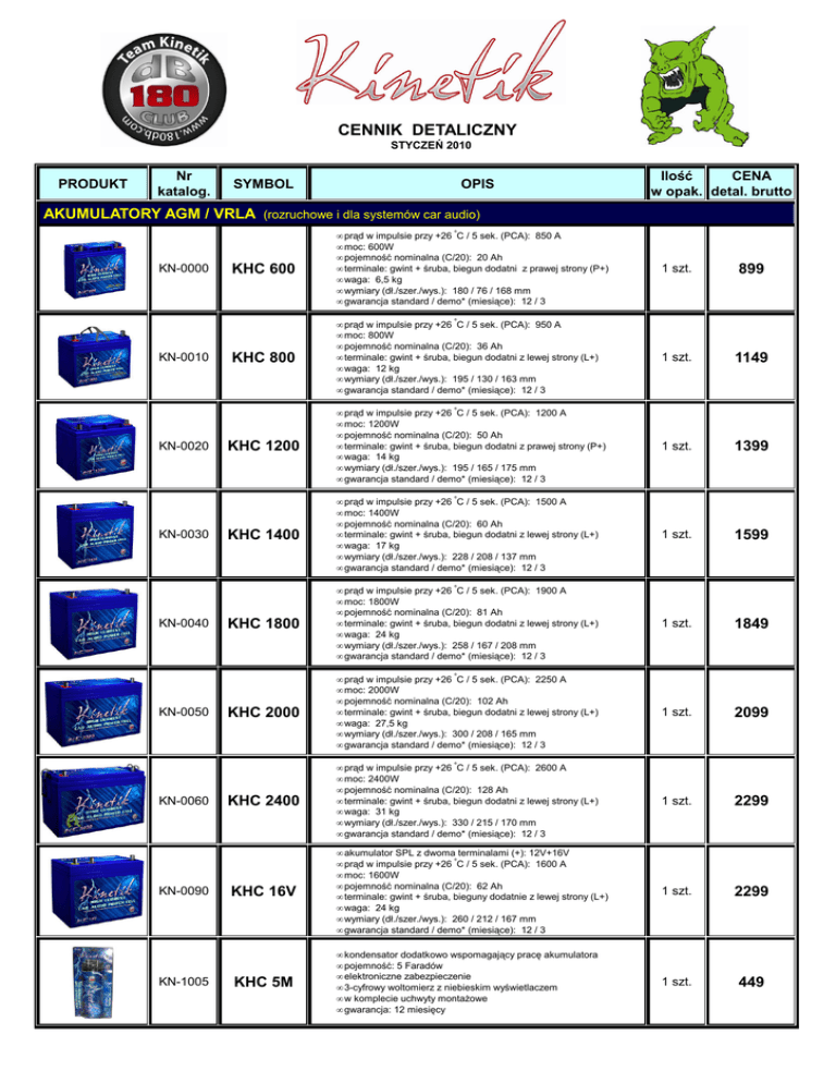 CENNIK DETALICZNY STYCZEŃ 2010 PRODUKT Nr katalog. SYMBOL OPIS Ilość CENA w opak. detal. brutto AKUMULATORY AGM / VRLA (rozruchowe i dla systemów car audio) KN-0000 KN-0010 KN-0020 KN-0030 KN-0040 KN-0050 KN-0060 KN-0090 KN-1005 KHC 600 • • • • • • • prąd w impulsie przy +26 C / 5 sek. (PCA): 850 A moc: 600W pojemność nominalna (C/20): 20 Ah terminale: gwint + śruba, biegun dodatni z prawej strony (P+) waga: 6,5 kg wymiary (dł./szer./wys.): 180 / 76 / 168 mm gwarancja standard / demo* (miesiące): 12 / 3 KHC 800 • • • • • • • º 1 szt. 899 prąd w impulsie przy +26 C / 5 sek. (PCA): 950 A moc: 800W pojemność nominalna (C/20): 36 Ah terminale: gwint + śruba, biegun dodatni z lewej strony (L+) waga: 12 kg wymiary (dł./szer./wys.): 195 / 130 / 163 mm gwarancja standard / demo* (miesiące): 12 / 3 1 szt. 1149 KHC 1200 • • • • • • • prąd w impulsie przy +26 ºC / 5 sek. (PCA): 1200 A moc: 1200W pojemność nominalna (C/20): 50 Ah terminale: gwint + śruba, biegun dodatni z prawej strony (P+) waga: 14 kg wymiary (dł./szer./wys.): 195 / 165 / 175 mm gwarancja standard / demo* (miesiące): 12 / 3 1 szt. 1399 KHC 1400 • • • • • • • prąd w impulsie przy +26 ºC / 5 sek. (PCA): 1500 A moc: 1400W pojemność nominalna (C/20): 60 Ah terminale: gwint + śruba, biegun dodatni z lewej strony (L+) waga: 17 kg wymiary (dł./szer./wys.): 228 / 208 / 137 mm gwarancja standard / demo* (miesiące): 12 / 3 1 szt. 1599 KHC 1800 • • • • • • • prąd w impulsie przy +26 ºC / 5 sek. (PCA): 1900 A moc: 1800W pojemność nominalna (C/20): 81 Ah terminale: gwint + śruba, biegun dodatni z lewej strony (L+) waga: 24 kg wymiary (dł./szer./wys.): 258 / 167 / 208 mm gwarancja standard / demo* (miesiące): 12 / 3 1 szt. 1849 KHC 2000 • • • • • • • prąd w impulsie przy +26 ºC / 5 sek. (PCA): 2250 A moc: 2000W pojemność nominalna (C/20): 102 Ah terminale: gwint + śruba, biegun dodatni z lewej strony (L+) waga: 27,5 kg wymiary (dł./szer./wys.): 300 / 208 / 165 mm gwarancja standard / demo* (miesiące): 12 / 3 1 szt. 2099 KHC 2400 • • • • • • • prąd w impulsie przy +26 ºC / 5 sek. (PCA): 2600 A moc: 2400W pojemność nominalna (C/20): 128 Ah terminale: gwint + śruba, biegun dodatni z lewej strony (L+) waga: 31 kg wymiary (dł./szer./wys.): 330 / 215 / 170 mm gwarancja standard / demo* (miesiące): 12 / 3 1 szt. 2299 KHC 16V • • • • • • • • akumulator SPL z dwoma terminalami (+): 12V+16V º prąd w impulsie przy +26 C / 5 sek. (PCA): 1600 A moc: 1600W pojemność nominalna (C/20): 62 Ah terminale: gwint + śruba, bieguny dodatnie z lewej strony (L+) waga: 24 kg wymiary (dł./szer./wys.): 260 / 212 / 167 mm gwarancja standard / demo* (miesiące): 12 / 3 1 szt. 2299 KHC 5M • • • • • • kondensator dodatkowo wspomagający pracę akumulatora pojemność: 5 Faradów elektroniczne zabezpieczenie 3-cyfrowy woltomierz z niebieskim wyświetlaczem w komplecie uchwyty montaŜowe gwarancja: 12 miesięcy 1 szt. 449 º AKUMULATORY AGM/VRLA DLA PROFESJONALNYCH ZASTOSOWAŃ (car audio, pojazdy specjalne i terenowe, jachty, maszyny budowlane) Akumukatory Kinetik HC Power Cells to najwydajniejsze źródła energii, które bardzo często moŜna spotkać w "najgłośniejszych samochodach świata", nie rzadko osiągających juŜ poziom ciśnienia akustycznego o wartości ponad 180 dB. Dzięki bardzo niskiej rezystancji wewnętrznej (ESR) oraz duŜej gęstości elektrod, akumulatory Kinetik HC Power Cells są najpotęŜniejszymi, niezawodnymi i najbardziej godnymi zaufania samochodowymi ogniwami, jakie dzisiaj moŜna spotkać na rynku. Produkowanych w technologii AGM ogniw Kinetik, uŜywa światowa czołówka zawodników SPL, SQ oraz szerokie grono entuzjastów samochodowych systemów multimedialnych. W akumulatorach Kinetik HC Power Cell zastosowano najnowszą technologię ogniw suchych (AGM Dry Cell) z duŜą ilością ciasno upakowanych, ultra cienkich ołowianych płyt przewodzących o czystości 99,99%. Akumulatory produkowane według tej technologii są w stanie dostarczyć w bardzo krótkim czasie energii o bardzo duŜej gęstości oraz zagwarantować niespotykanie szybkie i krótkie okresy ładowania. Taka konstrukcja umoŜliwiła zbudowanie potęŜnie wydajnych ogniw o stosunkowo niewielkich gabarytach, posiadających bardzo niską rezystancje wewnętrzną w porównaniu z innymi produktami tego rodzaju. Absorpcyjna mata szklana (AGM - Absorbed Glass Mat) izoluje elektrody oraz tworzy ze swoich włókien mikro-cele utrzymujące elektrolit wewnątrz obudowy akumulatora. Dzięki temu, ogniwa te nie posiadają Ŝadnego płynu, który mógłby wyciekać i przelewać się. Akumulatory Kinetik są całkowicie szczelne i podczas normalnej eksploatacji nie gazują na zewnątrz (technologia VRLA - Valve Regulated Lead Acid). Dzięki temu są całkowicie bezobsługowe, bezpieczniejsze od innych, dzięki czemu moŜna je montować w dowolnej pozycji, nawet wewnątrz kabiny samochodu bez dodatkowej wentylacji. Unikalna technologia ogniw suchych zapewnia osiągnięcie ekstremalnie duŜego natęŜenia prądu zarówno w bardzo krótkich impulsach jak i podczas długich i ciągłych obciąŜeń w bardzo szerokim zakresie temperatur. Akumulatory Kinetik są równieŜ odporne na głębokie cykle rozładowujące (Deep Cycle). W znaczący sposób wpływa to na ich wydajność i długą Ŝywotność. Ogniwa Kinetik HC Power Cell gwarantują bardzo długi, bezobsługowy okres eksploatacji, zarówno jako podstawowe akumulatory rozruchowe jak i dodatkowe akumulatory buforowe, skutecznie wspomagające samochodowe systemy audio-video. Akumulatory te są szczególnie zalecane do zasilania najbardziej energochłonnych systemów car audio, biorących udział zawodach SQ oraz SPL. Są równieŜ niezastąpione we wszelkiego rodzaju pojazdach wyposaŜonych w urządzenia wymagające dostarczenia duŜych wartości energii, jak 