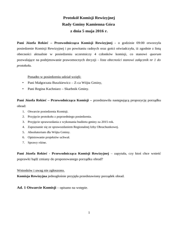 Protokół Komisji Rewizyjnej Rady Gminy Kamienna Góra z dnia 5 maja 2016 r. Pani Józefa Rekieć – Przewodnicząca Komisji Rewizyjnej - o godzinie 09:00 otworzyła posiedzenie Komisji Rewizyjnej i po powitaniu radnych oraz gości oświadczyła, iż zgodnie z listą obecności aktualnie w posiedzeniu uczestniczy 4 członków komisji, co stanowi quorum pozwalające na podejmowanie prawomocnych decyzji - lista obecności stanowi załącznik nr 1 do protokołu. Ponadto w posiedzeniu udział wzięli: • Pani Małgorzata Buszkiewicz – Z-ca Wójta Gminy, • Pani Regina Kachniarz – Skarbnik Gminy. Pani Józefa Rekieć – Przewodnicząca Komisji – przedstawiła następującą propozycję porządku obrad: 1. Otwarcie posiedzenia Komisji. 2. Przyjęcie protokołu z poprzedniego posiedzenia. 3. Przyjęcie sprawozdania z wykonania budżetu gminy za 2015 rok. 4. Zapoznanie się ze sprawozdaniem Regionalnej Izby Obrachunkowej. 5. Absolutorium dla Wójta Gminy. 6. Opiniowanie projektów uchwał. 7. Sprawy różne. Pani Józefa Rekieć - Przewodnicząca Komisji Rewizyjnej – zapytała, czy ktoś chce wnieść poprawki bądź zmiany do proponowanego porządku obrad? Wniosków i uwag nie zgłoszono. Komisja Rewizyjna jednogłośnie przyjęła przedstawiony porządek obrad. Ad. 1 Otwarcie Komisji – opisano na wstępie. 1 Ad. 2 Przyjęcie protokołu z poprzedniej Komisji. Przewodnicząca Komisji zapytała, czy ktoś z członków Komisji chciałby wnieść poprawki do protokołu z poprzedniego posiedzenia. Wobec braku zgłoszonych uwag i wniosków do protokołu, Komisja jednogłośnie przyjęła protokół z posiedzenia Komisji w dniu 21 kwietnia 2016 r. Ad. 3 Sprawozdanie z wykonania budżetu gminy za 2015 rok. 1. Pani Regina Kachniarz – Skarbnik Gminy – szczegółowo przedstawiła Sprawozdanie z wykonania budżetu Gminy Kamienna Góra za 2015 roku. Objaśniła, że budżet gminy na rok 2015 został uchwalony dnia 29.12.2014 r. Uchwałą Nr III/6/14 przez Radę Gminy w wysokościach: • po stronie dochodów w kwocie 27 296 883,00 zł, • po stronie wydatków w kwocie – 27 632 883,00 zł. W toku wykonania budżet uległ on zmianie i na koniec roku budżetowego wyniósł: • po stronie dochodów –29 190 262,68 zł, • po stronie wydatków – 29 976 819,60 zł. Skarbnik Gminy – szczegółowo omówiła poszczególne działy Sprawozdania z wykonania budżetu Gminy Kamienna Góra za rok 2015, które to stanowi załącznik nr 2 do protokołu z posiedzenia komisji. Komisja Rewizyjna po zapoznaniu się z przedłożonymi dokumentami nie zgłosiła pytań, uwag co do powyższego. Pani Regina Kachniarz – Skarbnik Gminy – przedstawiła do rozpatrzenia sprawozdanie finansowe oraz informacje o stanie mienia wraz z Zarządzeniem Nr 19/2016 Wójta Gminy Kamienna Góra z dnia 25 kwietnia 2016 r. w sprawie przedstawienia sprawozdania finansowego za 2015 rok. Komisja Rewizyjna po zapoznaniu się z przedłożonymi dokumentami nie zgłosiła pytań, uwag co do powyższego. Wobec braku pytań i uwag co do przedłożonych materiałów Pani Józefa Rekieć – Przewodnicza Komisji Rewizyjnej poddała Sprawozdanie z wykonania budżetu Gminy Kamienna Góra za rok 2015 wraz z pozostałymi materiałami pod głosowanie. Komisja Rewizyjna w wyniku głosowania jednogłośnie przyjęła Sprawozdanie z wykonania budżetu Gminy Kamienna Góra za rok 2015 wraz ze sprawozdaniem finansowym oraz informacją o stanie mienia – głosowało 4 członków komisji: oddano 4 głosy „za”, głosy „przeciw„ oraz „wstrzymuję się” nie wystąpiły. 2 Ad. 4 Zapoznanie się z opinią Regionalnej Izby Obrachunkowej. Pani Regina Kachniarz – Skarbnik Gminy – przedstawiła pismo (znak sprawy OS.JG.I.0010.96.2016) wraz z załączoną Uchwałą Nr I/96/2016 z dnia 27 kwietnia 2016 r. Składu Orzekającego Regionalnej Izby Obrachunkowej we Wrocławiu w sprawie opinii o przedłożonym przez Wójta Gminy Kamienna Góra sprawozdaniu z wykonania budżetu Gminy Kamienna Góra za 2015 rok – opinia pozytywna. Komisja Rewizyjna nie zgłosiła pytań i uwag co do przedłożonych informacji. Ad. 5 Absolutorium. Po rozpatrzeniu sprawozdania finansowego, sprawozdania z wykonania budżetu gminy za 2015 rok wraz z opinią Regionalnej Izby Obrachunkowej we Wrocławiu i informacją o stanie mienia oraz wysłuchaniu ustanych wyjaśnień Skarbnika Gminy, Komisja Rewizyjna pozytywnie oceniła wykonanie budżetu gminy za rok 2015. Mając na uwadze powyższe, opracowany został wniosek Komisji Rewizyjnej o udzielenie absolutorium Wójtowi Gminy Kamienna Góra. Pani Józefa Rekieć – Przewodnicząca Komisji Rewizyjnej - przedstawiła Wniosek Komisji Rewizyjnej w sprawie udzielenia absolutorium Wójtowi Gminy Kamienna Góra z dnia 5 maja 2016 roku wraz z pozytywną Opinią z dnia 5 maja 2016 roku Komisji Rewizyjnej o wykonaniu budżetu gminy za 2015 rok. Wniosek łącznie z opinią zostały poddane pod głosowanie i jednogłośnie przyjęte - głosowało 4 członków Komisji Rewizyjnej, wystąpiło 4 głosy „za”, głosy "przeciw" oraz "wstrzymuję się" nie wystąpiły. Wniosek wraz z opinią zostały podpisane przez wszystkich członków Komisji Rewizyjnej. Komisja Rewizyjna po przegłosowaniu postanowiła wystąpić do Rady Gminy Kamienna Góra na Sesji w dniu 25 maja 201 6 r. o udzielenie absolutorium Wójtowi Gminy Kamienna Góra za 2015 rok. Ad. 6 Opiniowanie projektów uchwał – nie wystąpiło. Ad. 7 Sprawy różne. Spraw różnych nie zgłoszono. Po wyczerpaniu tematyki posiedzenia Komisja Rewizyjna nie wniosła uwag i uznała tym samym, że zakres tematyczny został przedstawiony w sposób wyczerpujący. Przewodnicząca Komisji o godz. 10:20 zamknęła posiedzenie. 3 Ustalenia końcowe: Na dzisiejszym posiedzeniu Komisja Społeczna: 1. Przyjęła protokół z poprzedniego posiedzenia 2. Opracowała i zaopiniowała wniosek absolutoryjny. Protokołowała: Agnieszka Pawłowska Przewodnicząca Komisji Społecznej /-/Józef