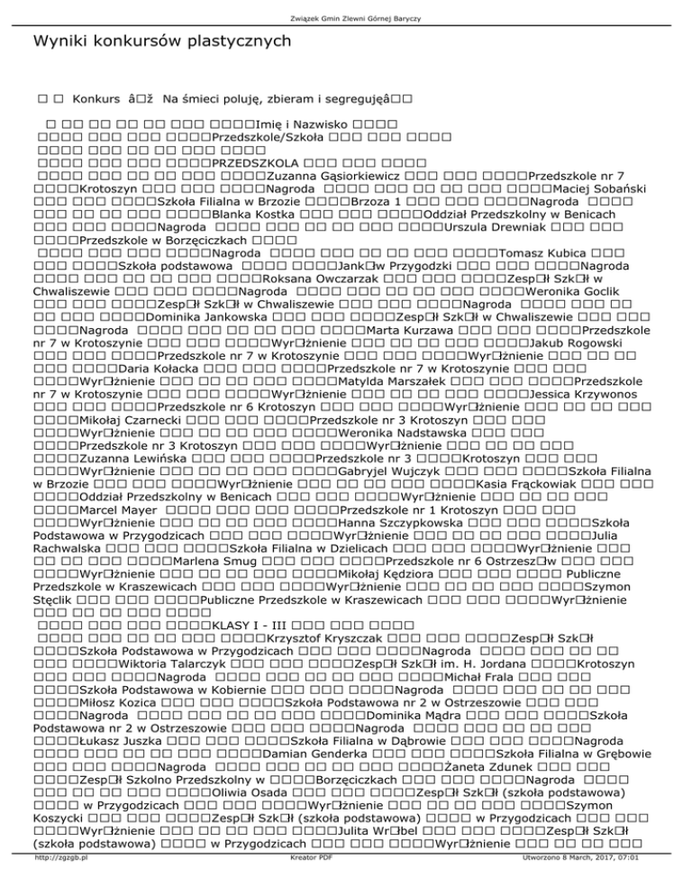 Związek Gmin Zlewni Górnej Baryczy Wyniki konkursów plastycznych Konkurs „ Na śmieci poluję, zbieram i segreguję― Imię i Nazwisko Przedszkole/Szkoła PRZEDSZKOLA Zuzanna Gąsiorkiewicz Przedszkole nr 7 Krotoszyn Nagroda Maciej Sobański Szkoła Filialna w Brzozie Brzoza 1 Nagroda Blanka Kostka Oddział Przedszkolny w Benicach Nagroda Urszula Drewniak Przedszkole w Borzęciczkach Nagroda Tomasz Kubica Szkoła podstawowa JankÃłw Przygodzki Nagroda Roksana Owczarzak ZespÃłł SzkÃłł w Chwaliszewie Nagroda Weronika Goclik ZespÃłł SzkÃłł w Chwaliszewie Nagroda Dominika Jankowska ZespÃłł SzkÃłł w Chwaliszewie Nagroda Marta Kurzawa Przedszkole nr 7 w Krotoszynie WyrÃłżnienie Jakub Rogowski Przedszkole nr 7 w Krotoszynie WyrÃłżnienie Daria Kołacka Przedszkole nr 7 w Krotoszynie WyrÃłżnienie Matylda Marszałek Przedszkole nr 7 w Krotoszynie WyrÃłżnienie Jessica Krzywonos Przedszkole nr 6 Krotoszyn WyrÃłżnienie Mikołaj Czarnecki Przedszkole nr 3 Krotoszyn WyrÃłżnienie Weronika Nadstawska Przedszkole nr 3 Krotoszyn WyrÃłżnienie Zuzanna Lewińska Przedszkole nr 3 Krotoszyn WyrÃłżnienie Gabryjel Wujczyk Szkoła Filialna w Brzozie WyrÃłżnienie Kasia Frąckowiak Oddział Przedszkolny w Benicach WyrÃłżnienie Marcel Mayer Przedszkole nr 1 Krotoszyn WyrÃłżnienie Hanna Szczypkowska Szkoła Podstawowa w Przygodzicach WyrÃłżnienie Julia Rachwalska Szkoła Filialna w Dzielicach WyrÃłżnienie Marlena Smug Przedszkole nr 6 OstrzeszÃłw WyrÃłżnienie Mikołaj Kędziora Publiczne Przedszkole w Kraszewicach WyrÃłżnienie Szymon Stęclik Publiczne Przedszkole w Kraszewicach WyrÃłżnienie KLASY I - III Krzysztof Kryszczak ZespÃłł SzkÃłł Szkoła Podstawowa w Przygodzicach Nagroda Wiktoria Talarczyk ZespÃłł SzkÃłł im. H. Jordana Krotoszyn Nagroda Michał Frala Szkoła Podstawowa w Kobiernie Nagroda Miłosz Kozica Szkoła Podstawowa nr 2 w Ostrzeszowie Nagroda Dominika Mądra Szkoła Podstawowa nr 2 w Ostrzeszowie Nagroda Łukasz Juszka Szkoła Filialna w Dąbrowie Nagroda Damian Genderka Szkoła Filialna w Grębowie Nagroda Żaneta Zdunek ZespÃłł Szkolno Przedszkolny w Borzęciczkach Nagroda Oliwia Osada ZespÃłł SzkÃłł (szkoła podstawowa) w Przygodzicach WyrÃłżnienie Szymon Koszycki ZespÃłł SzkÃłł (szkoła podstawowa) w Przygodzicach WyrÃłżnienie Julita WrÃłbel ZespÃłł SzkÃłł (szkoła podstawowa) w Przygodzicach WyrÃłżnienie http://zgzgb.pl Kreator PDF Utworzono 8 March, 2017, 07:01 Związek Gmin Zlewni Górnej Baryczy Kamil WrÃłbel Szkoła Podstawowa w Chynowej WyrÃłżnienie Piotr Biegański ZespÃłł SzkÃłł im. ks. J. Twardowskiego w Chwaliszewie WyrÃłżnienie Dominik Rychlik ZespÃłł SzkÃłł im. ks. J. Twardowskiego w Chwaliszewie WyrÃłżnienie Weronika Jankowska ZespÃłł SzkÃłł nr 1 H. Jordana Krotoszyn WyrÃłżnienie Bartosz Wachowiak Szkoła Podstawowa w Roszkach WyrÃłżnienie Julia Krupa Szkoła Podstawowa w Roszkach WyrÃłżnienie Oliwia Roszykiewicz Szkoła Podstawowa nr 2 w Ostrzeszowie WyrÃłżnienie Dominika Kubiak Szkoła Filialna w Dzielicach WyrÃłżnienie Aleksandra Gendera Szkoła Filialna w Dąbrowie WyrÃłżnienie Paulina Udzik Szkoła Filialna w Grębowie WyrÃłżnienie Hubert Młynarczyk ZespÃłł SzkÃłł w Zdunach WyrÃłżnienie Norbert Stanisławski ZespÃłł SzkÃłł w Zdunach WyrÃłżnienie Jagoda Włodarczyk ZespÃłł Szkolno – Przedszkolny Borzęciczki WyrÃłżnienie KLASY IV - VI Zuzanna Golejewska Szkoła Podstawowa im A. Mickiewicza w Pogorzeli Nagroda Martyna Surma Szkoła Podstawowa im A. Mickiewicza w Pogorzeli Nagroda Martyna Wawrzyniak ZS nr 1 im. H. Jordana Krotoszyn Nagroda Mateusz Ceglarz Szkoła Podstawowa w Kobiernie Nagroda Joanna Juskowiak ZespÃłł SzkÃłł w Zdunach Nagroda Sonia Biszczak ZespÃłł SzkÃłł w Zdunach Nagroda Julia Kowańdy Szkoła Podstawowa im A. Mickiewicza w Pogorzeli WyrÃłżnienie Milena Szych ZespÃłł SzkÃłł nr 1 im. H. Jordana Krotoszyn WyrÃłżnienie Marta Marchwiak ZespÃłł SzkÃłł nr 1 im. H. Jordana Krotoszyn WyrÃłżnienie Wiktoria Maria Wujczyk ZespÃłł SzkÃłł nr 1 im. H. Jordana Krotoszyn WyrÃłżnienie Elżbieta Witkowska Szkoła Podstawowa w Roszkach WyrÃłżnienie Hanna Lisiak Szkoła Podstawowa w Roszkach WyrÃłżnienie Ewa Kaczmarek ZespÃłł SzkÃłł w Zdunach WyrÃłżnienie Łukasz Mikołajczyk ZespÃłł SzkÃłł w Zdunach WyrÃłżnienie Marta Pruchnik Szkoła Podstawowa w Baszkowie WyrÃłżnienie    Konkurs „ MÃłj pomysł na zagospodarowanie odpadÃłw― Imię i Nazwisko Gimnazjum  Anna Ziajka Gimnazjum nr 2 Zdunowska 83 63-700 Krotoszyn Nagroda  Grzegorz Hyży Gimnazjum we WrÃłblińcu WrÃłbliniec 24 56-300 Milicz Nagroda  Lucyna Poprawa Gimnazjum im. Jana Pawła II Al. Jana Pawła II 63-430 OdolanÃłw Nagroda  Patrycja Sajnaj Gimnazjum nr 2 Zdunowska 83 63-700 Krotoszyn WyrÃłżnienie  Sylwia Grzeszczak Gimnazjum nr 2 Zdunowska 83 63-700 Krotoszyn WyrÃłżnienie  Marta Papierska Gimnazjum nr 2 Zdunowska 83 63-700 Krotoszyn WyrÃłżnienie  Sara Pawlik Gimnazjum nr 2 Zdunowska 83 63-700 Krotoszyn http://zgzgb.pl Kreator PDF Utworzono 8 March, 2017, 07:01 Związek Gmin Zlewni Górnej Baryczy WyrÃłżnienie  Jakub Chocaj Gimnazjum im. Jana Pawła II Al. Jana Pawła II 63-430 OdolanÃłw WyrÃłżnienie Serdecznie zapraszamy do odwiedzenia galerii zgzgb, w ktÃłrej można obejrzeć nagrodzone oraz wyrÃłżnione prace.  http://zgzgb.pl Kreator PDF Utworzono 8 March, 2017, 07:01
